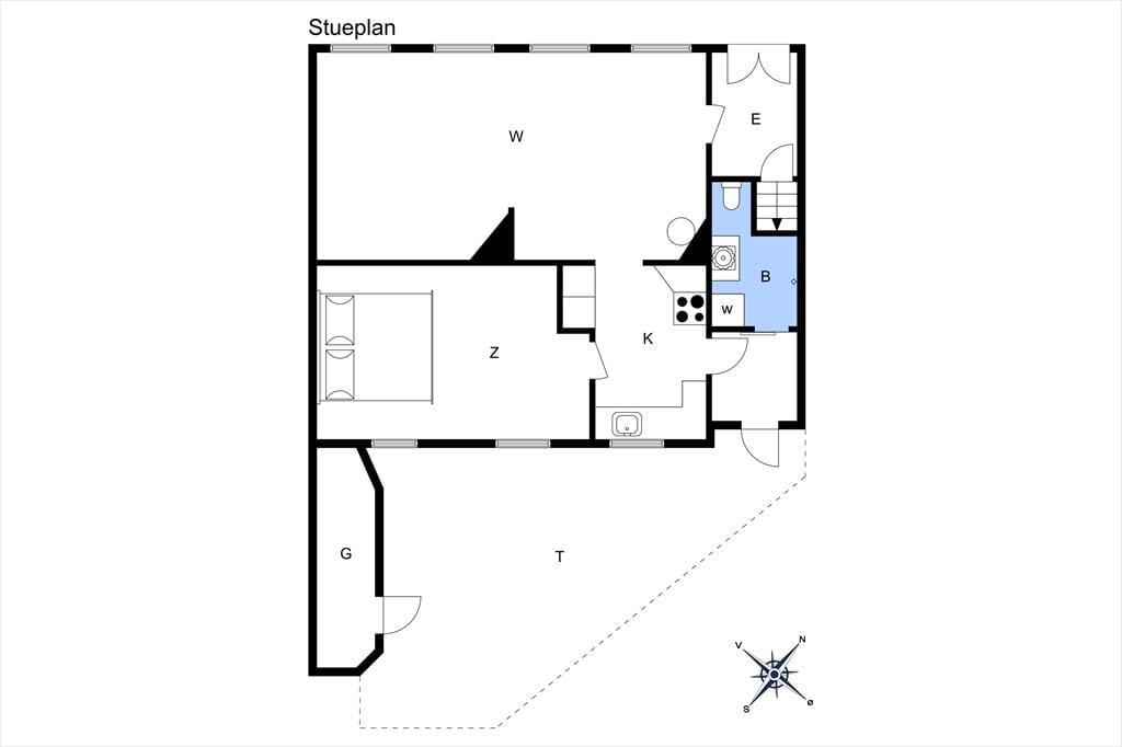 I stueetagen køkken, stue med brændeovn samt spiseafdeling. Bad med bruser. Skønt soveværelse med en dobbeltseng.