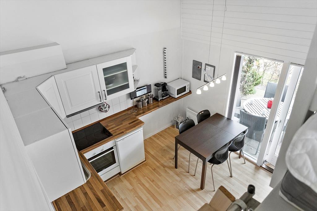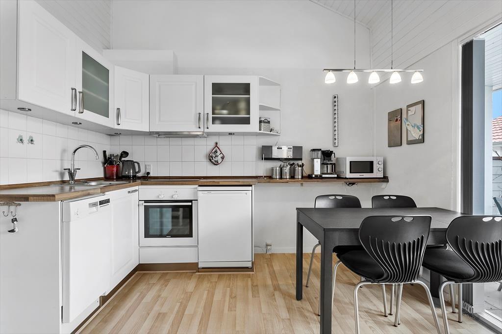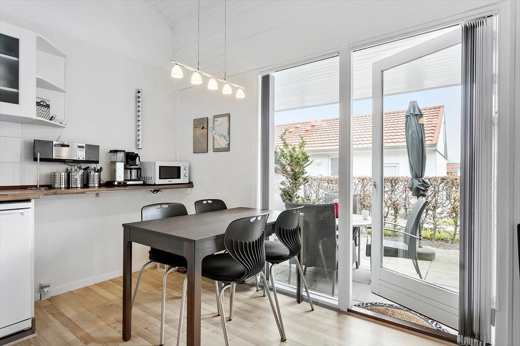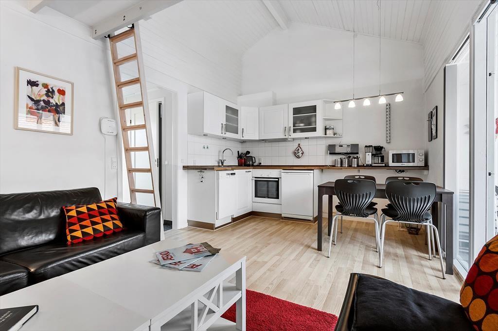 Denne attraktive ferielejlighed i stueplan har et rummeligt køkken-alrum, som gør det nemt og hyggeligt at lave mad og nyde måltiderne sammen. Køkkenet er veludstyret med alt, hvad du behøver, herunder en opvaskemaskine, så du kan bruge mere tid på at slappe af og mindre tid på opvasken. Indretningen er lys og indbydende, og her er rigelig plads til at brede sig ud, uanset om du nyder en afslappende morgen med kaffe og avisen, eller du har lyst til at tilbringe aftenen med en god film i sofaen.