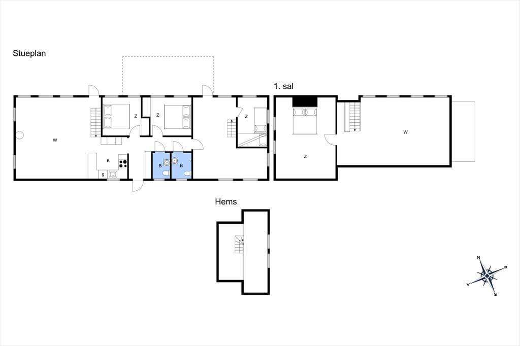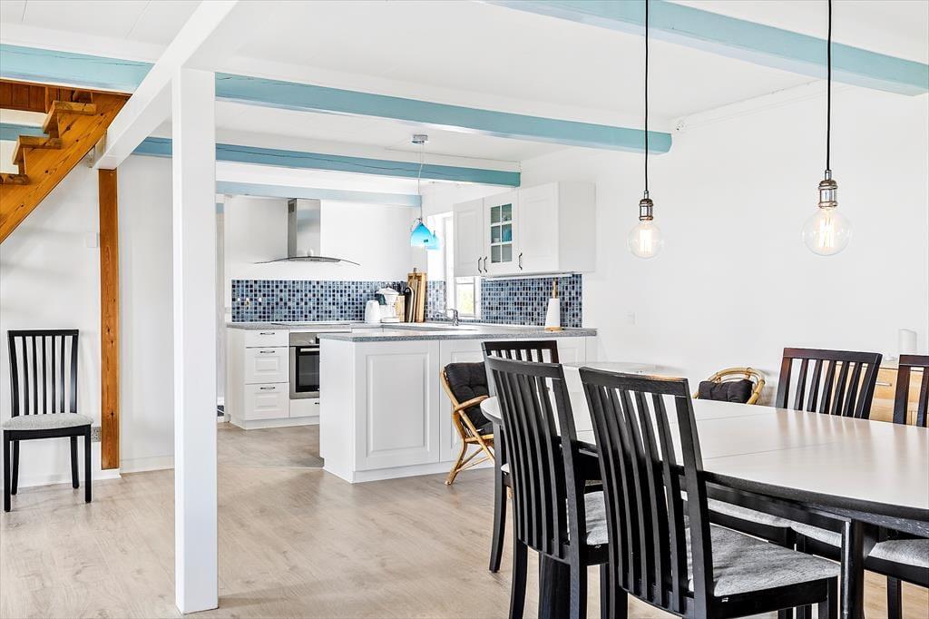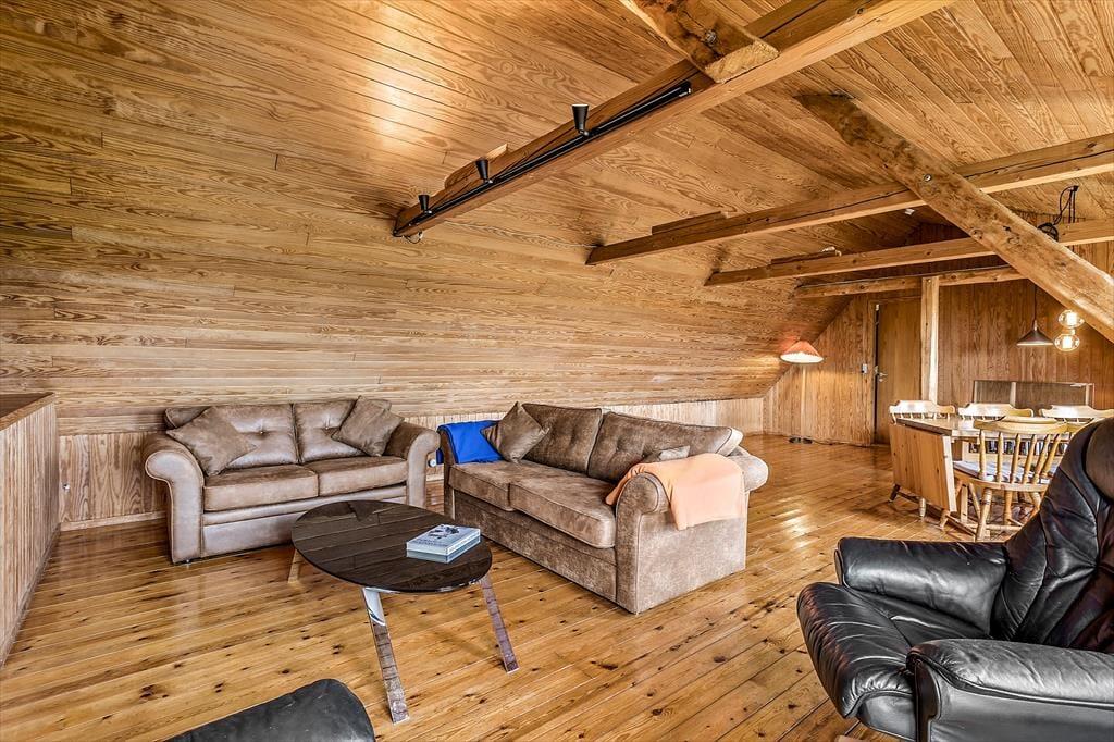 Når du træder indenfor, vil du straks blive mødt af et stort køkken-alrum, hvor den centrale brændeovn skaber en hyggelig atmosfære. Det åbne rum er indrettet med smagfulde detaljer, der forener husets historiske karakter med nutidige bekvemmeligheder. Køkkenet er udstyret med alt, hvad du behøver for at tilberede lækre måltider, mens den rummelige spiseplads inviterer til lange, afslappede middage. På 1. salen finder du en tv-stue, der imponerer med sin træbeklædning fra gulv til loft og de fine synlige bjælker, som tilføjer en ekstra dimension af hygge. Her kan du og dine nærmeste samles til filmaftener eller blot nyde en stille stund med en god bog.