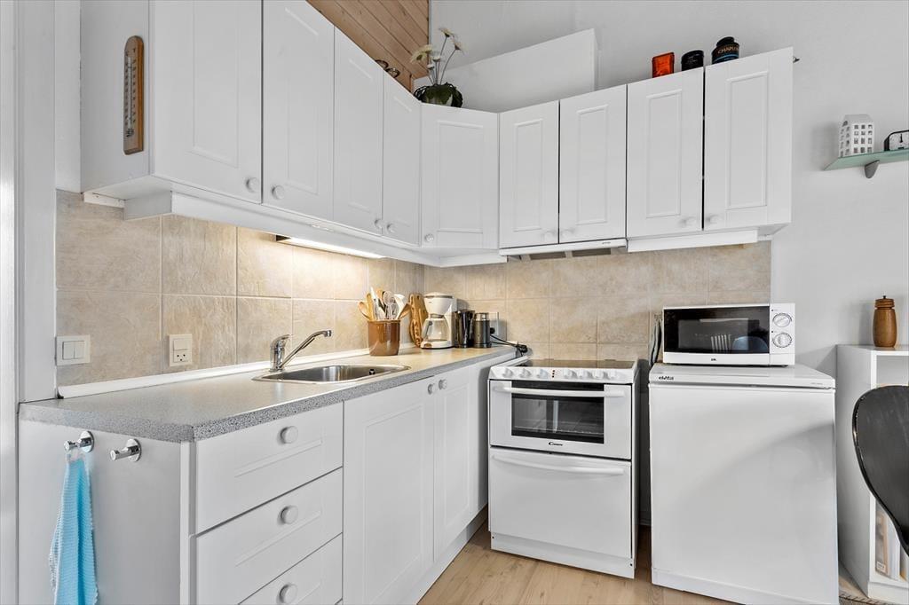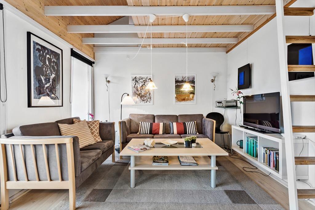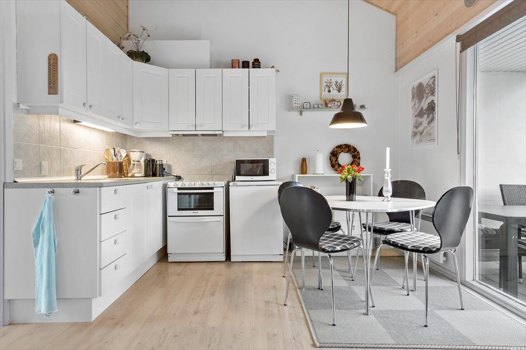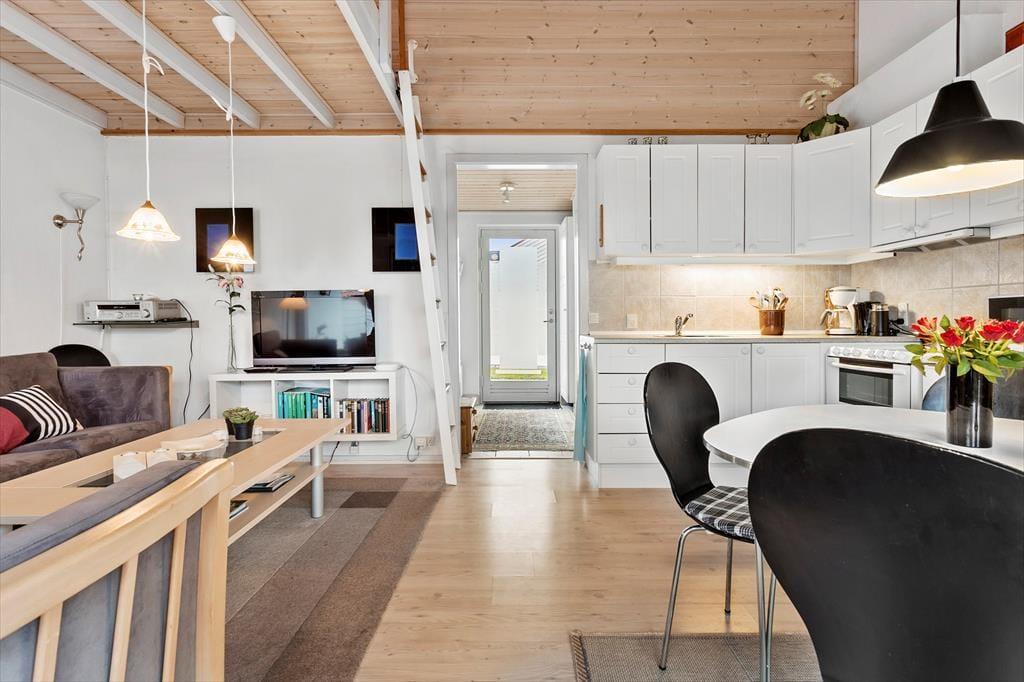 Når du træder ind i huset, vil du blive mødt af et lyst og venligt køkken-alrum, hvor du kan nyde feriens måltider ved den fine spiseplads. Alrummet er også udstyret med en tv-stue, som indbyder til hyggelige aftener med film og afslapning. Stuen har en opgang til en hems, som giver ekstra soveplads og en hyggelig atmosfære. Huset er indrettet med komfortable møbler, som skaber en hjemlig følelse, hvor du hurtigt kan finde dig til rette og nyde ferien.