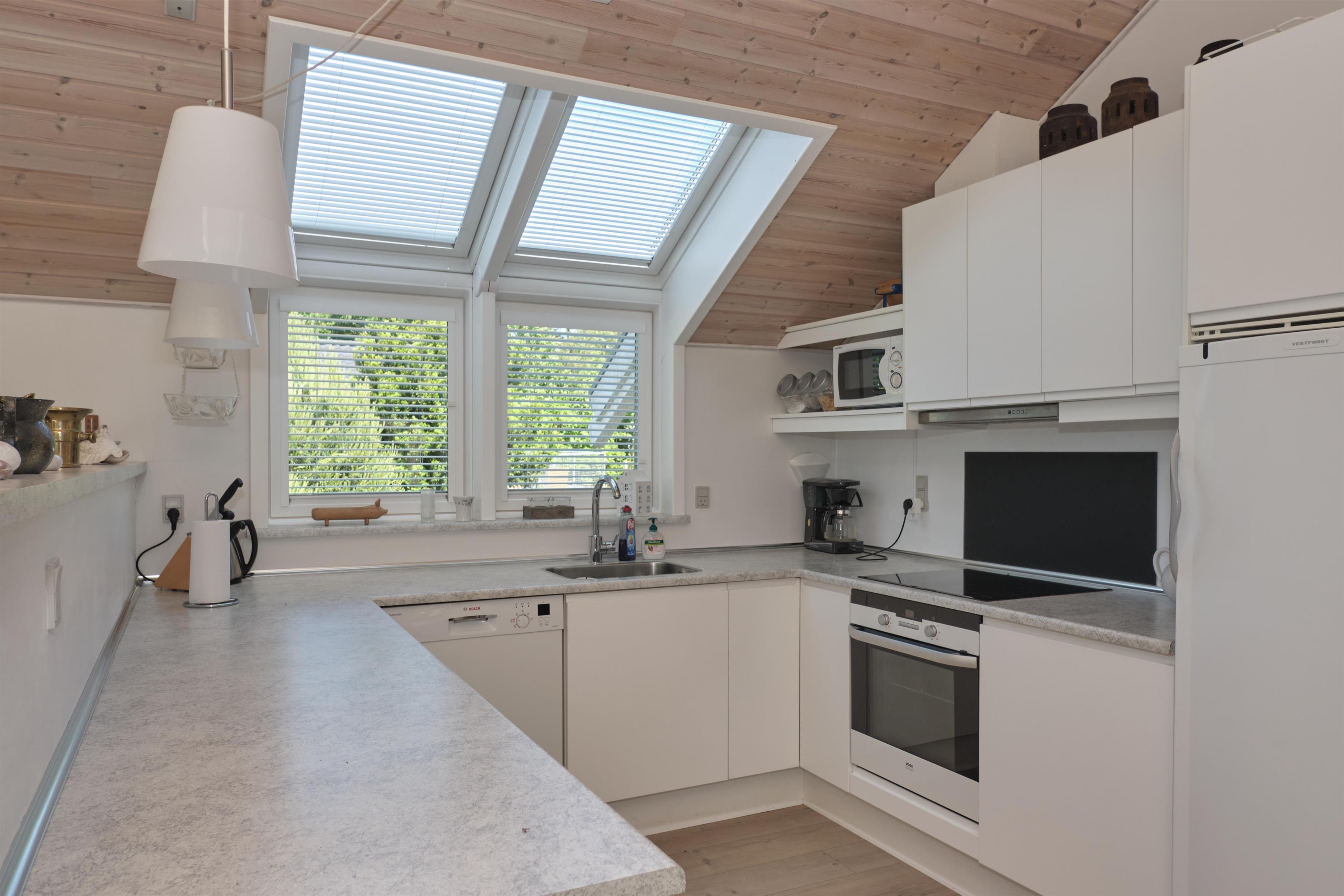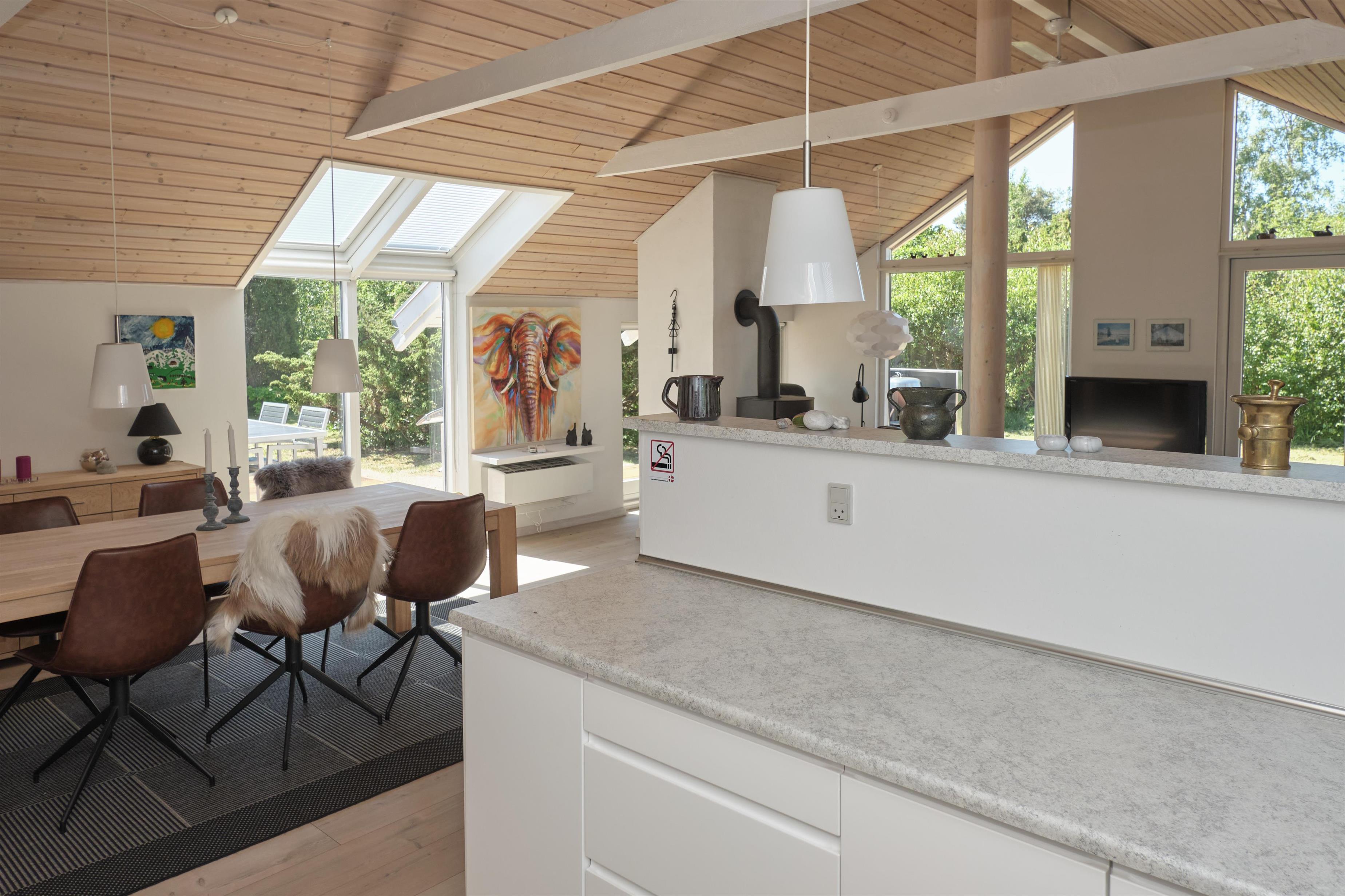 Dette rummelige og totalrenoverede hus er beliggende på velplejet naturgrund for enden af lukket vej og bare 300 meter fra den børnevenlige Øer Strand. Dejlige terrasser mod syd og vest med havemøbler, liggestole, parasol og grill. På husets sydside er desuden tilbygget en skøn udestue med lofter til kip som i resten af huset, så man kan sidde ”ude” hele året. Huset fremtræder lyst og indbydende med lofter til kip, ovenlysvinduer samt store glaspartier til kip, som virkelig lukker lyset ind. Husets hjerte er den store stue/alrum, hvor brændeovnen med muret skorsten står centralt. Her er rigelig plads til spisestue til 6 personer, TV-stue med danske (inkl. TV2) og tyske kanaler samt hyggeligt læsehjørne. I åben forbindelse med stuen finder man det veludstyrede, moderne køkken med køle-/fryseskab, keramiske kogeplader, ovn, opvaskemaskine og mikrobølgeovn. Huset råder over 1 stort soveværelse med elevations-dobbeltseng og skabsplads, 1 værelse med 2 enkeltsenge (kan samles til dobbeltseng) og 1 mindre værelse med køjeseng. Lyst og dejligt flisebadeværelse med bruseniche og gulvvarme. Stort bryggers med vask, vaskemaskine og tørretumbler. På den store, indhegnede grund kan hunden tumle frit. Internetadgang. NB. Garage indgår ikke i lejemålet.Her bor man i kort afstand til Ebeltofts hyggelige gader og gode indkøbsmuligheder og lige ud til Øer Strand, som er kendetegnet ved lavt vand, store sandbanker og et rigt fugleliv. Gode muligheder for fiskeri og vandaktiviteter samt dejlige cykel- og vandreture.