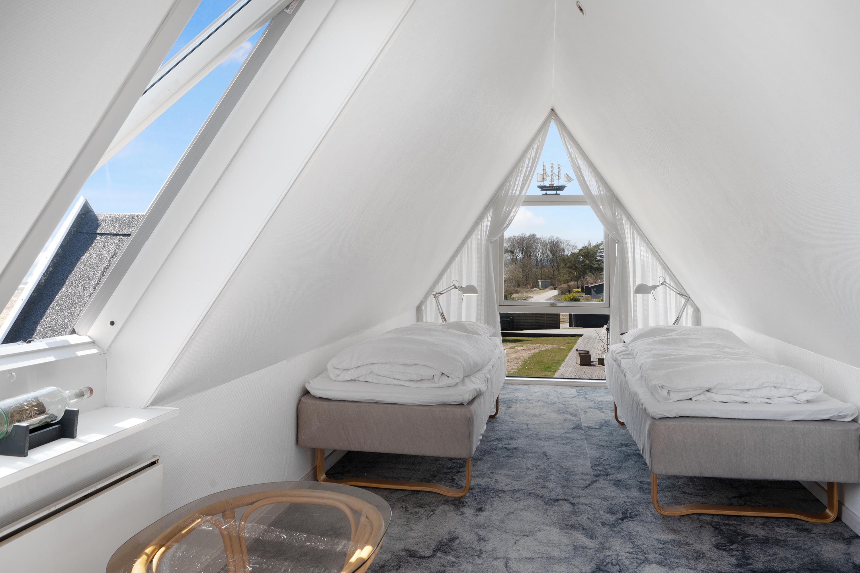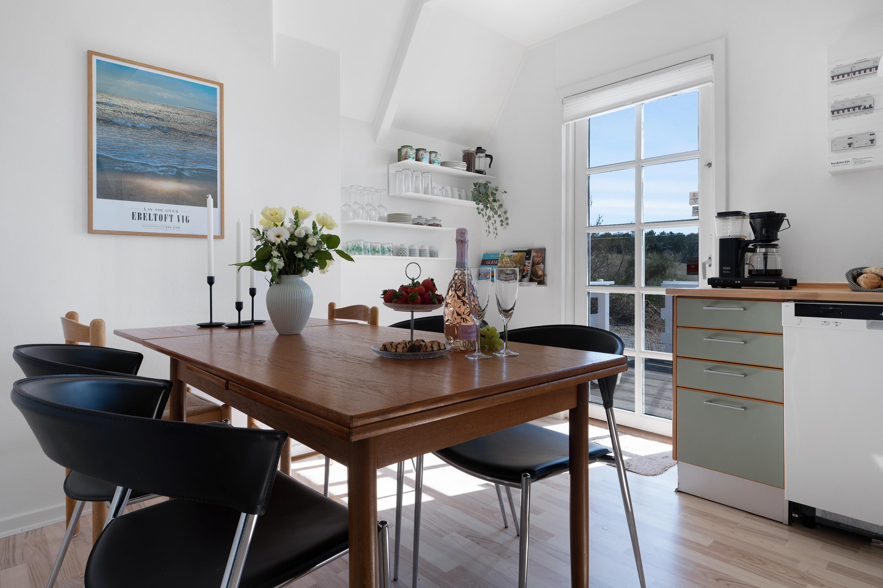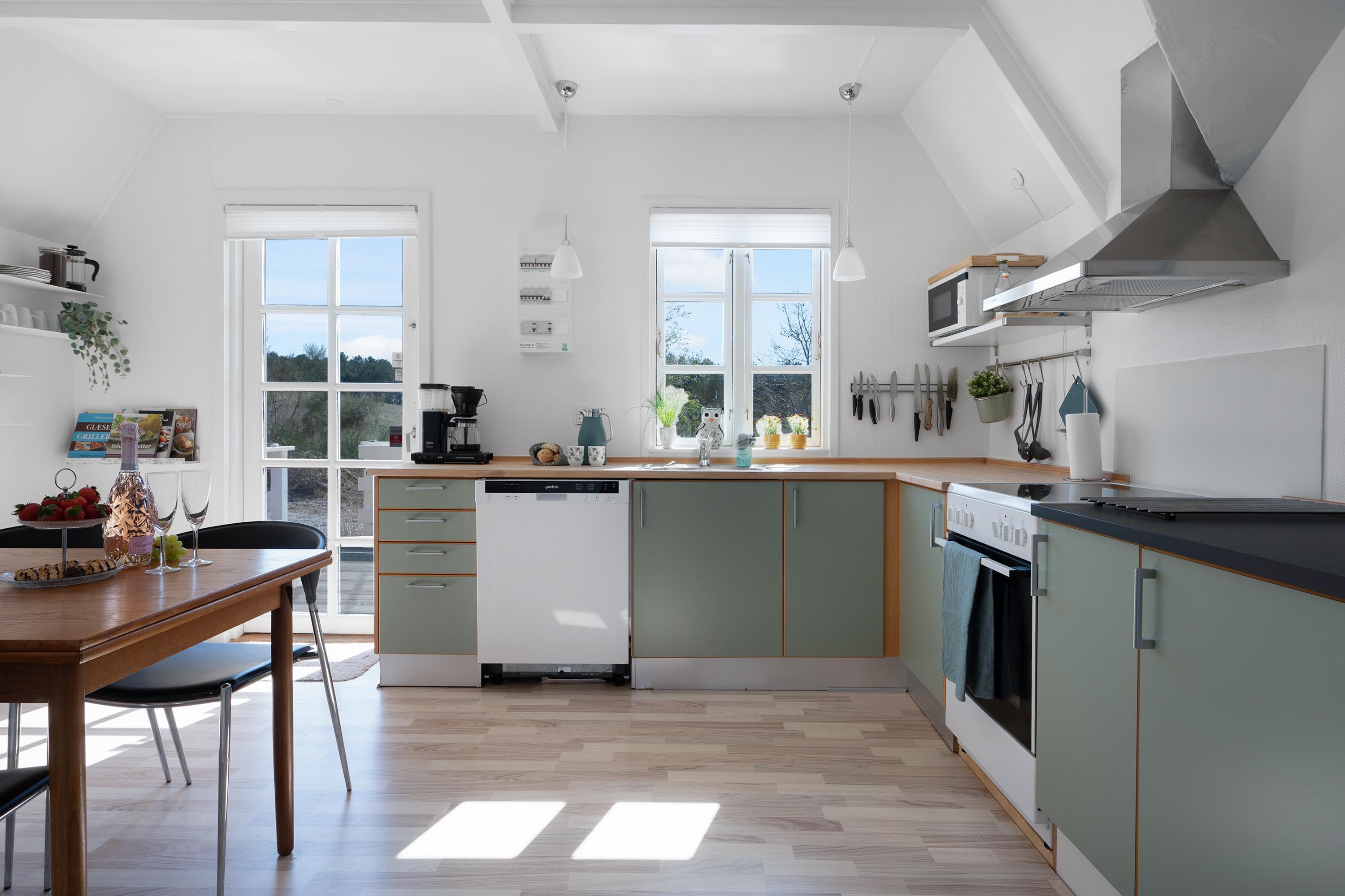 Stor, lys og velindrettet stue med udgang til terrasse. Hyggeligt sofamøblement, brændeovn, TV med danske (inkl. TV2) og tyske kanaler samt radio. Det rummelige og veludstyrede køkken med synlige loftsbjælker har god spiseplads til 6 personer, komfur med keramiske kogeplader og ovn, køleskab, opvaskemaskine og mikrobølgeovn samt udgang til stor, hævet terrasse. I stueplan er der desuden 1 rummeligt soveværelse med dobbeltseng, mens 1. sal har 2 værelser med lofter til kip, begge med 2 enkeltsenge, i alt 6 sovepladser. Nyere, lyst og godt badeværelse med bruseniche, skabsarrangement og vaskemaskine foruden et gæstetoilet, begge i stueetagen. Der er internetadgang.