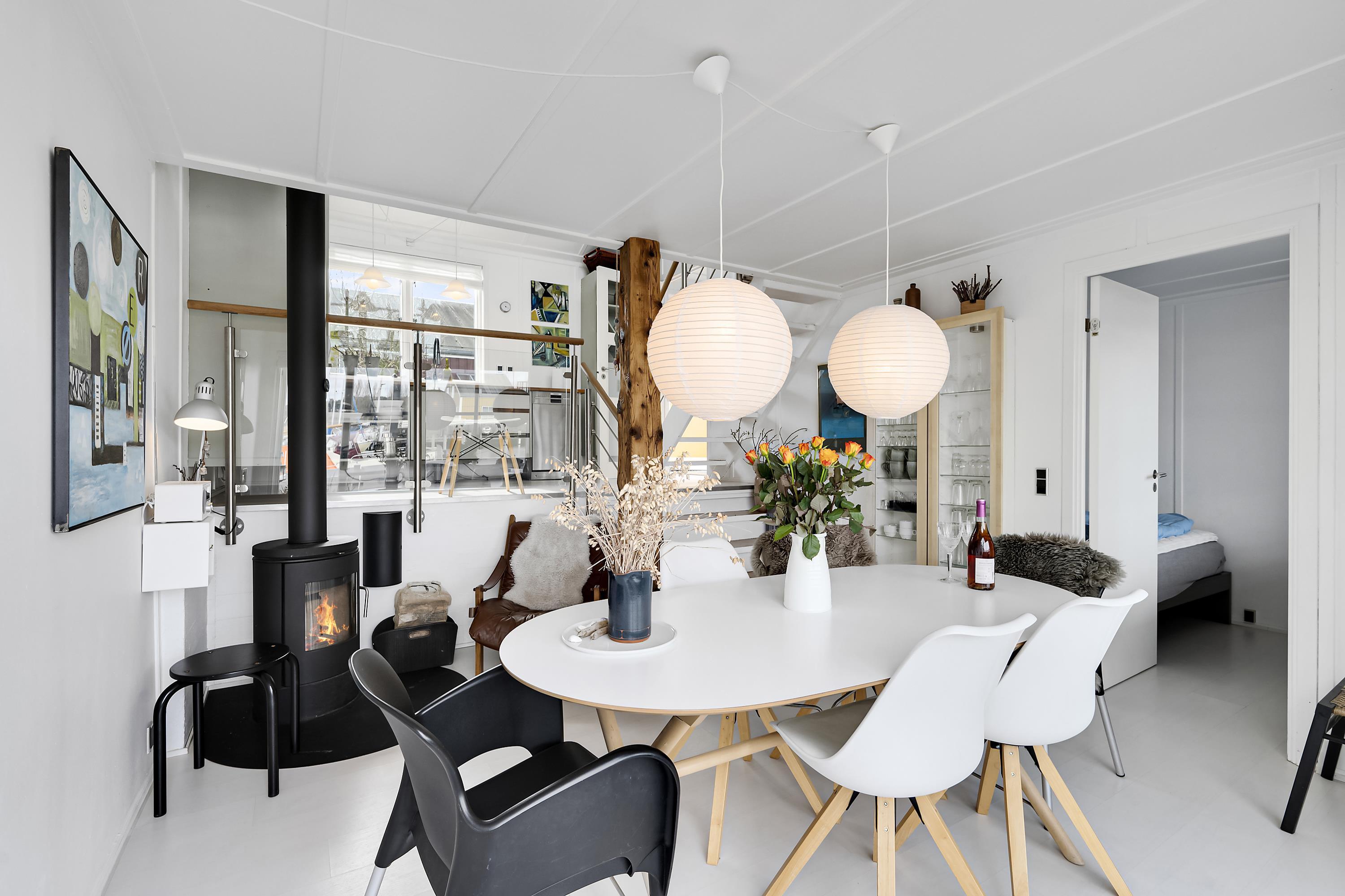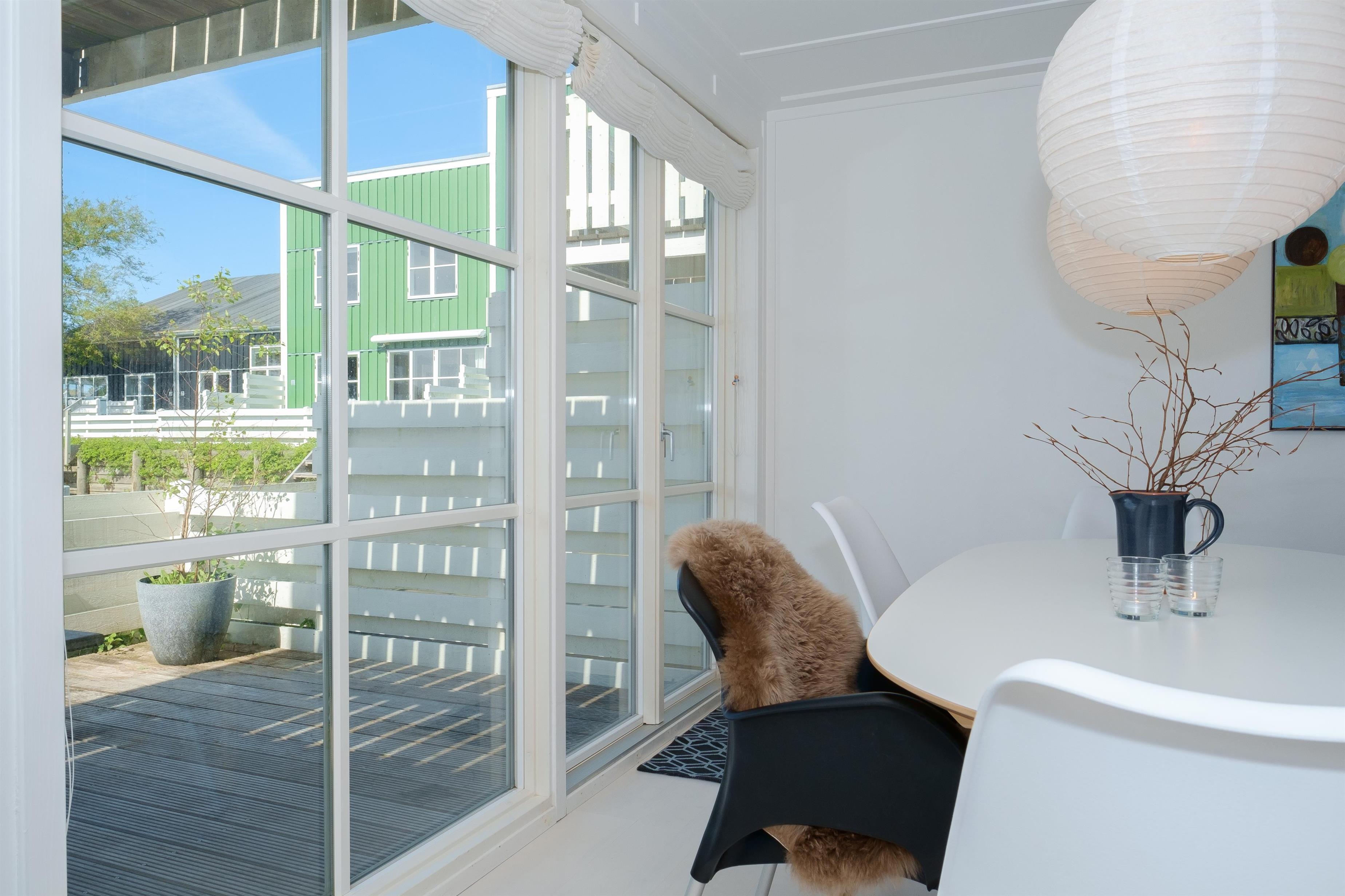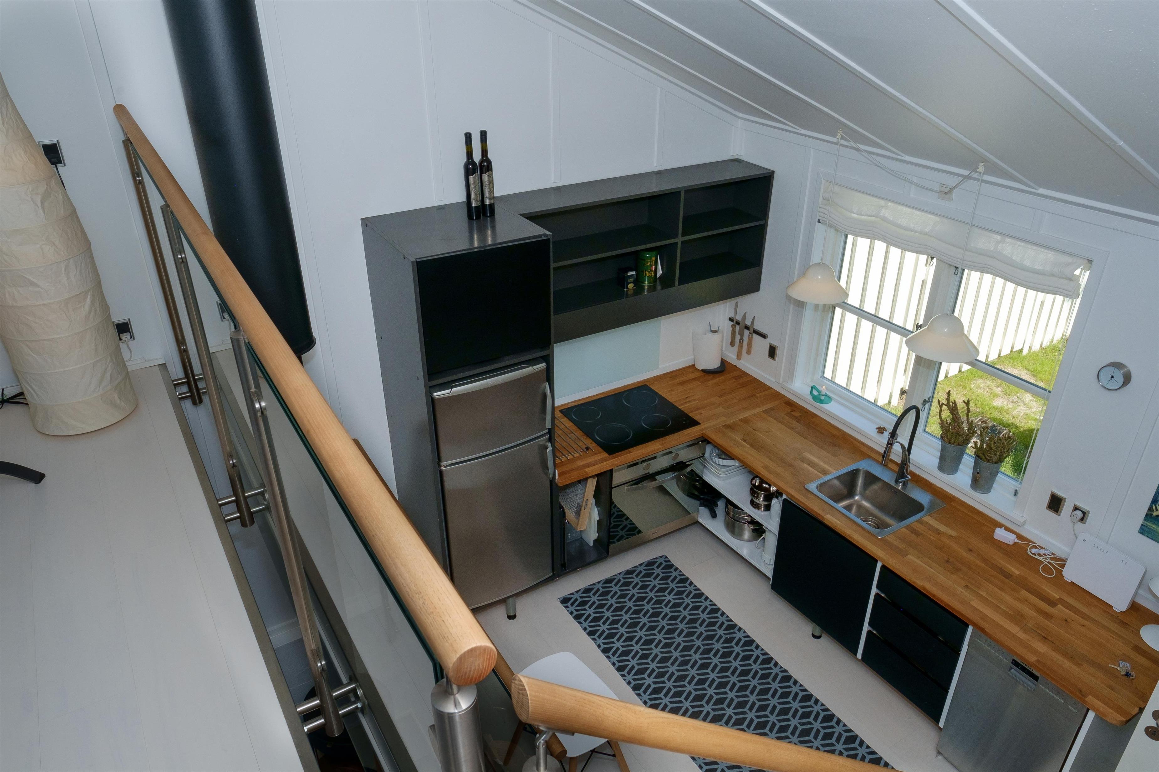 Lyst og hyggeligt alrum i åben forbindelse med køkken og med udgang til terrassen. Her er spiseafdeling til 5 personer og et kvart plan op til flot, veludstyret køkken med keramiske kogeplader, ovn, køle-/fryseskab og opvaskemaskine. Dejlig opholdsstue på 1. sal med sofa og lænestole og udgang til altan, samt radio. De 5 sovepladser fordeler sig på 1 soveværelse i stueplan og et værelse på 1. sal med to enkelt senge og en køjeseng ovenover. Dejligt, regulært badeværelse i stueplan med bruseniche og gulvvarme. Der er mulighed for streaming via TV´et.