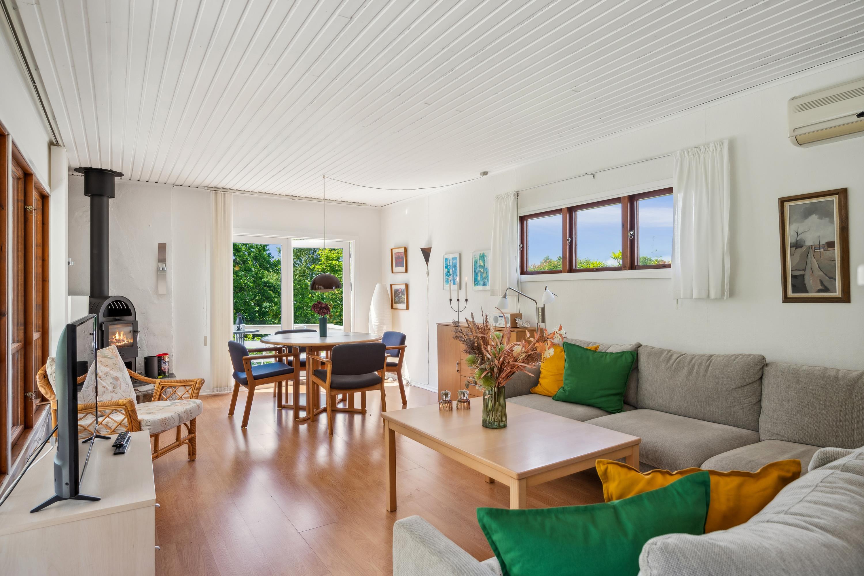 Hyggeligt feriehus nær Ebeltoft med brændeovn, terrasse og stor have, perfekt til familieferie i naturskønne omgivelser.