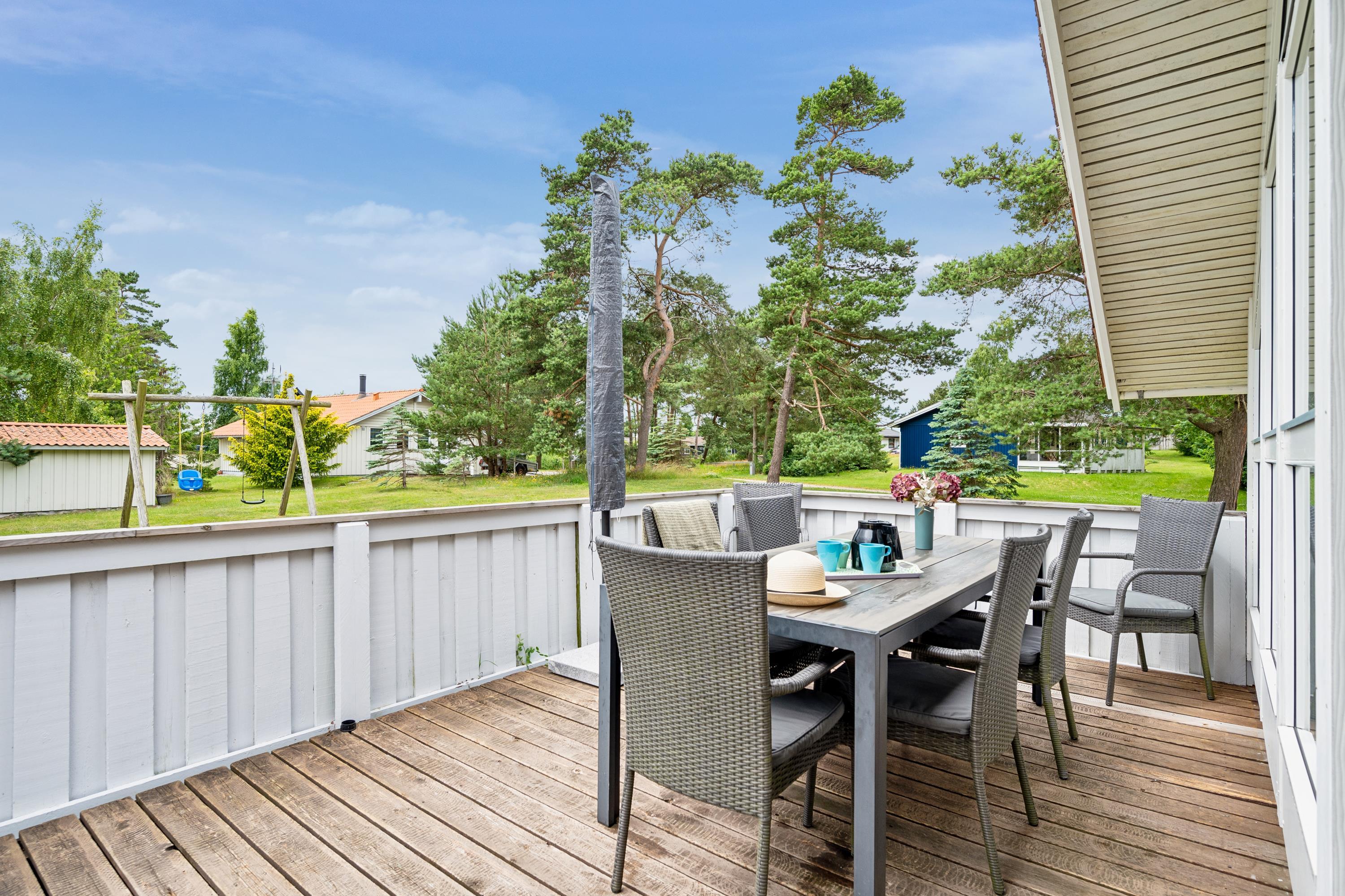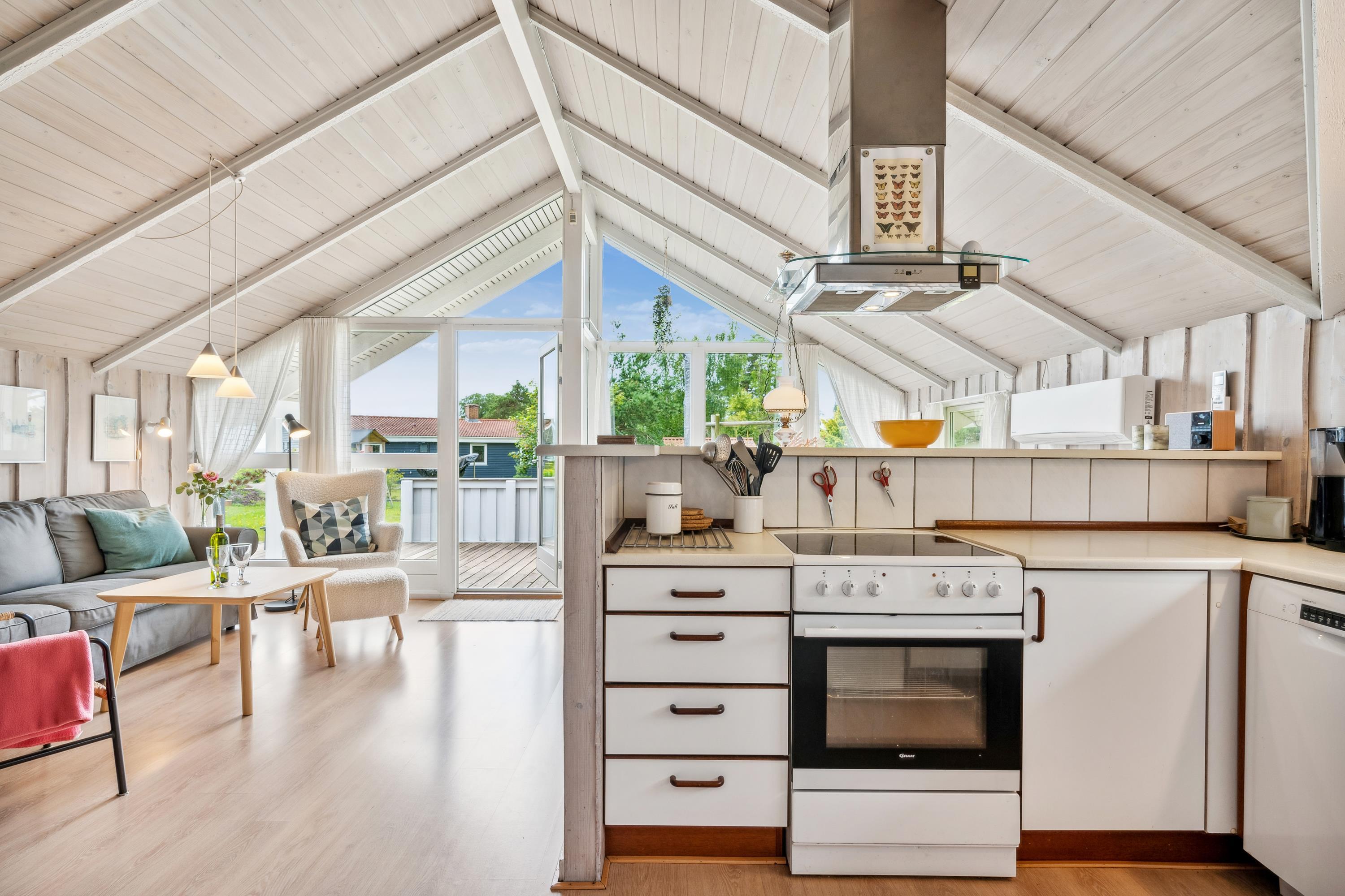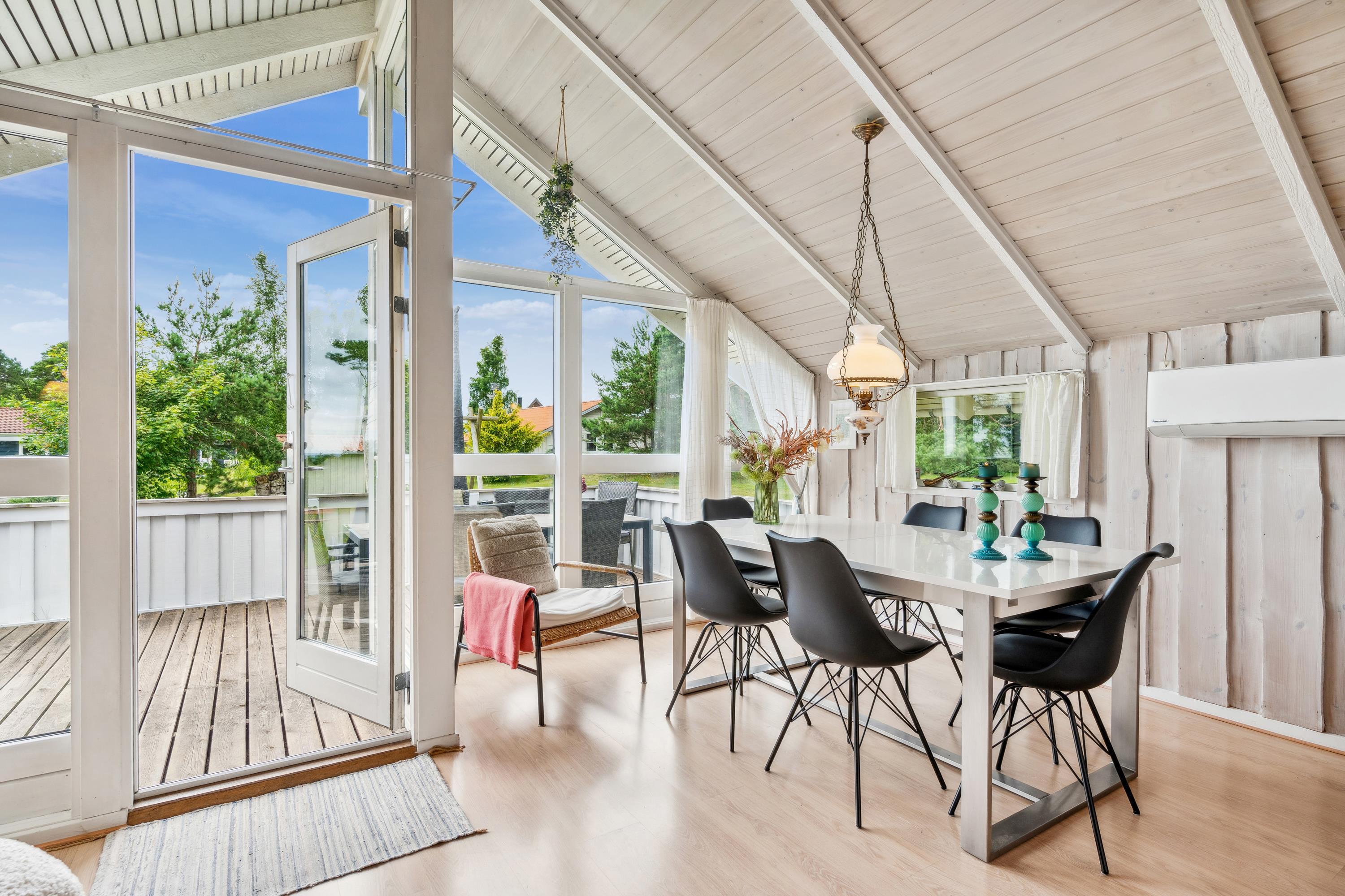 Blot 5 min kørsel fra Ebeltoft finder man dette hyggelige og velholdte feriehus. Her finder man en hyggelig indrettet stue med brændeovn og varmepumpe.Fra stuen er der udgang til stort terrasseareal med havemøbler. I forbindelse med stuen ligger det velfungerende køkken med b.la. opvaskemaskine. Pænt badeværelse med bruseniche og vaskemaskine samt adgang til sauna. Husets sovepladser fordeler sig på tre gode værelser, heraf to med dobbeltsenge og et værelse med en enkeltseng og en overkøje. Til de små feriegæster er der en høj stol og en barneseng. Huset er beliggende på en grund med en stor græsplæne og til de små feriegæster er der en sandkasse og gyngestativ. Fra grunden har man et lille havkig til Ebeltoft Færgehavn.