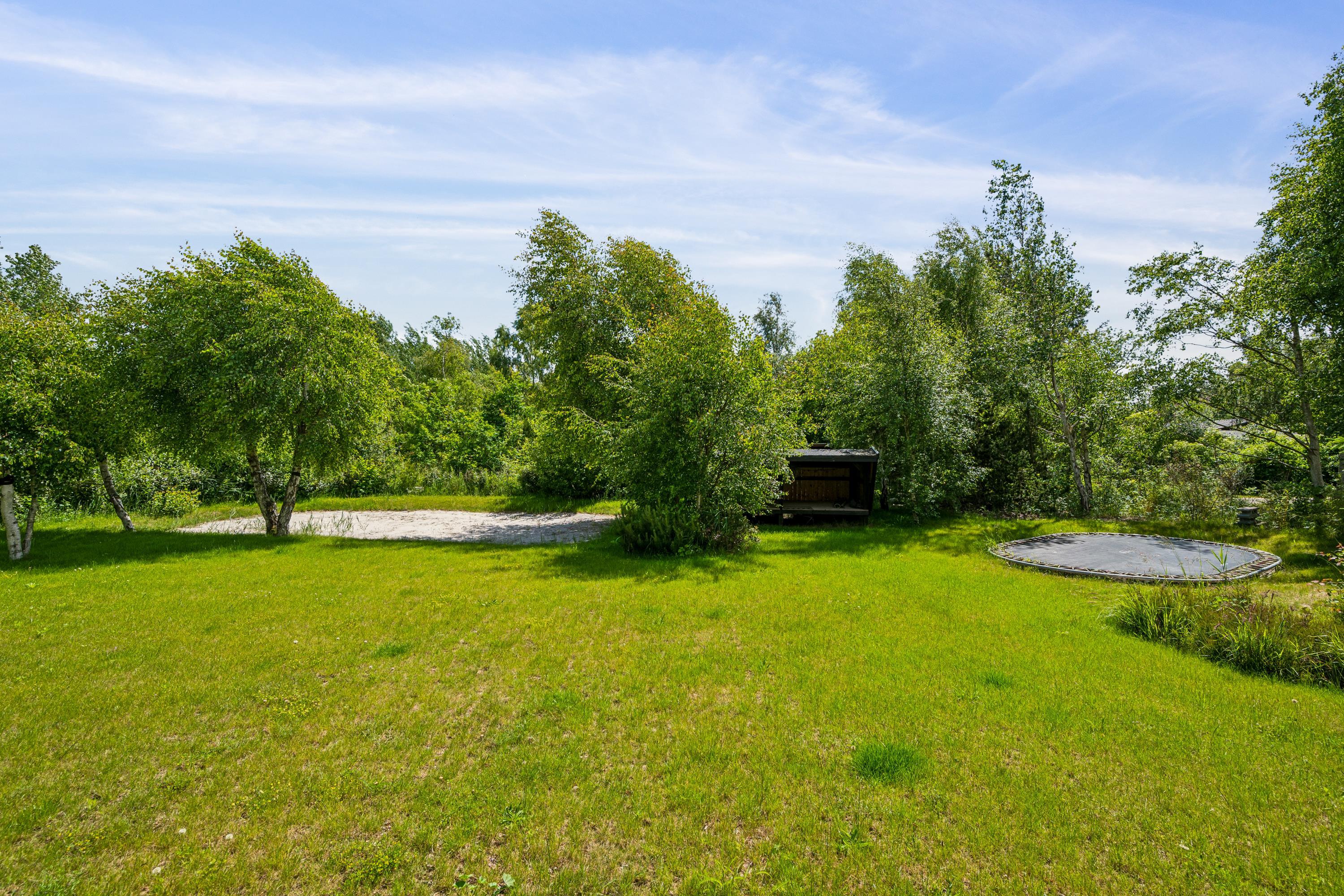 Hyggeligt feriehus nær Ebeltoft med terrasse, trampolin og shelter på stor naturgrund.