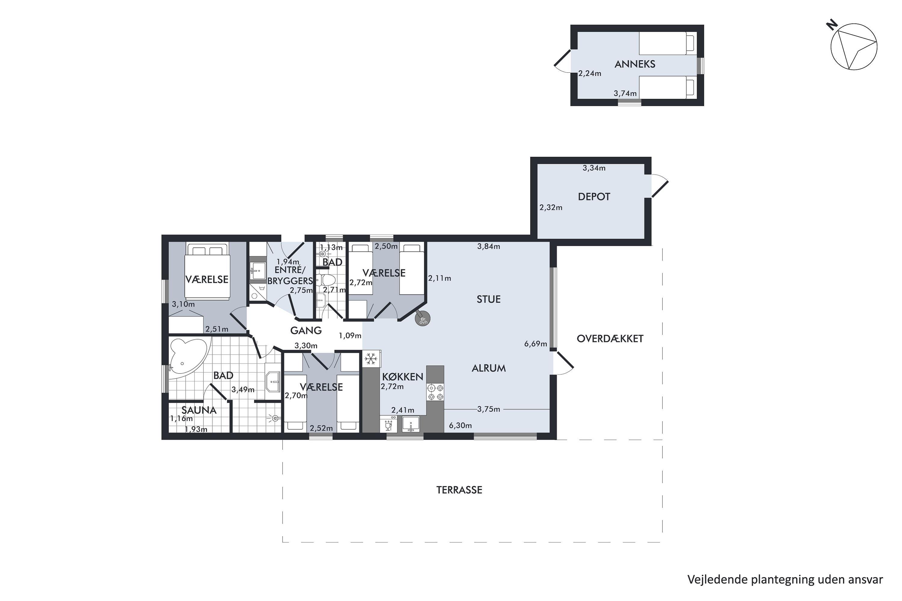 De 88 kvm. rummer blandt andet lys og velmøbleret opholdsstue med udgang til overdækket terrasse. Her er spiseplads til 8 personer, brændeovn, TV med danske gratis kanaler og tyske kanaler, Apple TV, CD-afspiller samt radio + USB-tilkobling til smartphone. Det rummelige, veludstyrede køkken ligger i åben forbindelse med stuen og har keramisk komfur med ovn, køle-/fryseskab, opvaskemaskine, samt mikrobølgeovn. Stort, dejligt badeværelse med bruseniche, spa og sauna samt mindre badeværelse med bruseniche. Der er gulvvarme i det store badeværelse. Desuden et praktisk bryggers med vaskemaskine og tørretumbler. De 6 sovepladser fordeler sig på stort, lyst soveværelse med dobbeltseng og 2 mindre værelser med 2 enkeltsenge. Desuden er der et hyggeligt lille anneks, som rummer to ekstra 2 enkeltsenge. Huset har desuden barneseng og højstol. Internetadgang/WIFI.