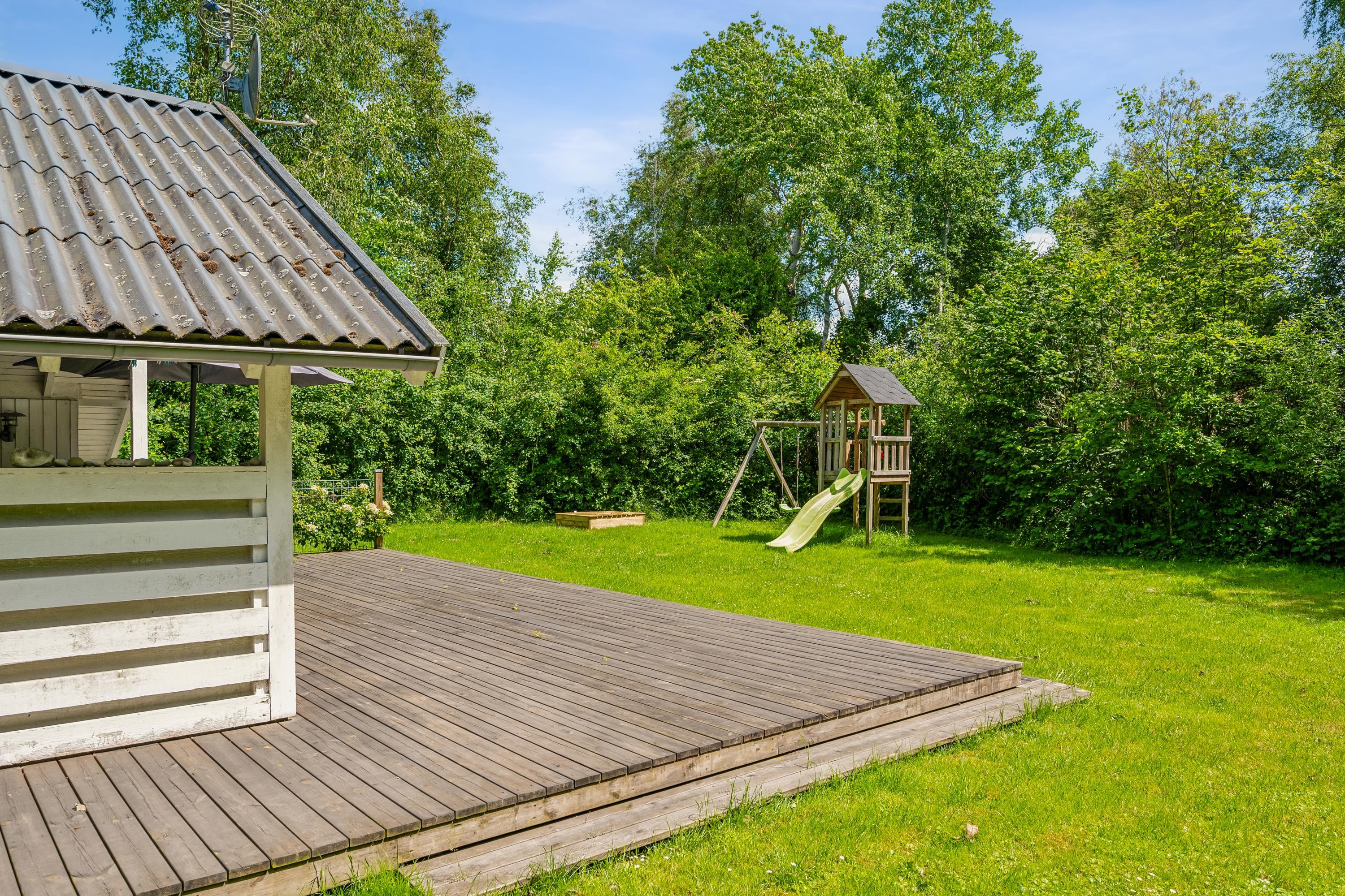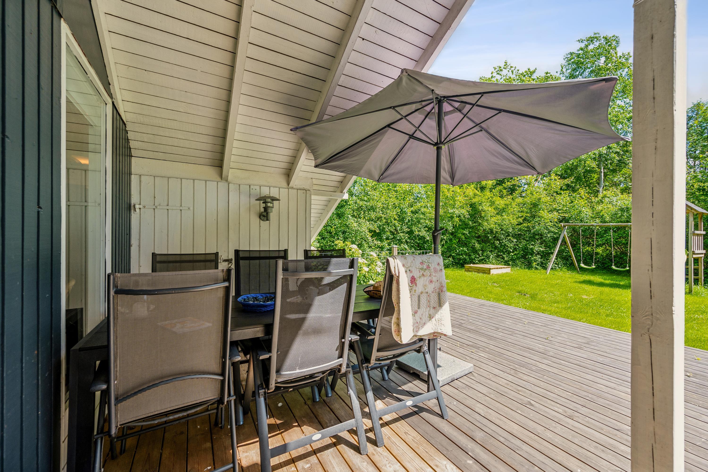 Hyggeligt feriehus nær Øer Strand med terrasse, gynge, sandkasse og moderne faciliteter i naturskønne omgivelser.