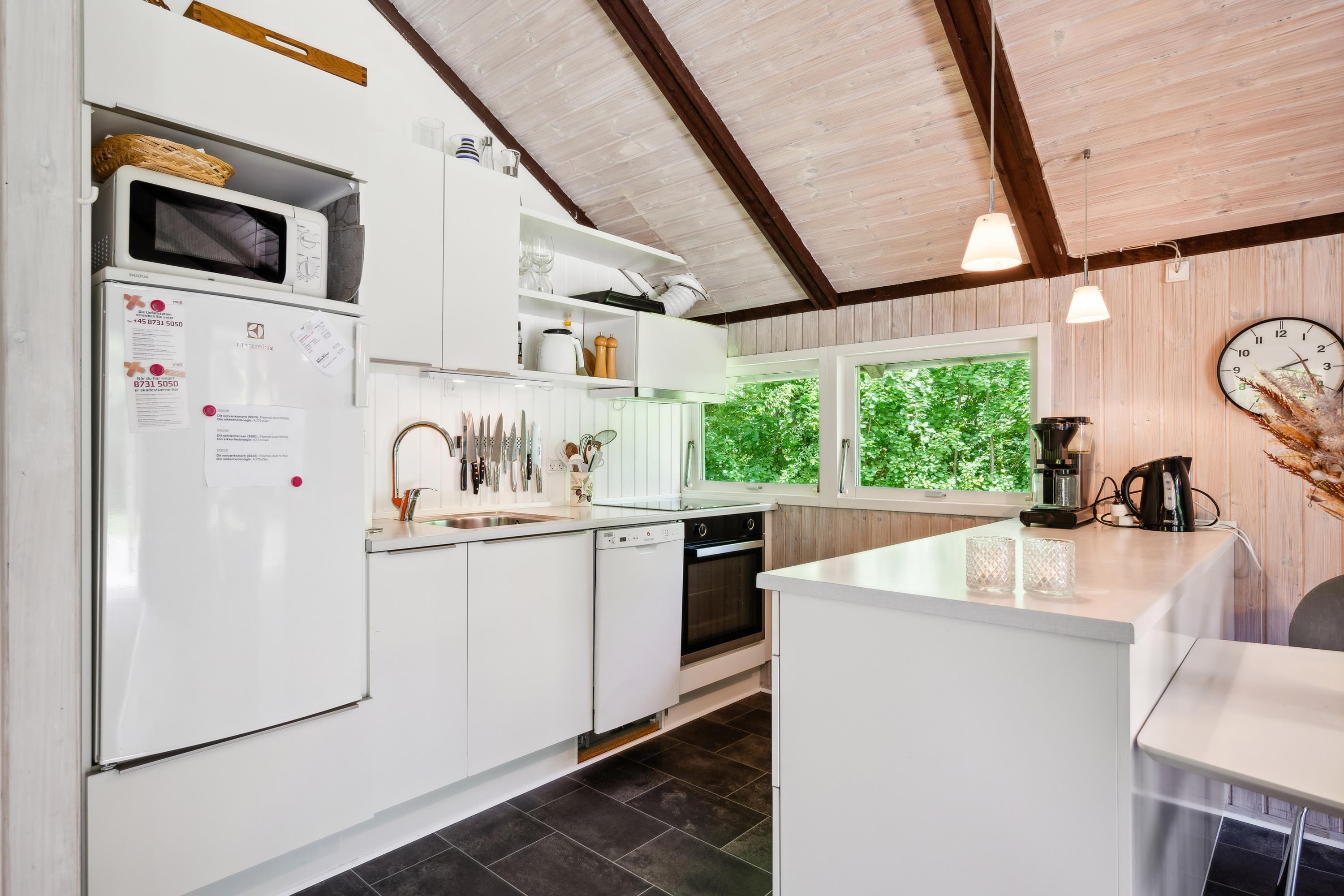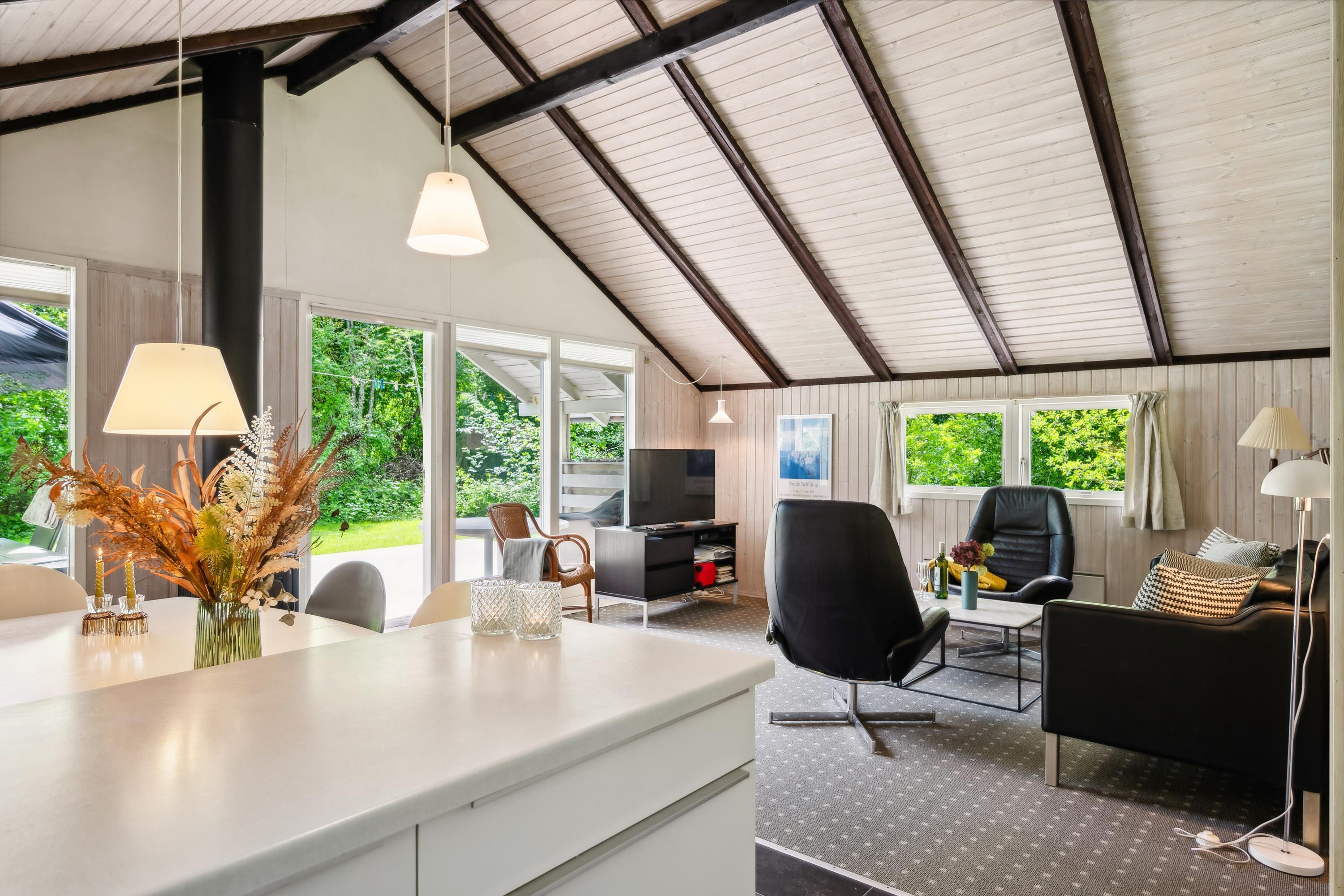Lys opholdsstue i åben forbindelse med køkken og med udgang til terrassen. Her er ligesom i resten af huset lofter til kip og indrettet med brændeovn, spiseafdeling til 5 personer, hyggelig alkove, sofamøblement, TV med parabol (inkl. TV2), DVD-afspiller samt stereoanlæg med CD. Nyrenoveret køkken med induktionskomfur, ovn, opvaskemaskine, køleskab med lille fryser og mikrobølgeovn. Husets 5 sovepladser fordeler sig på 3 gode soveværelser: 2 med dobbeltseng og 1 med 1 enkeltseng. Ældre badeværelse med bruseniche. Barneseng og barnestol. Huset har internetadgang.