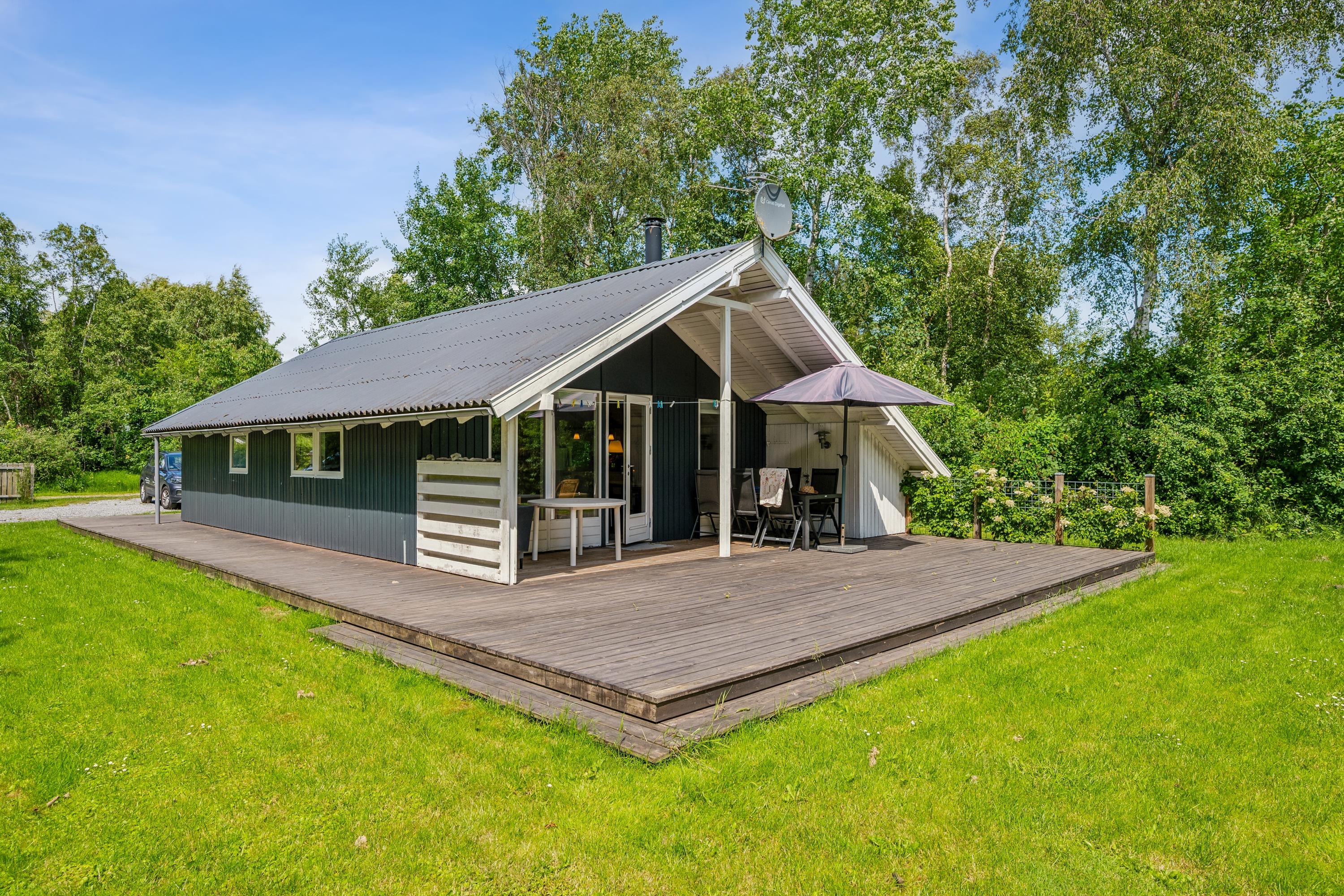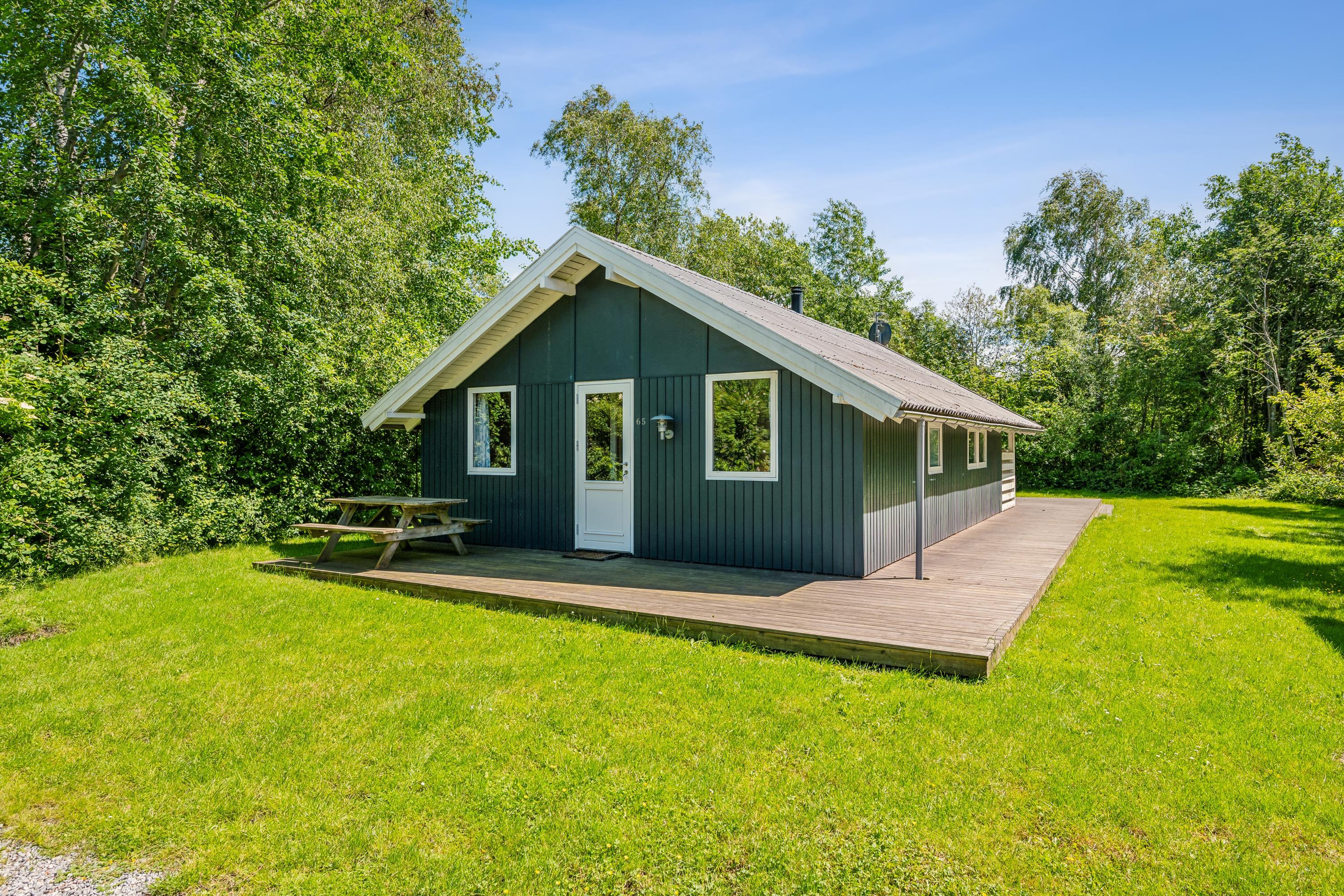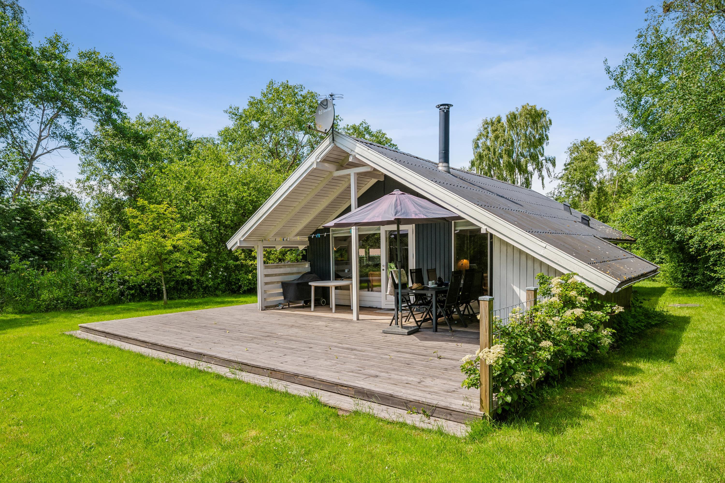 Ældre, velholdt feriehus beliggende på afskærmet naturgrund for enden af blind vej. Dejlig, nyere træterrasse med havemøbler og grill, og på grunden er der gynge og sandkasse til de mindste feriegæster. Desuden råder huset over et aflåseligt skur.
