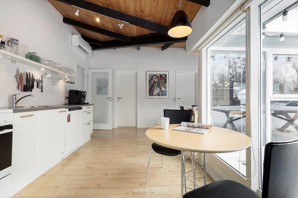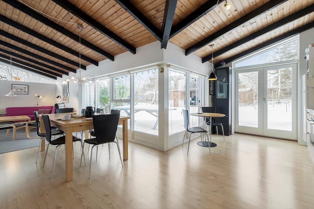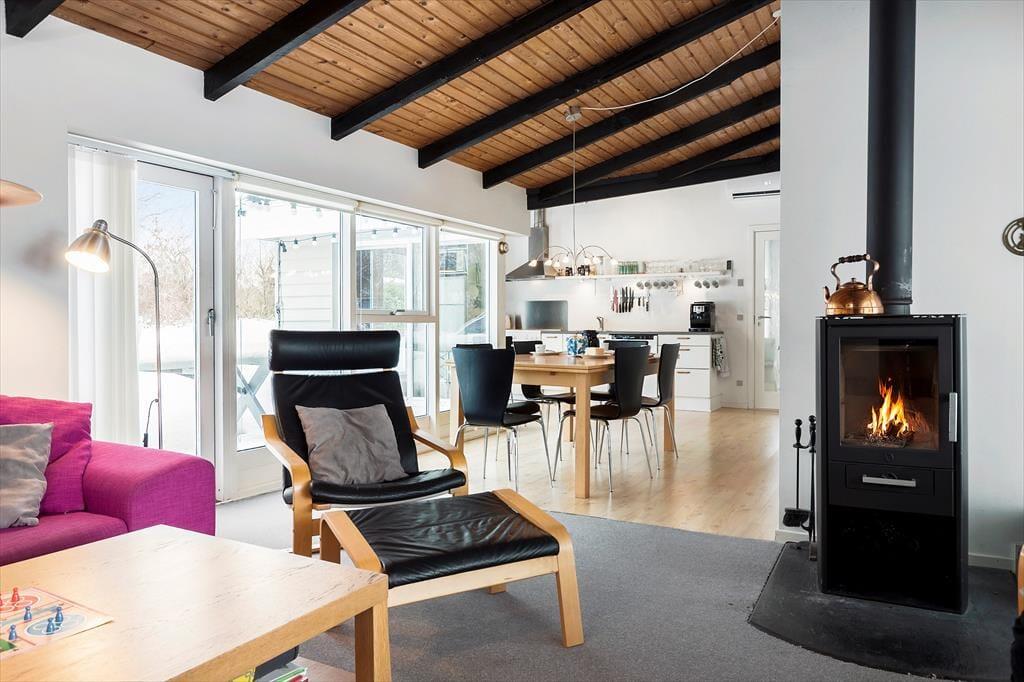 Når du træder ind i dette moderne feriehus, mødes du af en lys og rummelig atmosfære. Husets hjerte er det åbne køkken-alrum, der smelter sammen med stuen og inviterer til samvær og hyggelige stunder. Her kan du nemt tilberede lækre feriemåltider i det veludstyrede køkken, mens familien hygger sig omkring spisebordet eller i sofaen. De store vinduer giver et fantastisk lysindfald og bringer naturen helt tæt på.