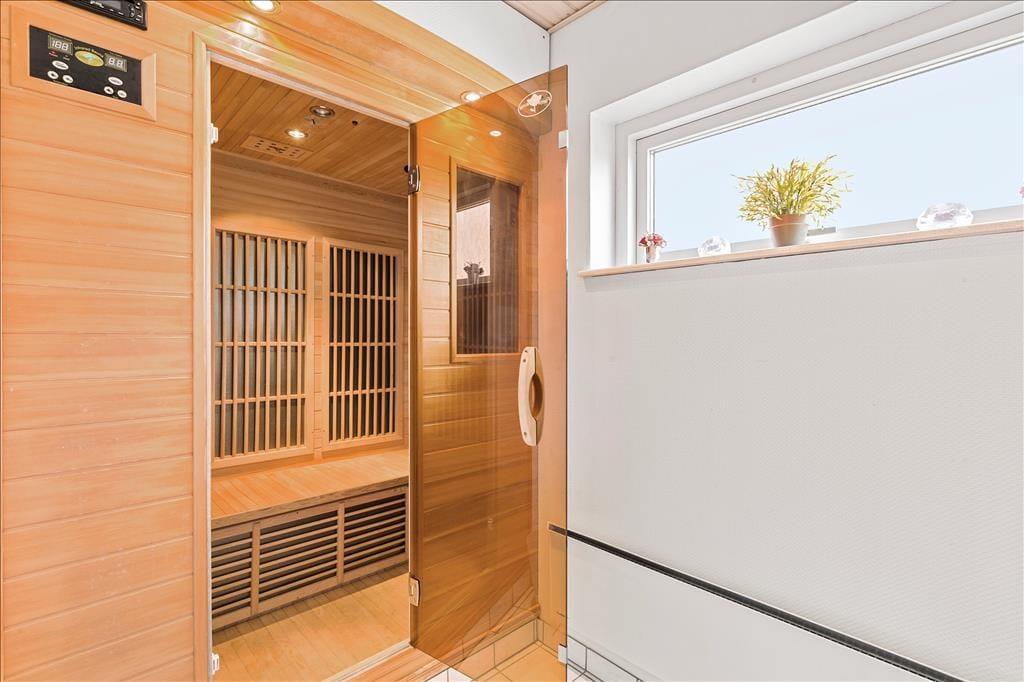 Her er varme og hygge overalt. Du kan sidde helt uforstyrret i udestuen og nyde den fine have som omkranser huset og giver ro og alenetid. Hvis du står tidligt op kan du måske også være så heldig at se skovens vilde dyr spadsere omkring i haven. Huset har et åbent køkken så alle kan deltage i spil, hygge og madlavning på samme tid. Efter en dejlig gåtur til havet har du mulighed for at slappe af i spaen og tage en tur i saunaen til sidst, så alle muskler får lov at slappe af sammen med dig. I stueetagen er der også et soveværelse så der er mulighed for en lille ”morfar” når dagen har budt på mange indtryk.