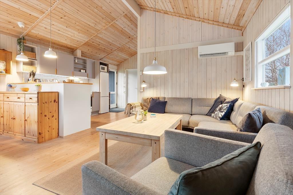 Sommerhus i Ebeltoft, Østjylland, med plads til 5 voksne. Der er en hyggelig indretning med bl.a. brændeovn, og du finder desuden vaskemaskine, opvaskemaskine og tørretumbler i boligen.