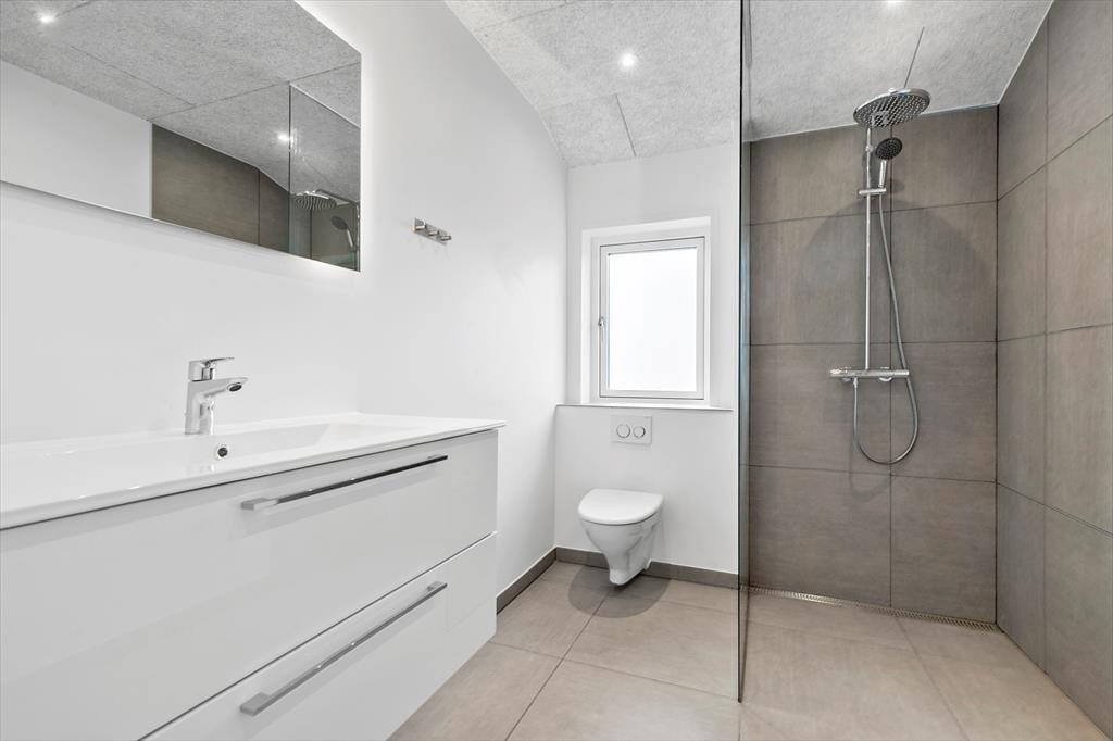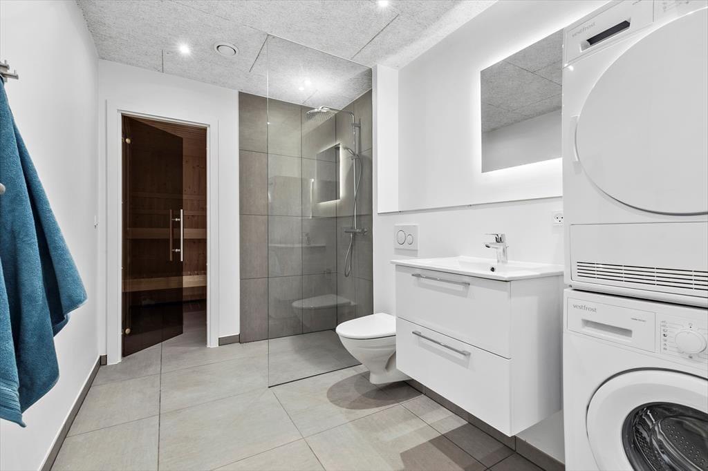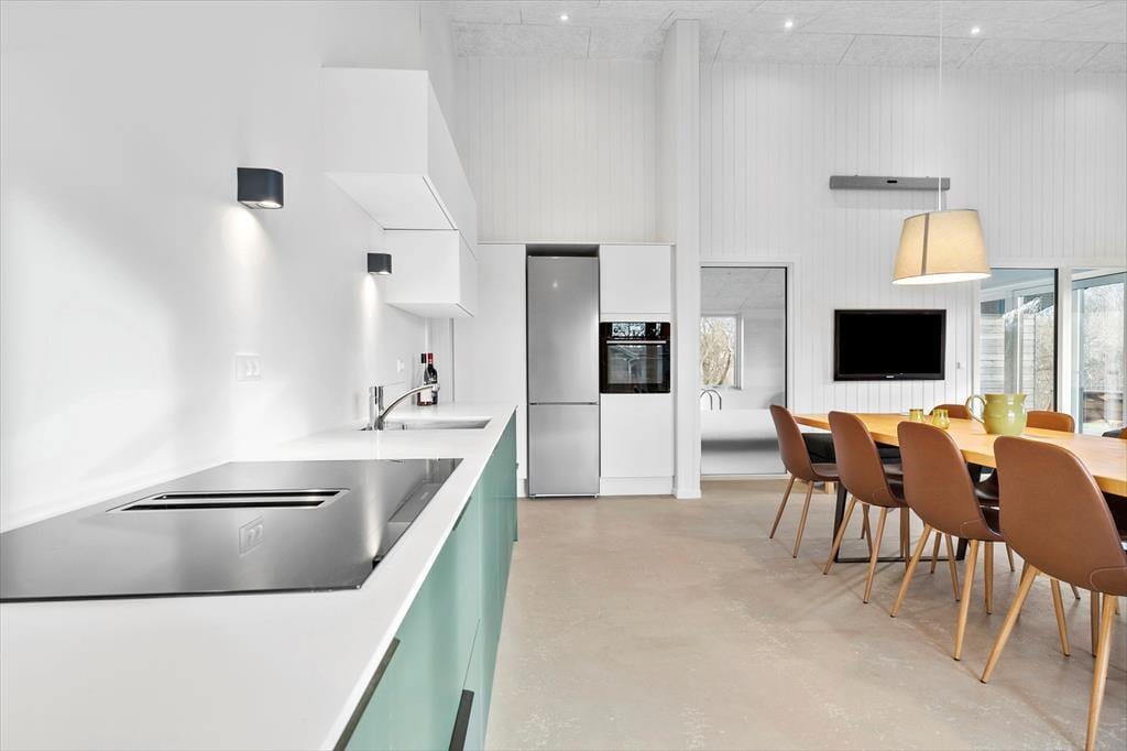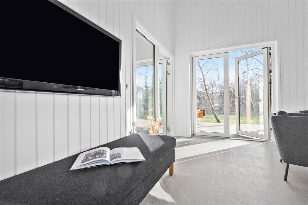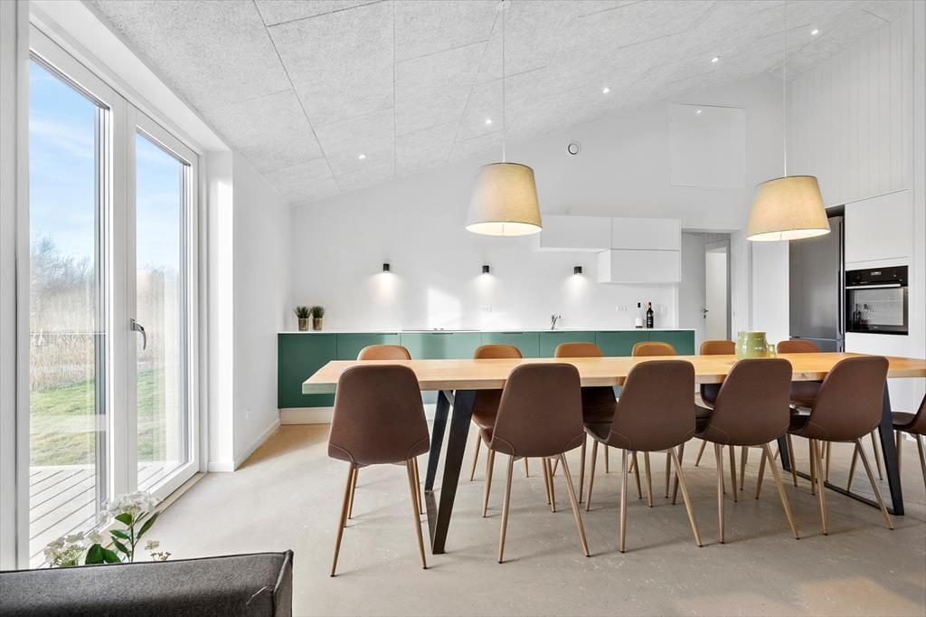Det imponerende høje loft og store vinduer skaber en lys og luftig atmosfære, der giver dig fornemmelsen af at være tæt på naturen, mens du nyder alle moderne bekvemmeligheder. Det åbne køkken i forbindelse med stuen giver dig mulighed for at tilberede lækre måltider og samtidig deltage i hyggelige samtaler eller spil med børnene.