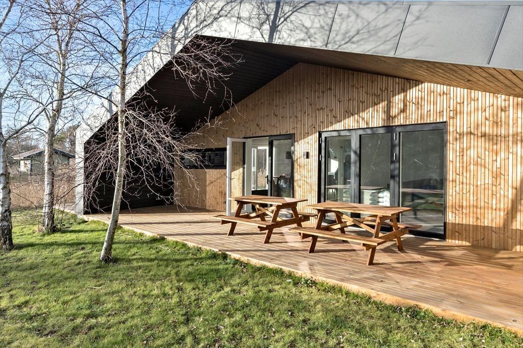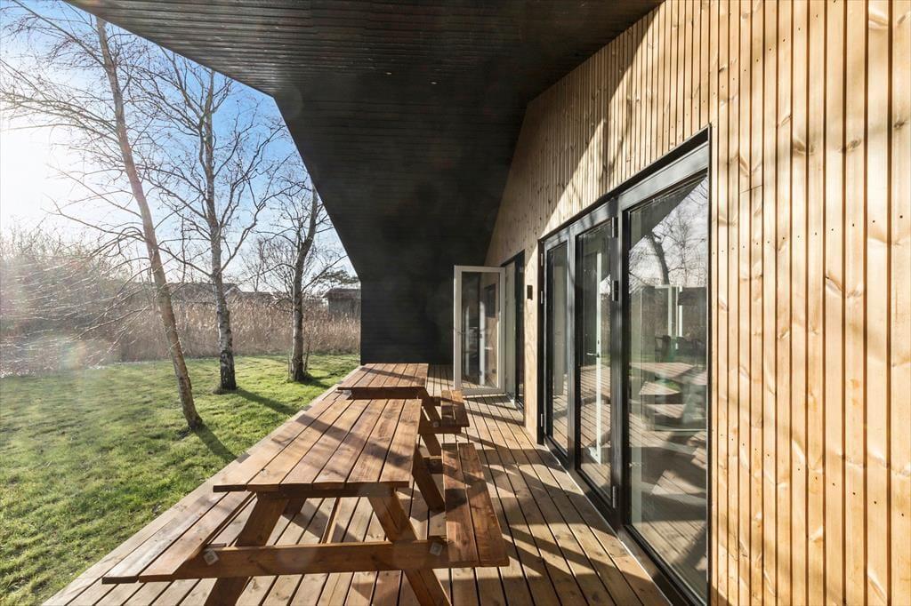 Den store overdækkede terrasse er det perfekte sted at nyde morgenkaffen eller slappe af med en god bog, mens du tager ind i naturens skønhed omkring dig. Uanset vejret kan du sidde komfortabelt udenfor og nyde den friske luft.