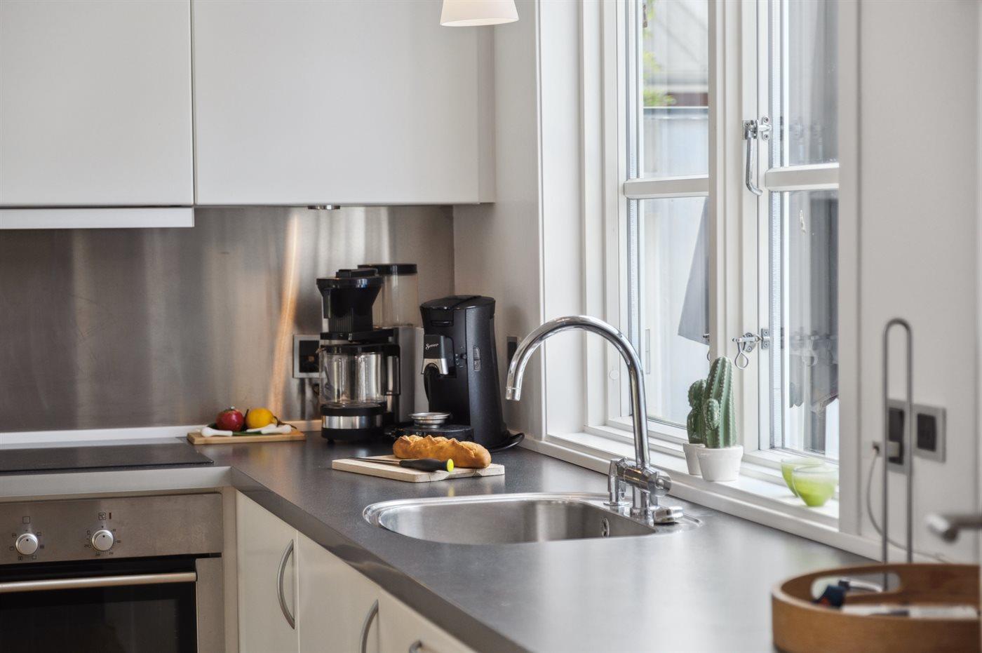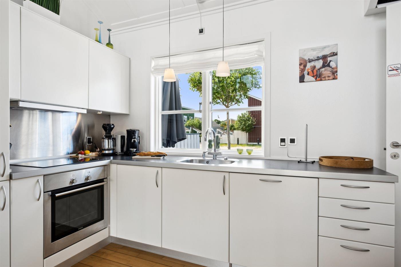 Køkkenet er udstyret med 1 køleskab. Der er 4 keramiske kogeplader, varmluftovn samt opvaskemaskine.