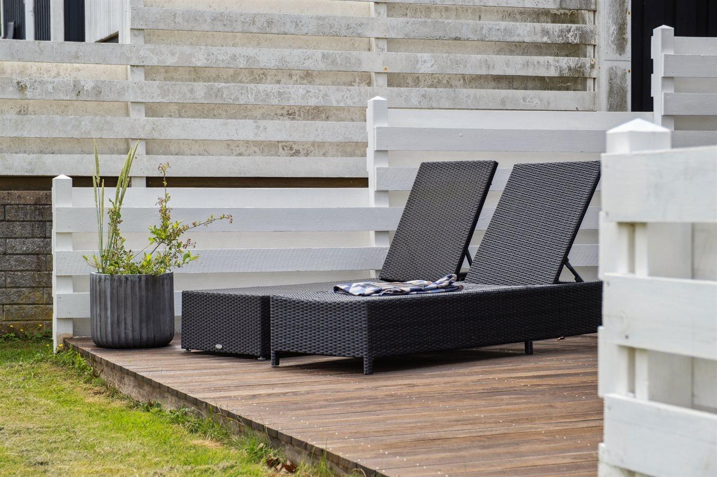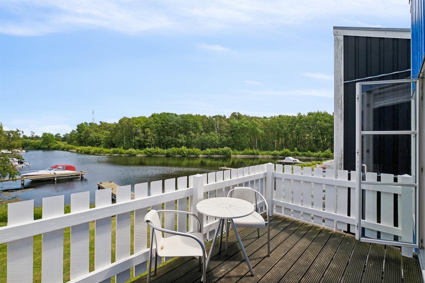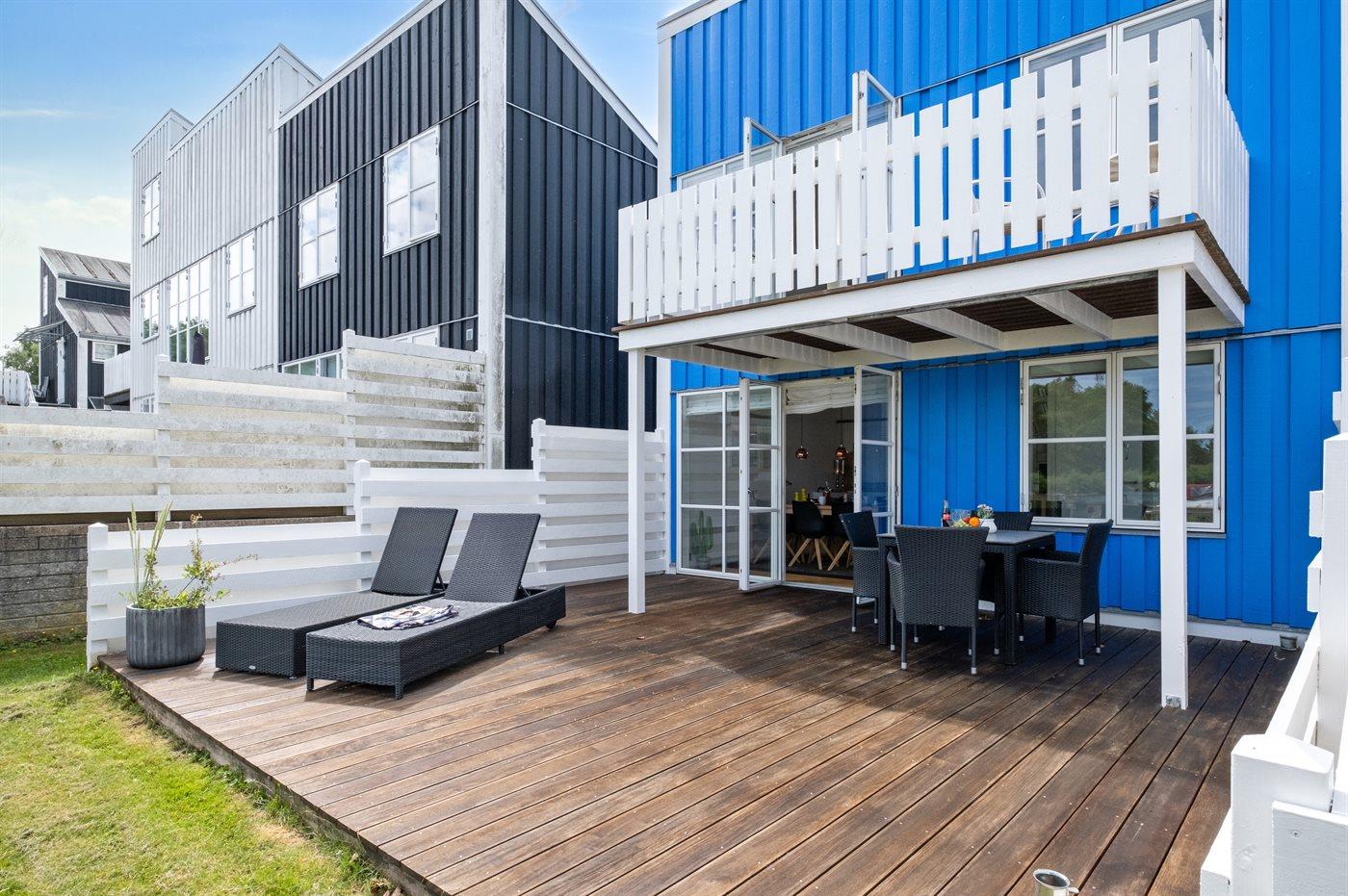 Flot sommerhus ved vandet i Øer Maritime Ferieby med altan, terrasse og havudsigt.