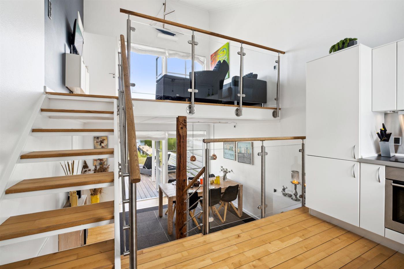 Du træder ind i huset på stueplan. Her finder du det nyrenoverede køkken og fine badeværelse. Herfra kan du gå op på første sal, hvor det ene soveværelse og opholdsstuen befinder sig. Heroppe finder du også en skøn altan. Går du ned i underetagen, finder du spisestue med direkte udgang til den dejlige terrasse. På samme etage findes også husets andet badeværelse.