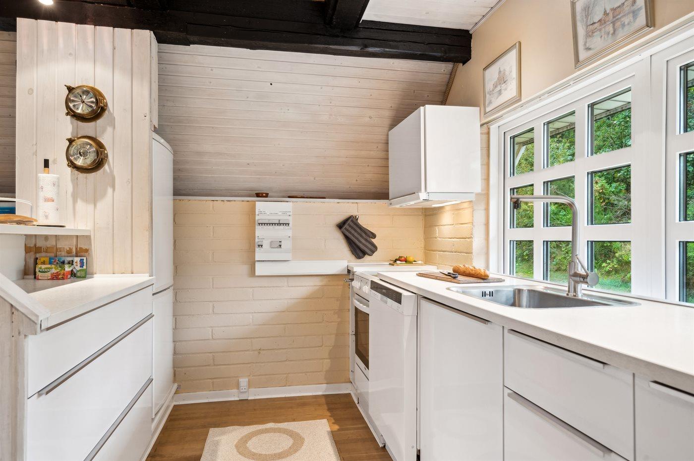 Køkkenet er udstyret med 1 køleskab. Der er 4 keramiske kogeplader, varmluftovn, mikrobølgeovn samt opvaskemaskine.