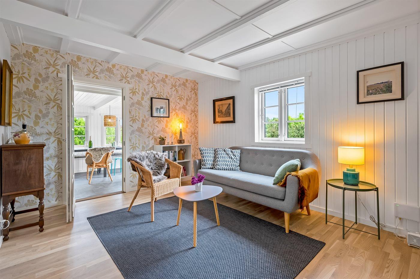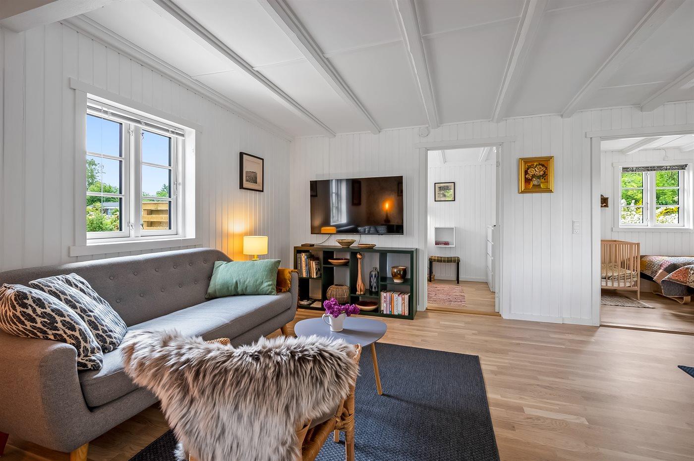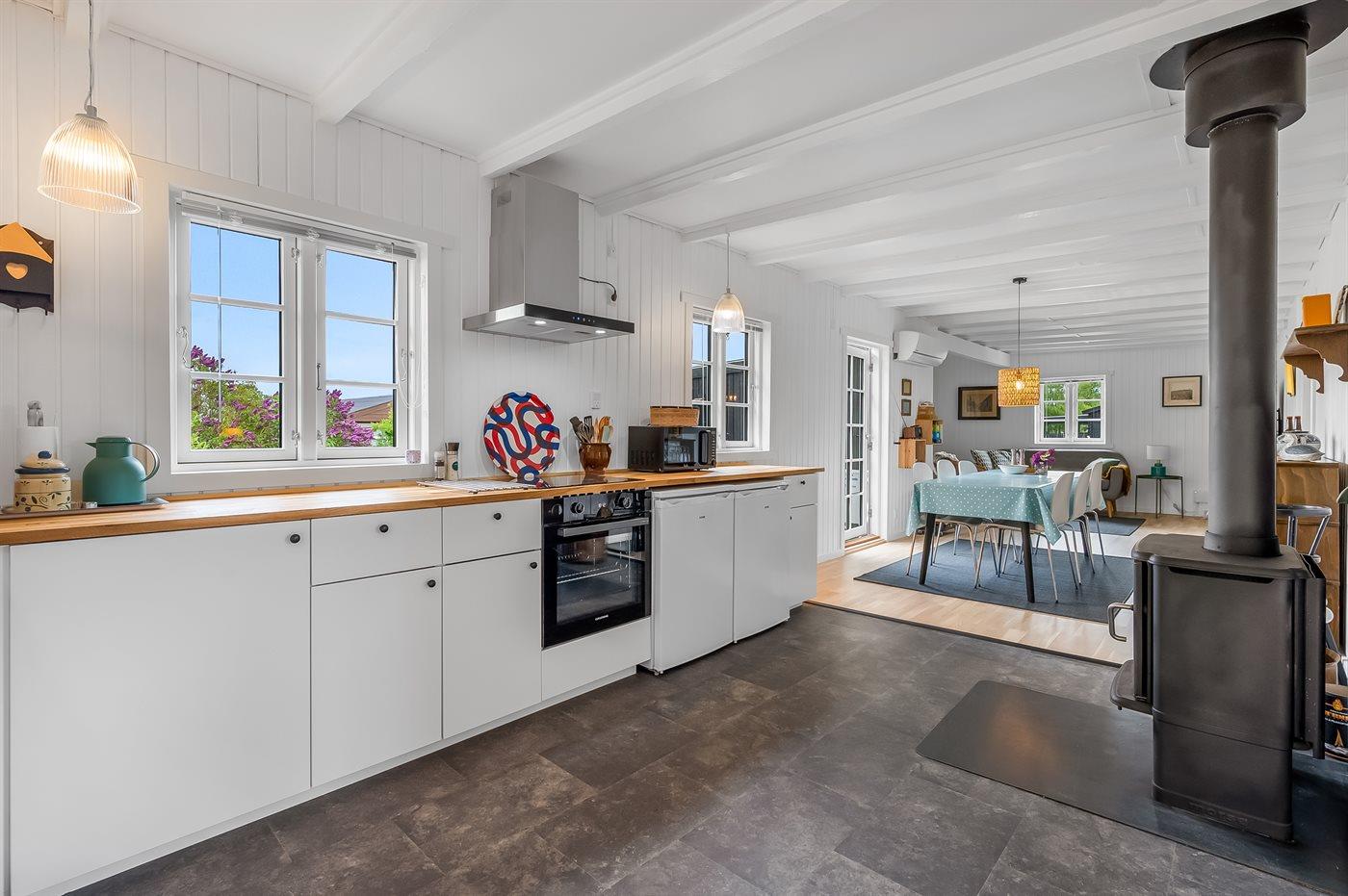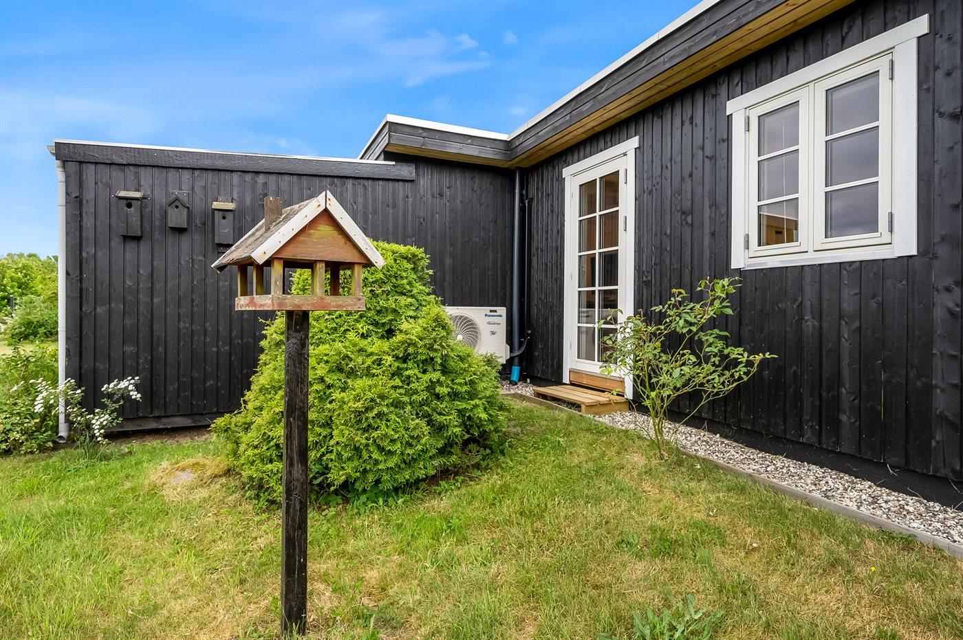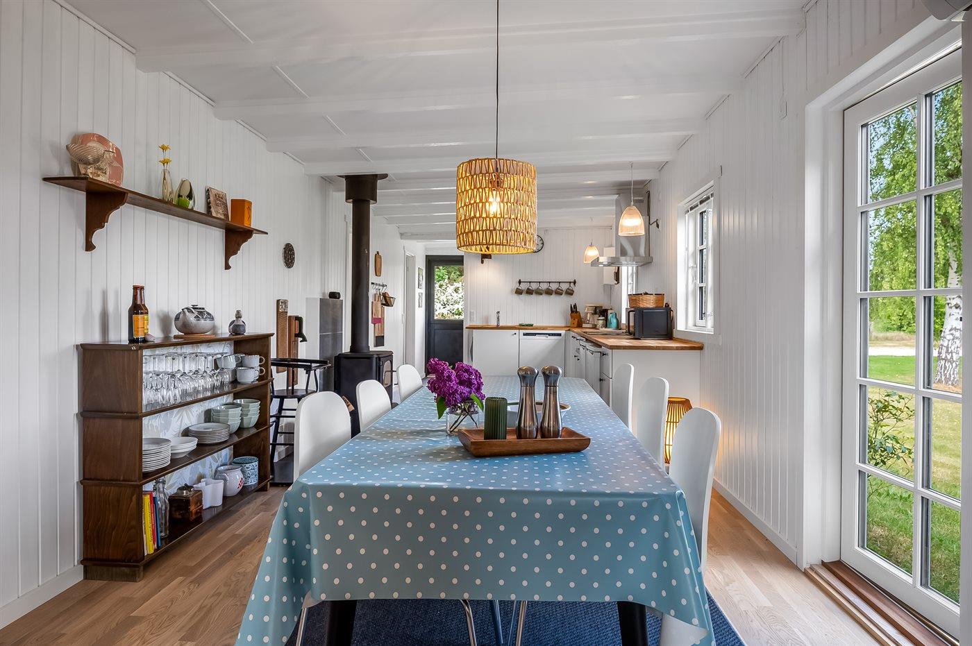 Sommerhuset er lyst og moderne med 3 soveværelser med senge der måler henholdsvis 140 x 200 cm, 160 x 200 cm og et værelse med 2 enkelte senge, som hver måler 80 x 200 cm. Husets hjerte er den dejlige stue med brændeovn, som ligger i åben forbindelse med køkken-alrummet. Der findes også en skøn havestue med legehjørne til børnene og et stort spisebord så der er plads til hele familien. Køkkenet er udstyret med køleskab, fryser, induktionskogeplader, varmluftsovn, mikrobølgeovn og opvaskemaskine.