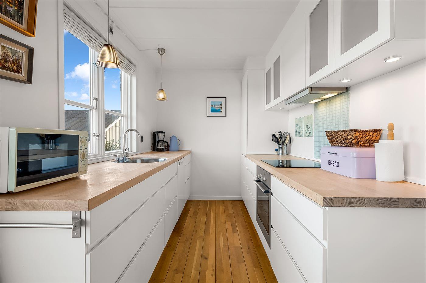 Køkkenet er udstyret med 1 køleskab. Der er 4 keramiske kogeplader, varmluftovn, mikrobølgeovn samt opvaskemaskine.