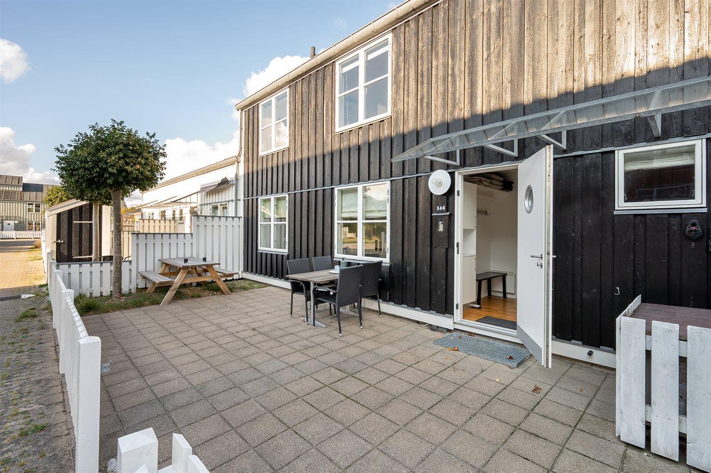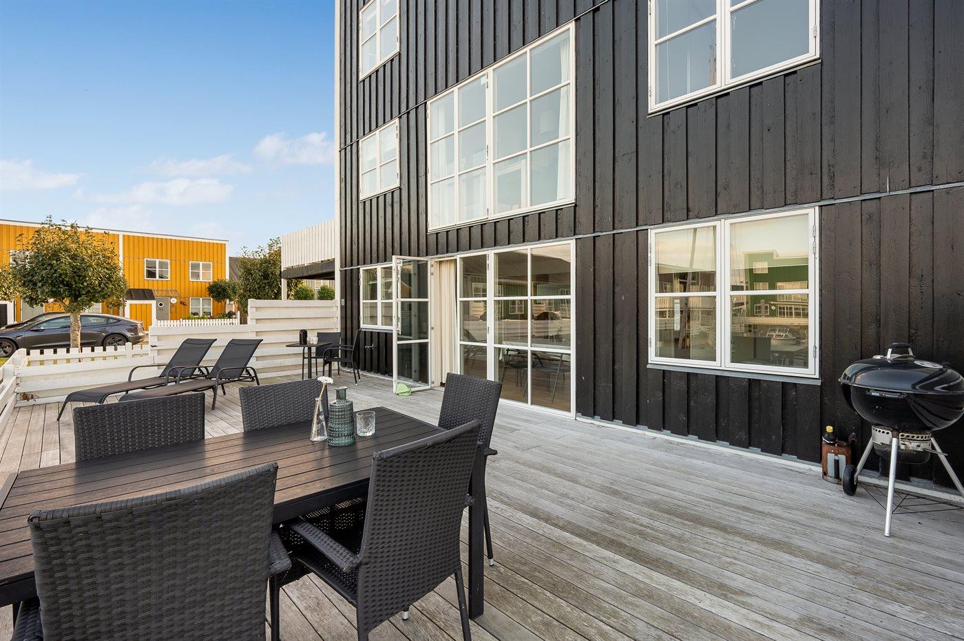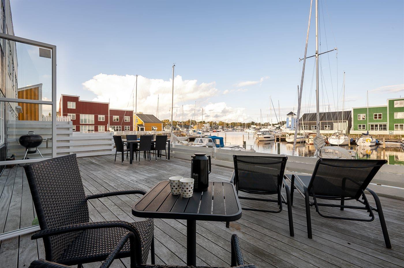 Feriehus ved vandet med stor terrasse og pool