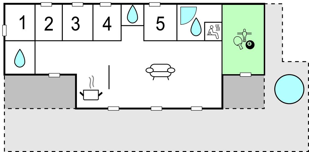 Huset byder på mange gode faciliteter bl.a. et aktivitetsrum med airhockey og bordfodbold. Udendørs er der også aktivitetsmuligheder for både børn og voksne. Børnene kan hygge sig i legetårnet, mens de voksne slapper af i det brændefyrede vildmarksbad. I forbindelse med husets store terrasseområde findes der to gode overdækkede terrasser, hvor aftenen kan nydes, selvom duggen falder. Her kan I også læne jer tilbage og kigge ud på hestene, der græsser på engen overfor.