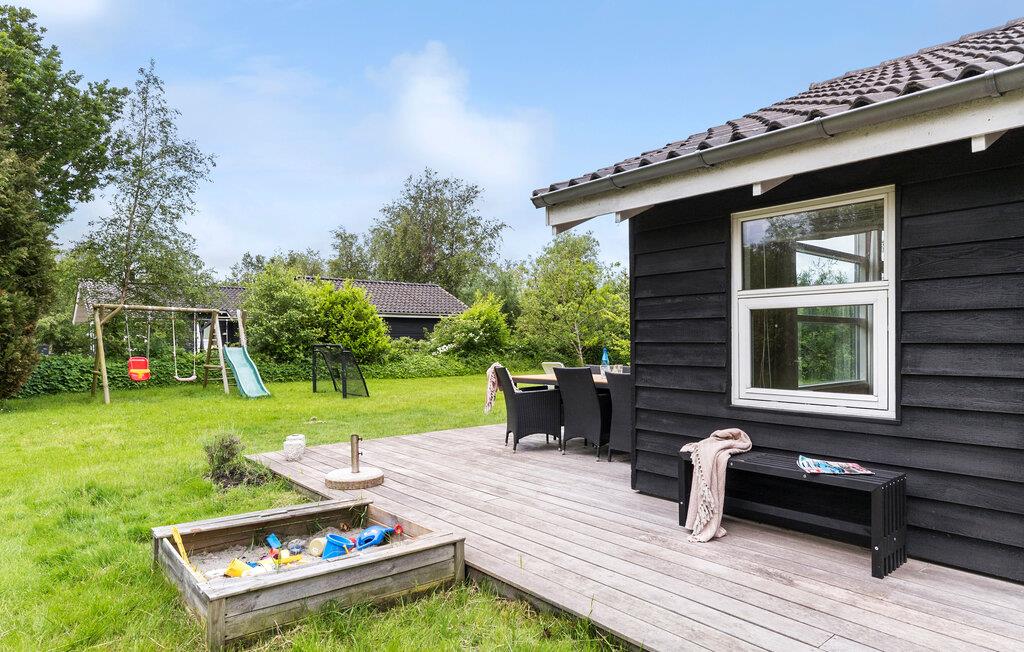 To sider af huset er omgivet af en stor træterrasse, som om sommeren bliver stedet, hvor I kan opholde jer udenfor. Se børnene lege på gyngerne, rutsjebanen og i sandkassen. Grill om aftenen, eller sæt jer omkring bålfadet for at riste skumfiduser.