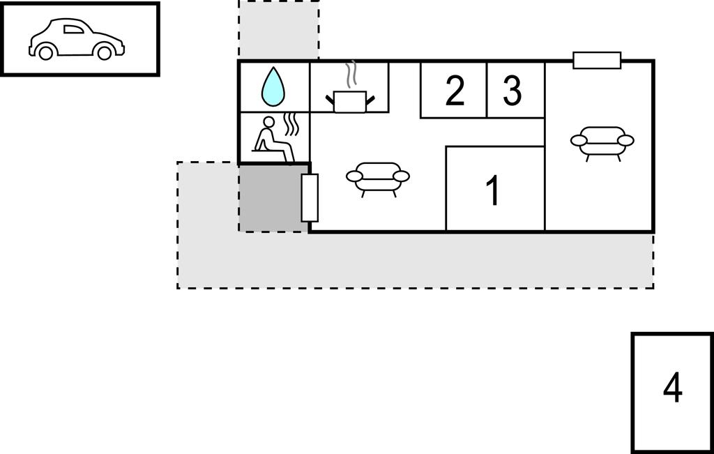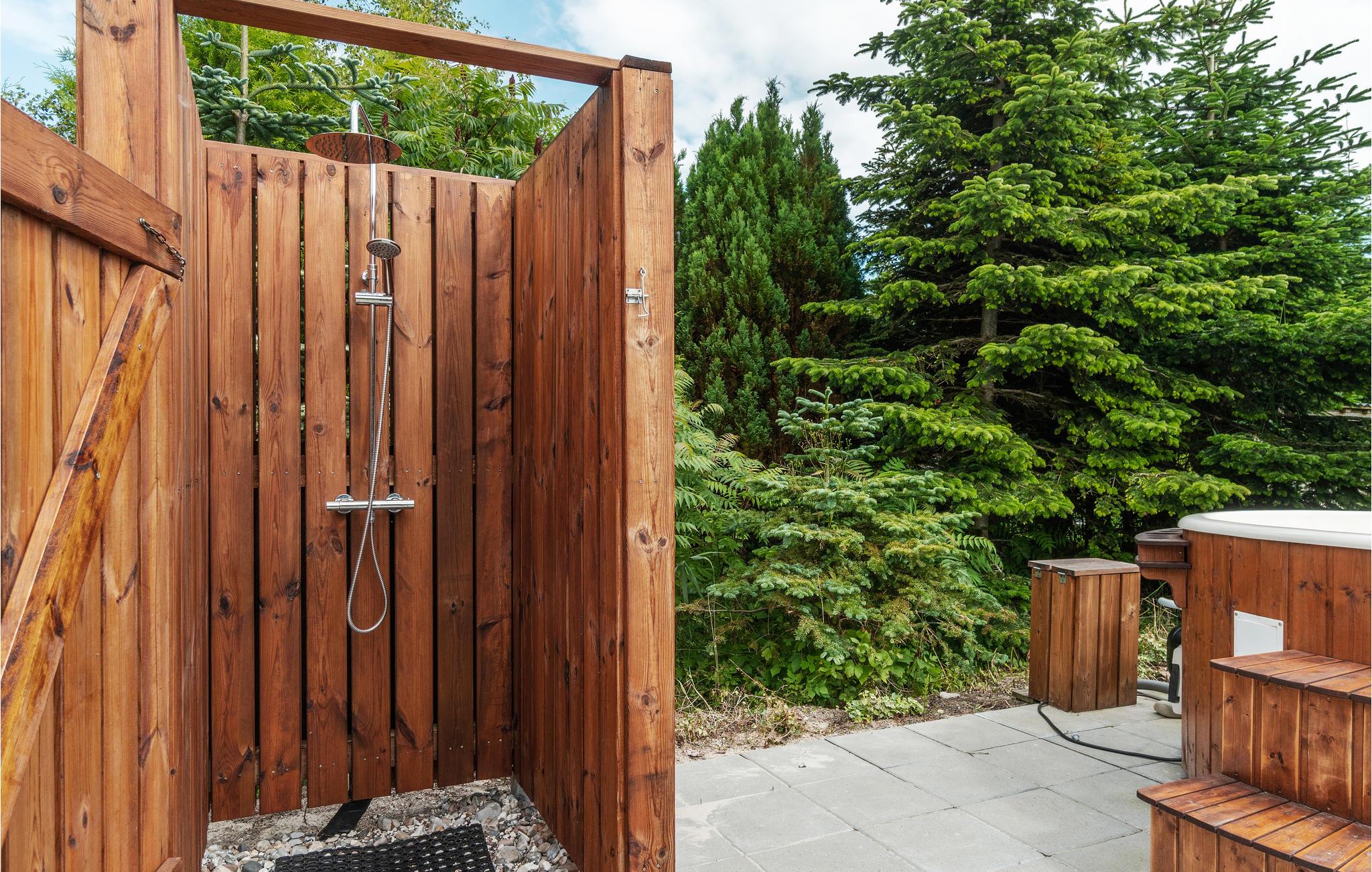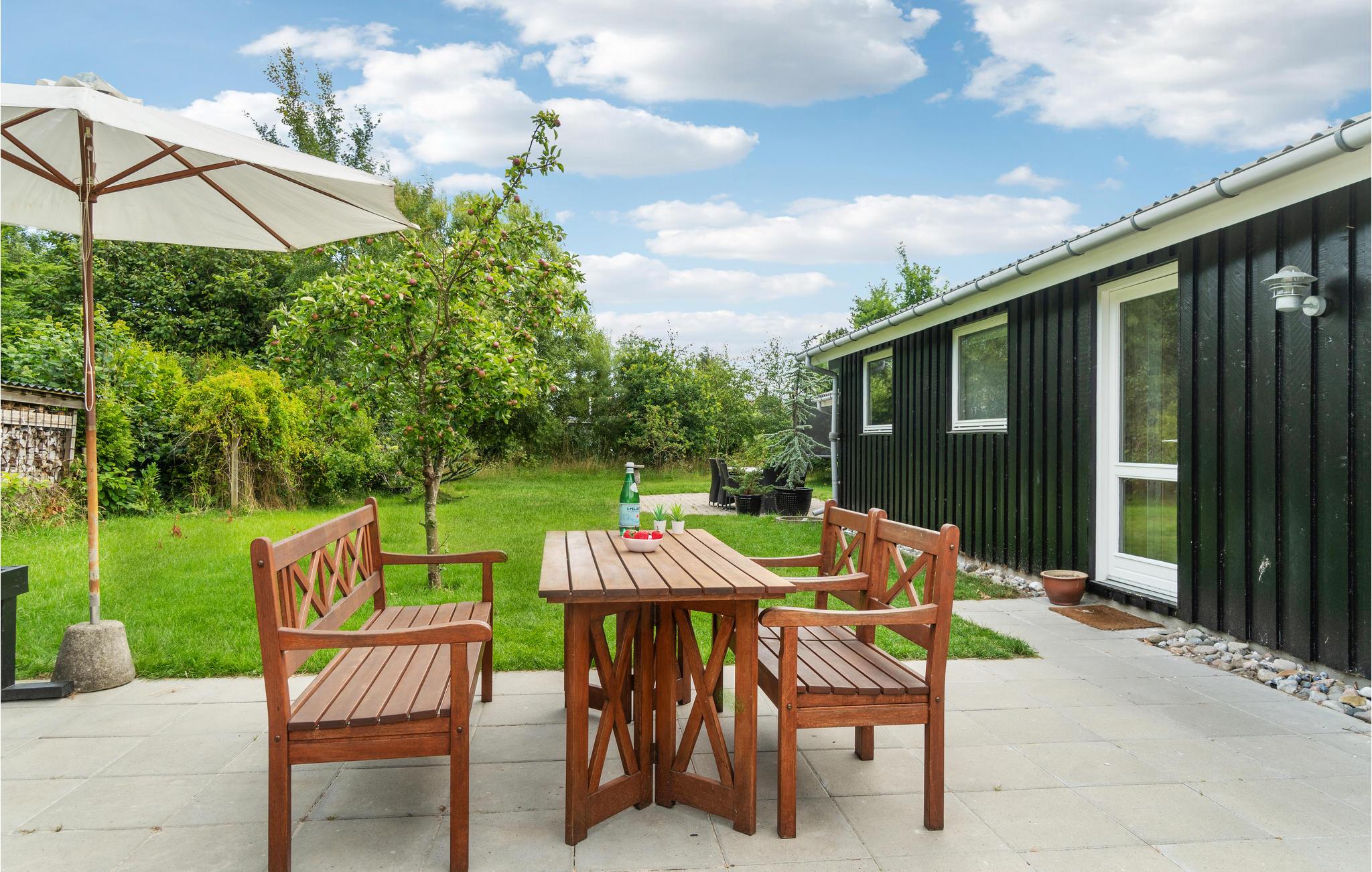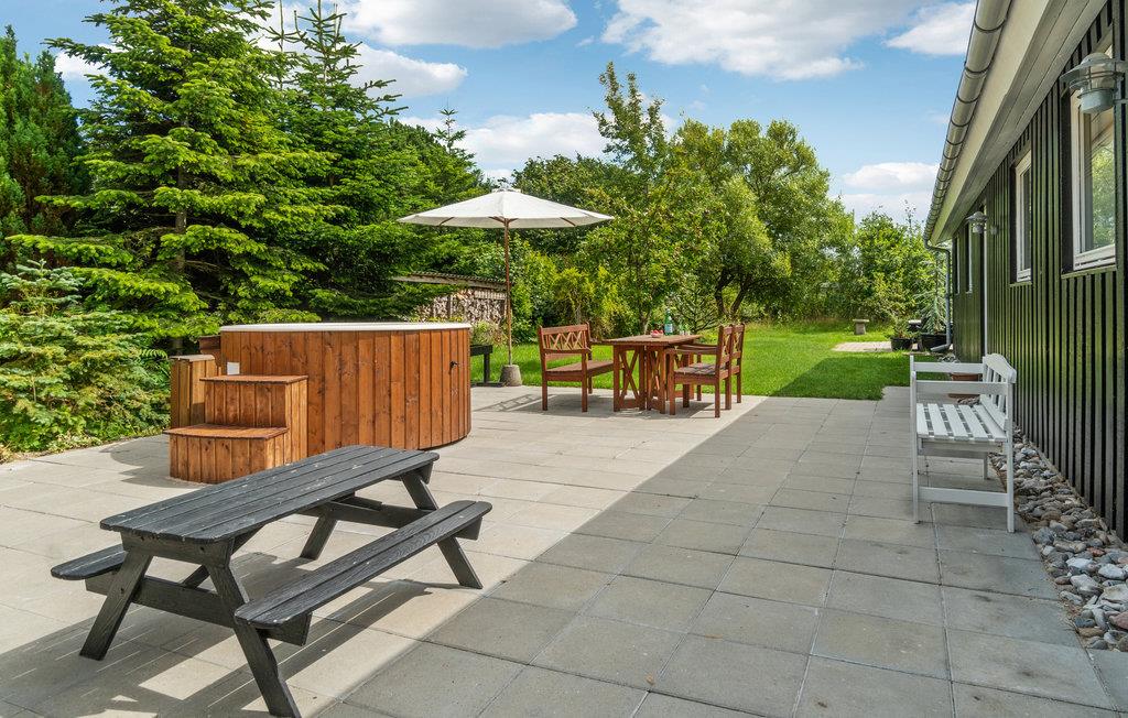 Til huset hører en fliseterrasse og en stor naturgrund, som er perfekt til børns leg og boldspil. På terrassen kan I sole jer fra liggestole, nyde feriens måltider ved spisepladsen eller bare sidde og læse en god bog, mens fuglene kvidrer. Bliver sommervarmen for meget, kan I køle af under udendørsbruseren, som også er perfekt til at skylle sandet af sig efter en strandtur; stranden ligger nemlig kun 600 meter fra huset og indbyder til badeture og fiskeri. Om aftenen kan I holde en hyggelig fælles grillaften og nyde en drink i vildmarksbadets dejligt varme vand.