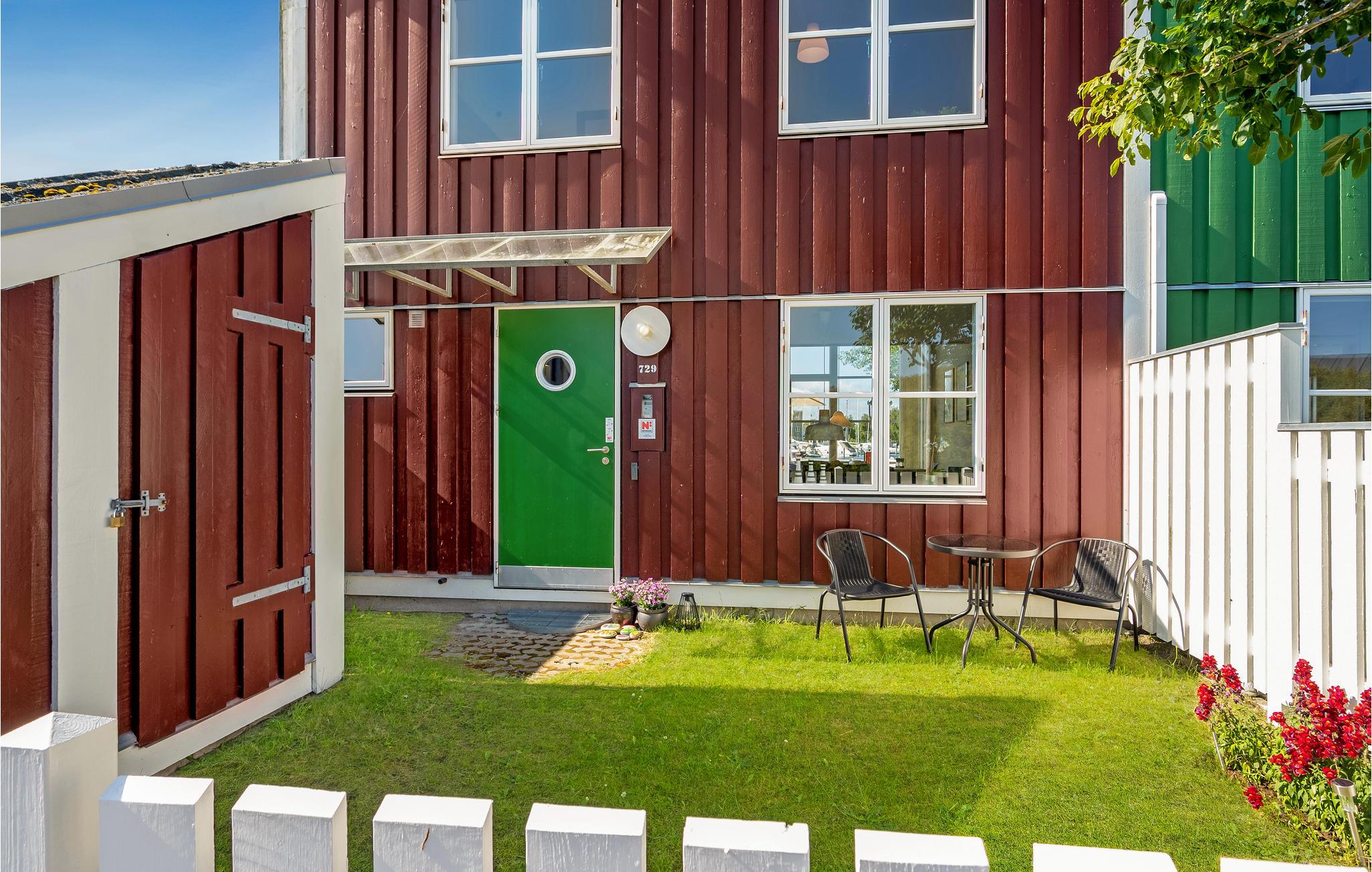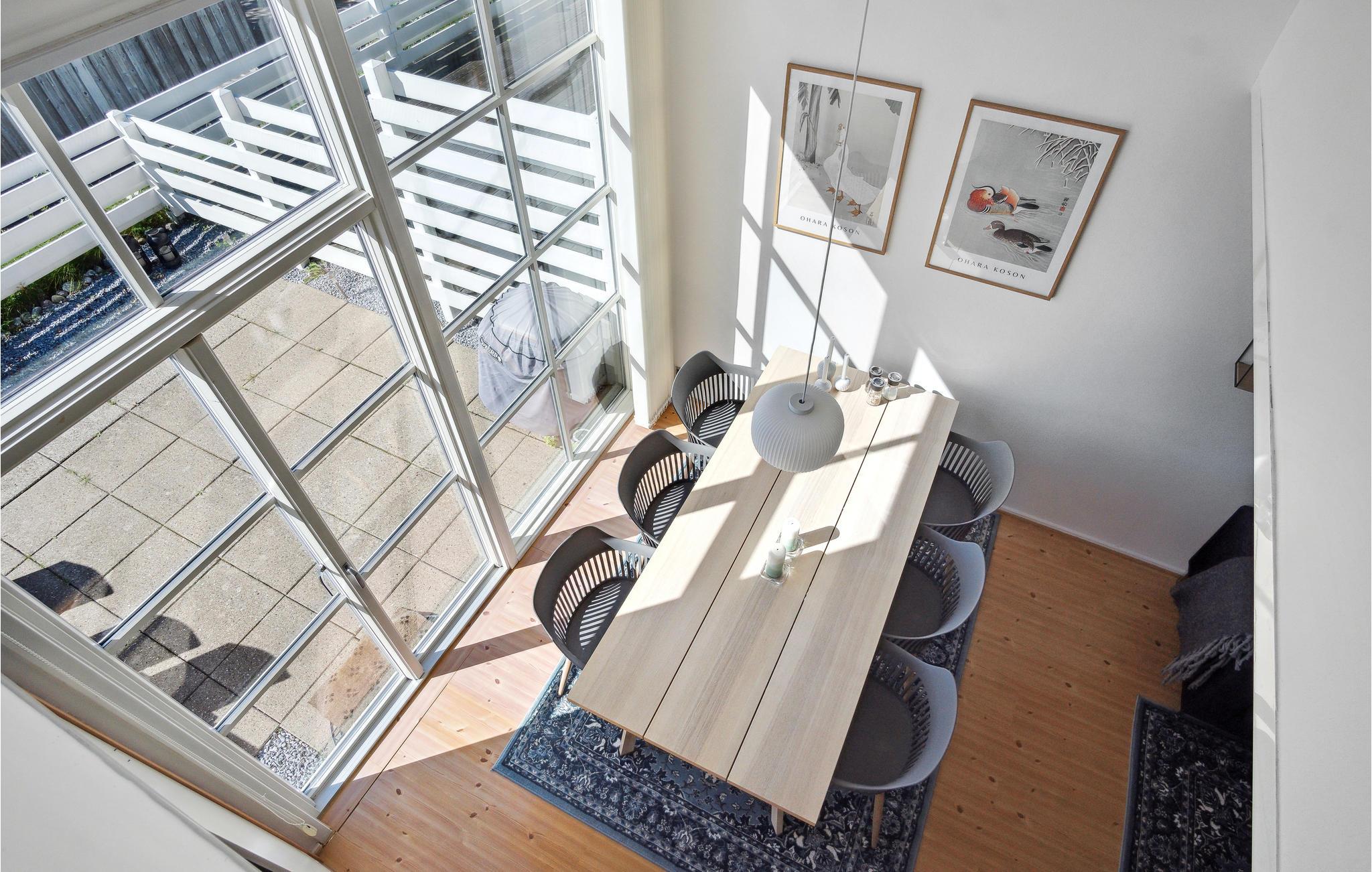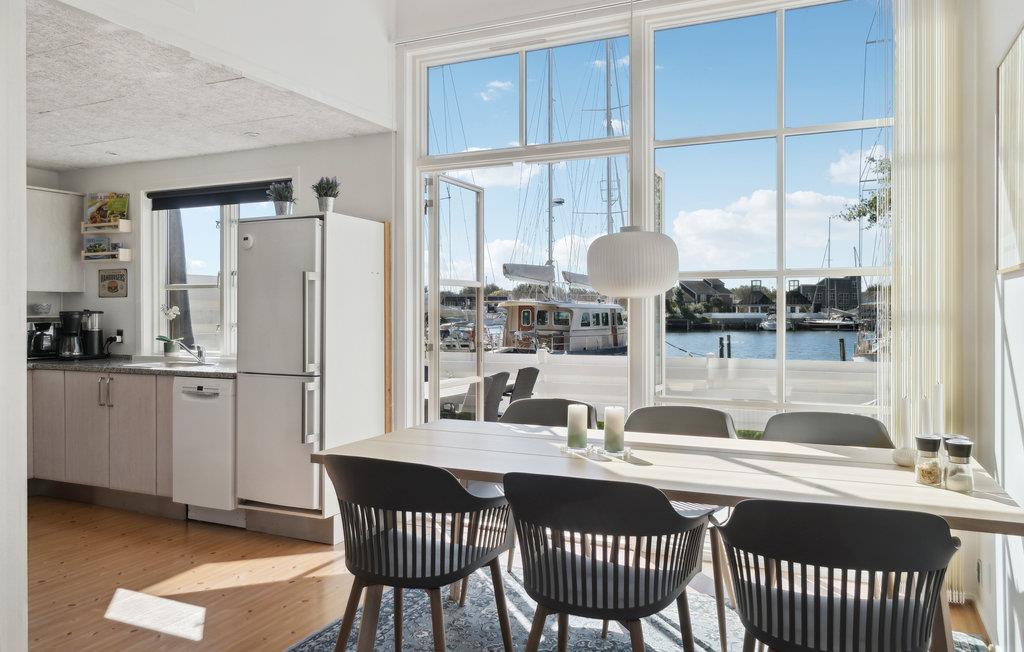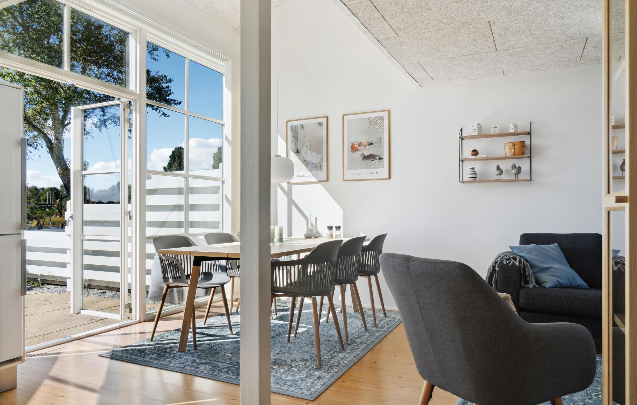 Det store spisebord bliver midtpunkt for feriens hyggelige måltider og lange spilaftener. Udendørs venter der en lille, lun terrasse, som har fantastisk udsigt til det helt specielle område, naturen og lystbådehavnen.