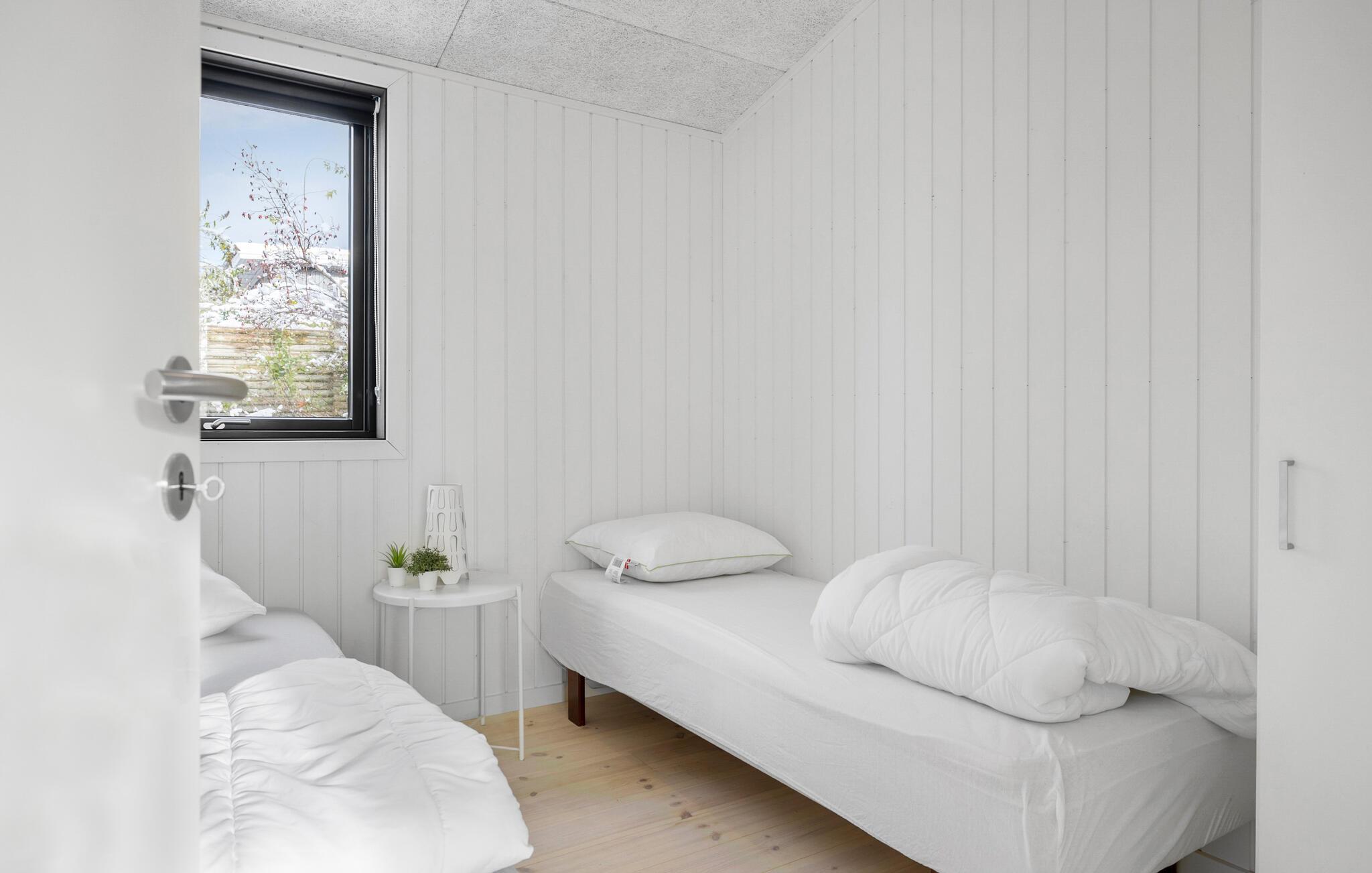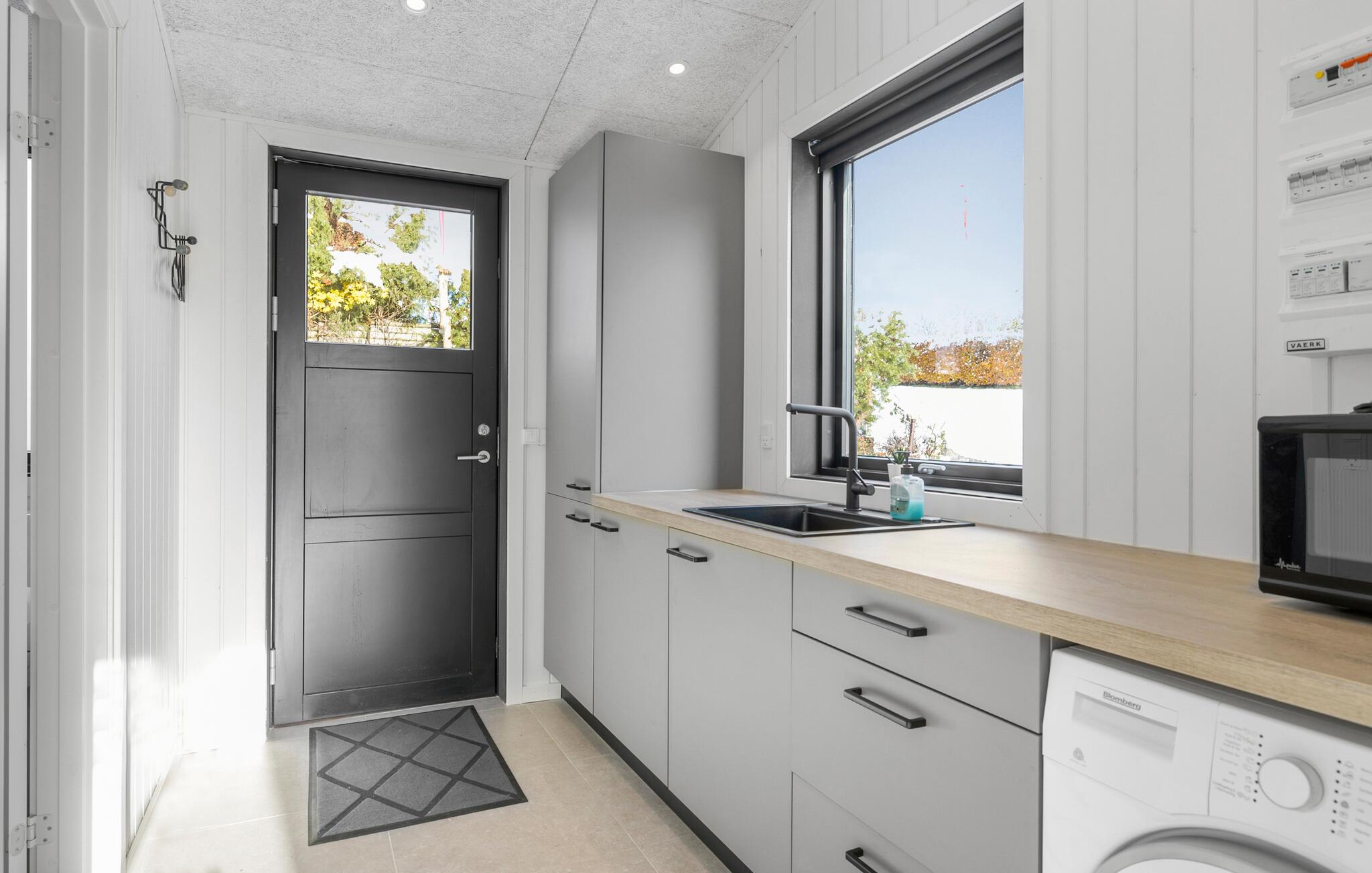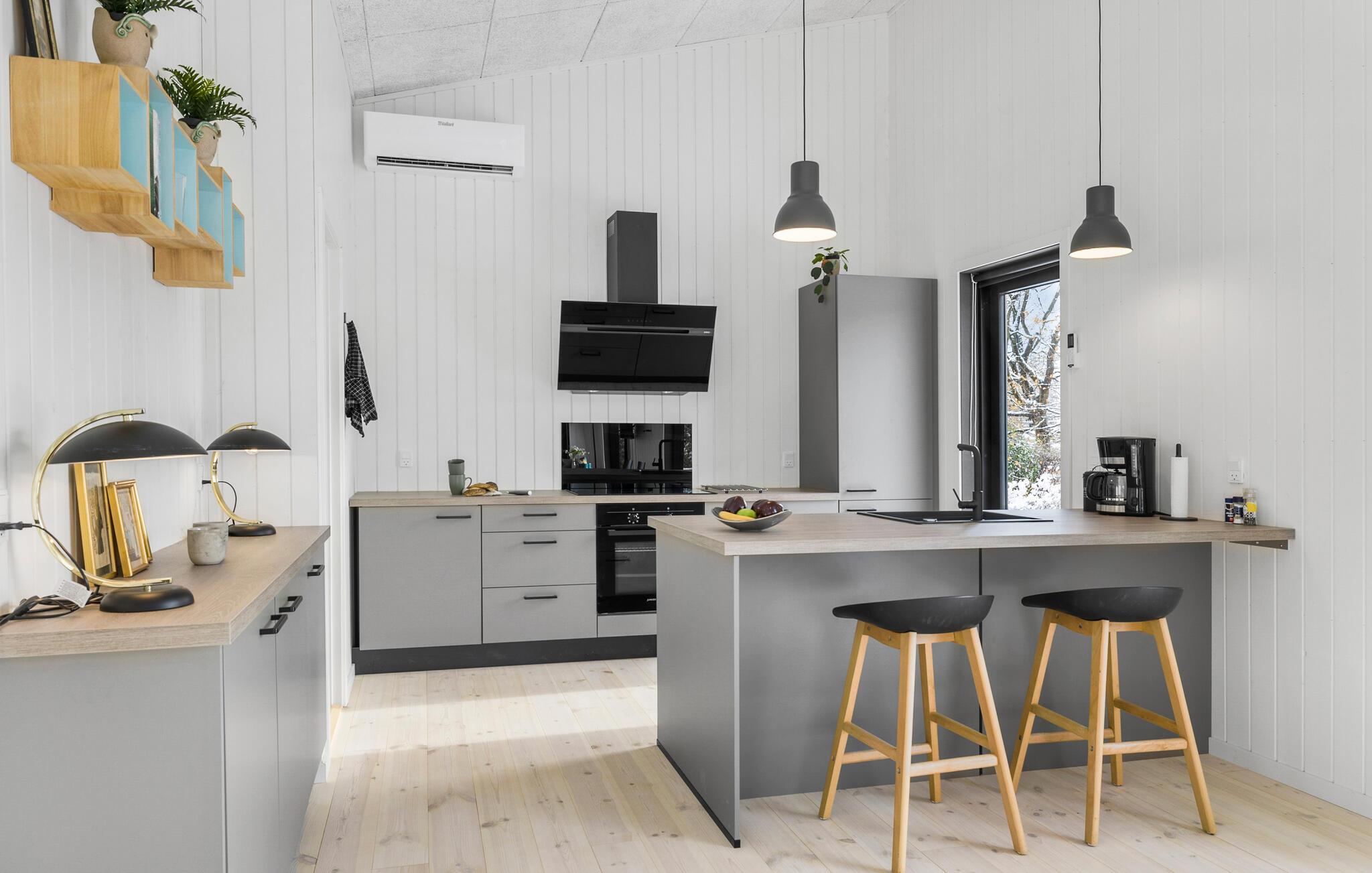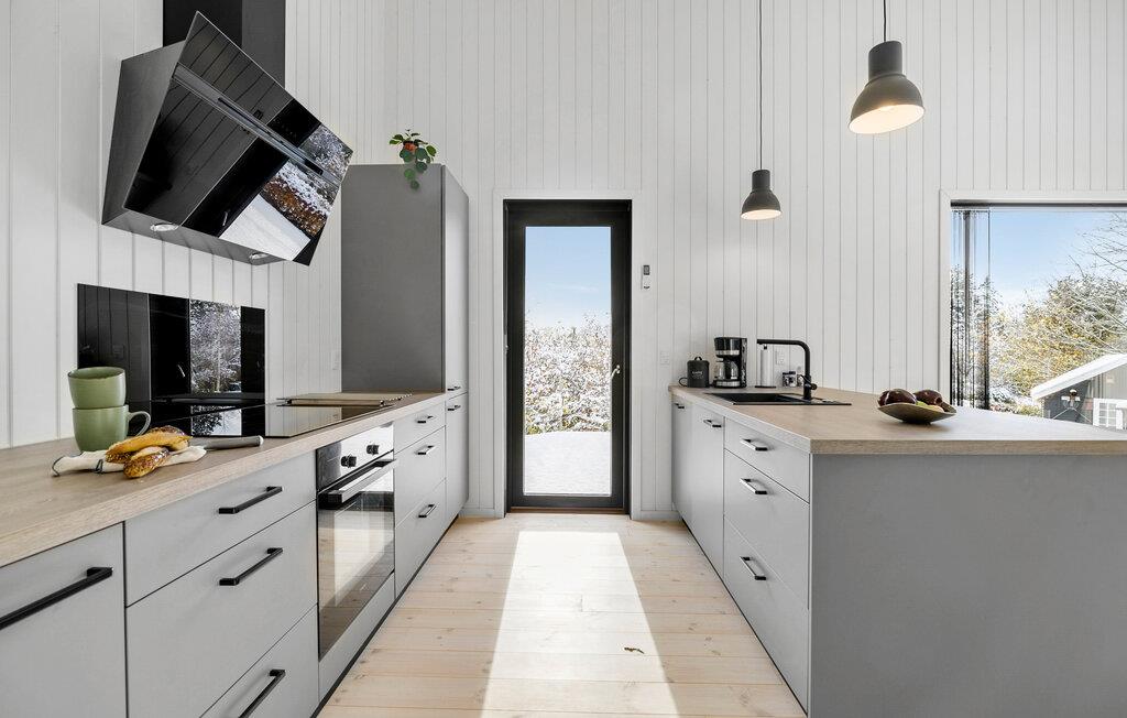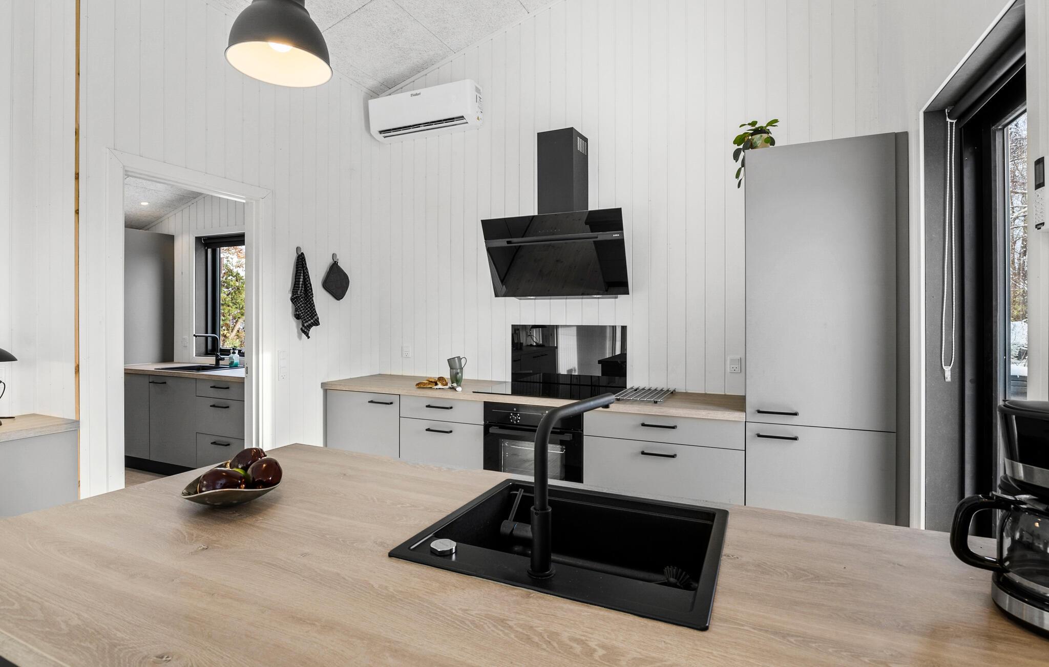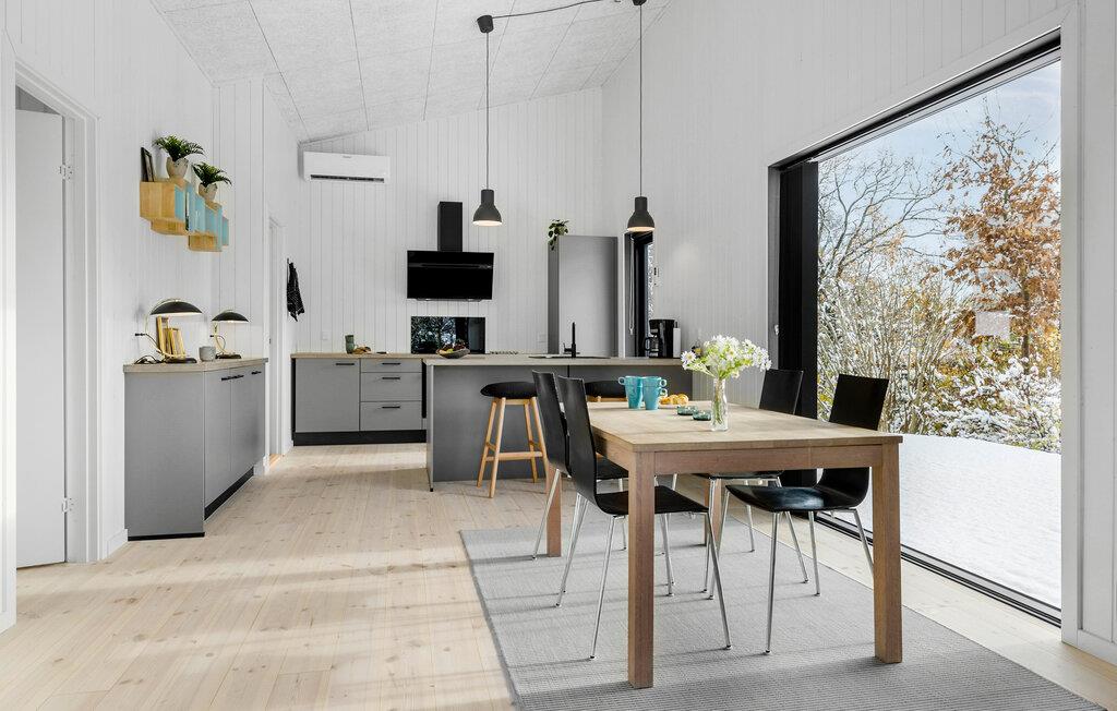 Dette smukke og lysfyldte feriehus tilbyder den perfekte kombination af komfort og stil. Det høje opholdsrum med åben planløsning forbinder køkken, spiseområde og stue og skaber en indbydende atmosfære, der gør det nemt at føle sig hjemme. Lav mad sammen, slap af i sofaen, eller nyd måltider på den store terrasse. Den rummelige have giver masser af plads til børnenes leg og lader jer komme tæt på naturen.