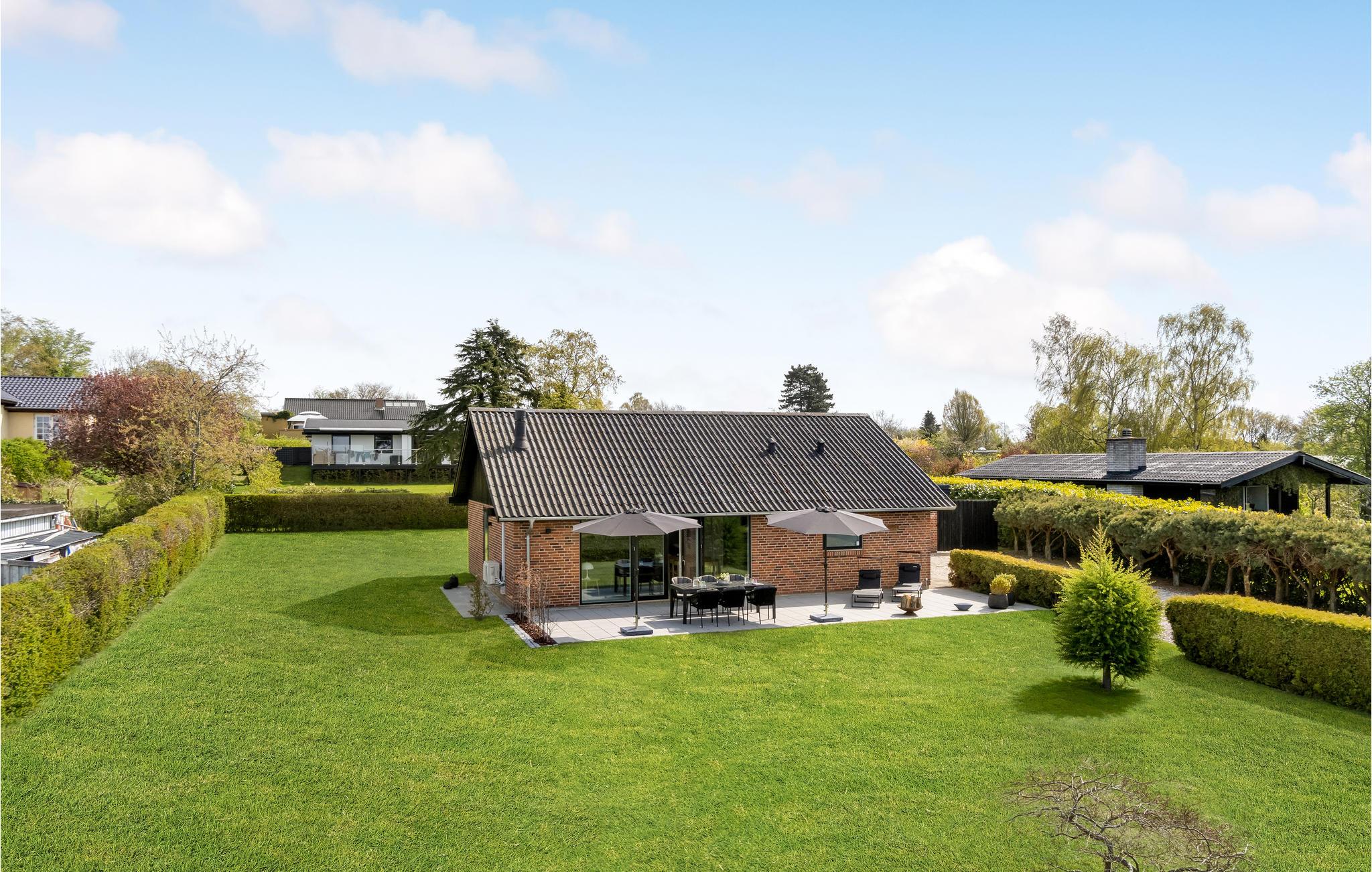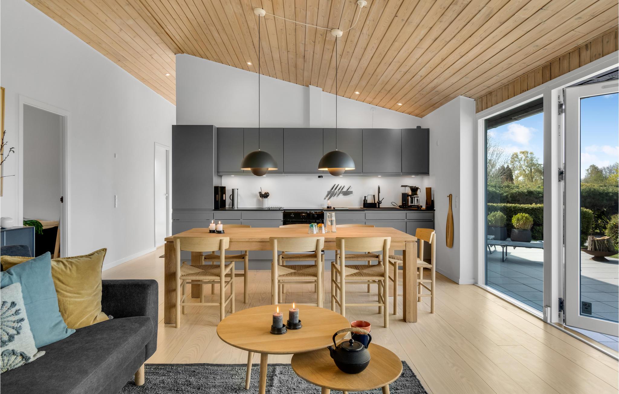 Velkommen til Ølsted Strand, hvor I kan nyde nogle dejlige feriedage uden andre aktiviteter end dem, I sætter jer for. Rammen om jeres ophold bliver denne velindrettede villa, som er lækkert og moderne indrettet med smarte faciliteter hele vejen rundt. Giv jer god tid til madlavningen i det åbne køkken, som har god forbindelse til børnene, som har sat sig ved spisebordet, i sofaen eller spiller Ludo på terrassen. I årets kølige måneder kan I samles til hygge i stuen med ild i brændeovnen efter en lang dag på farten. Gulv til loft-vinduerne får opholdsrummet til at smelte sammen med haven, så man også har en følelse af at sidde i de grønne omgivelser på en kold dag.
