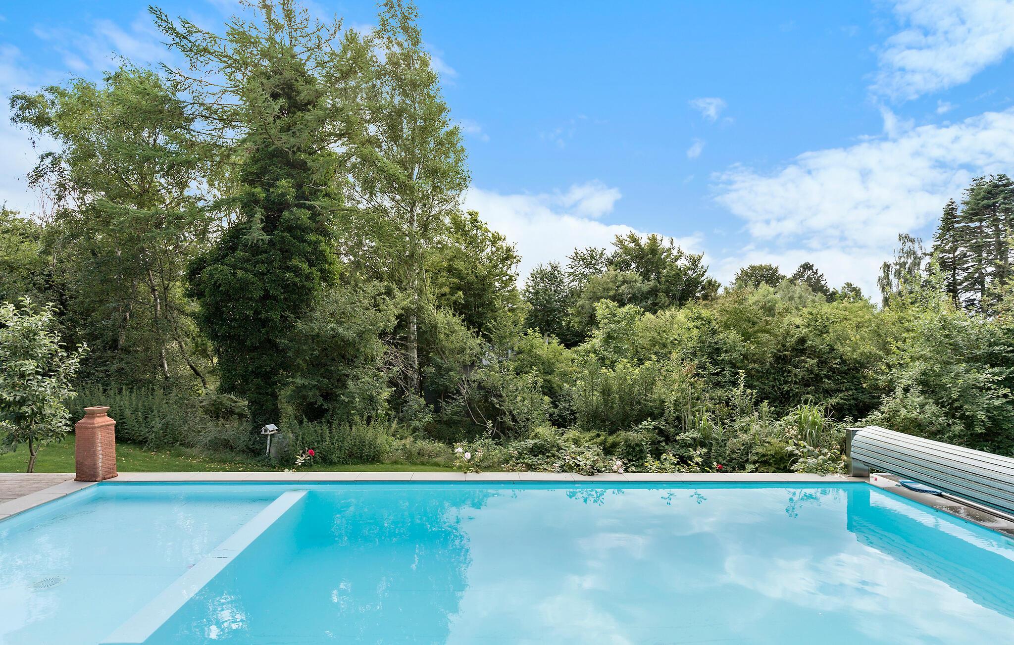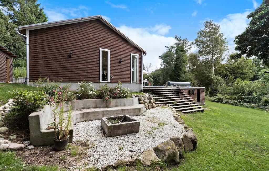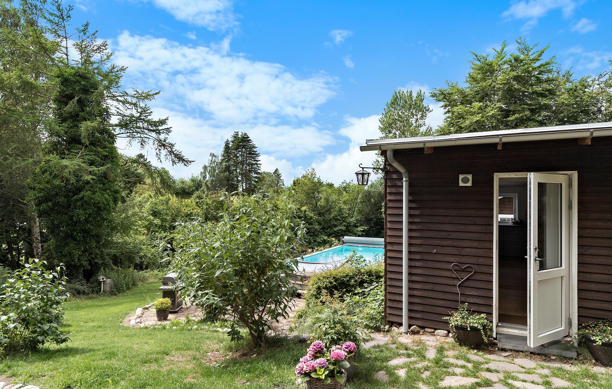 Stilfuldt poolhus ved Ølsted Strand med stor terrasse og grøn have for afslapning og naturoplevelser.