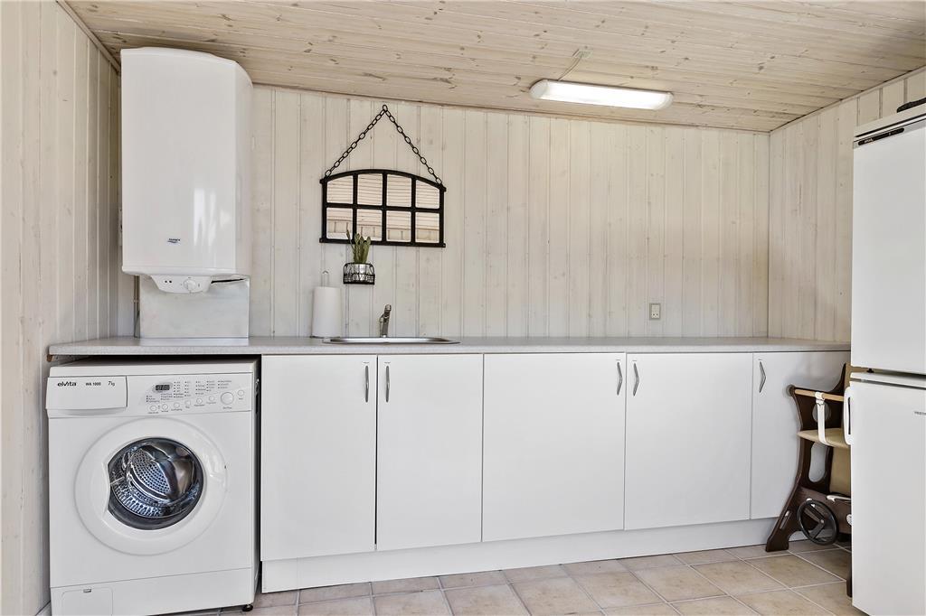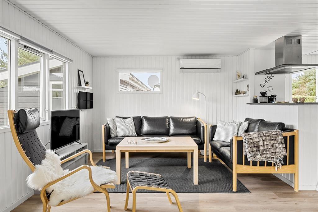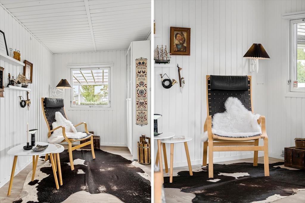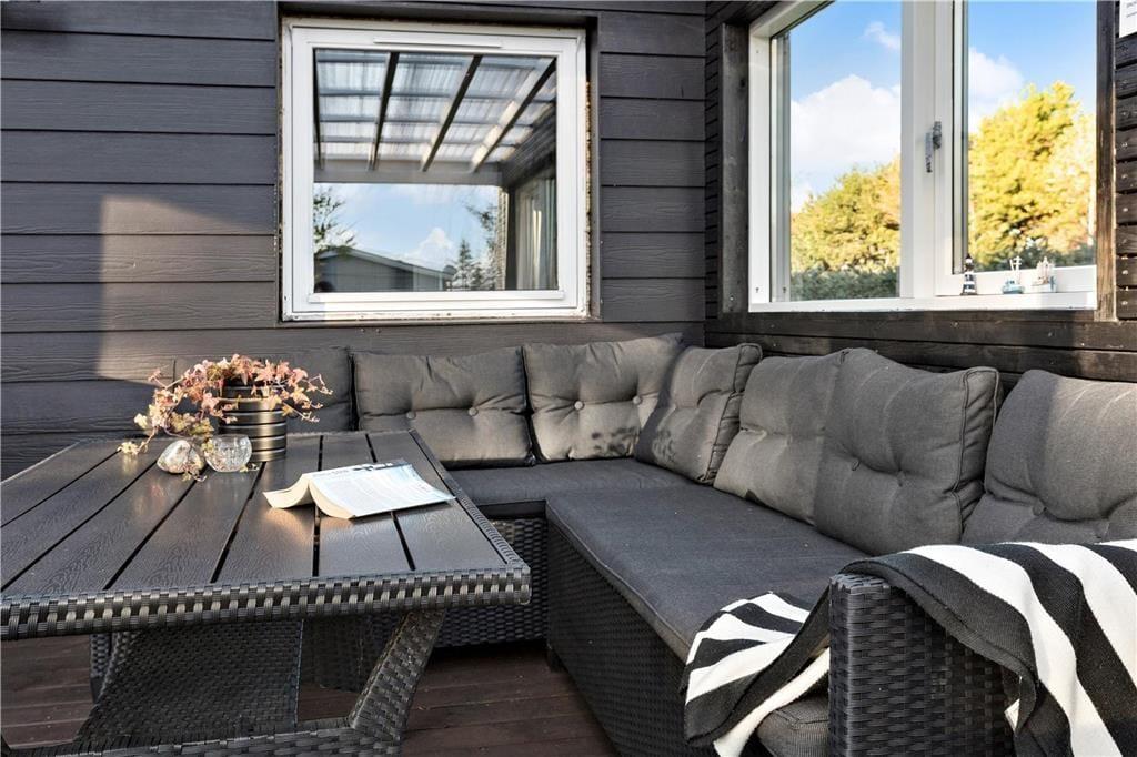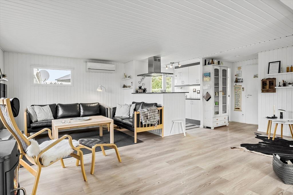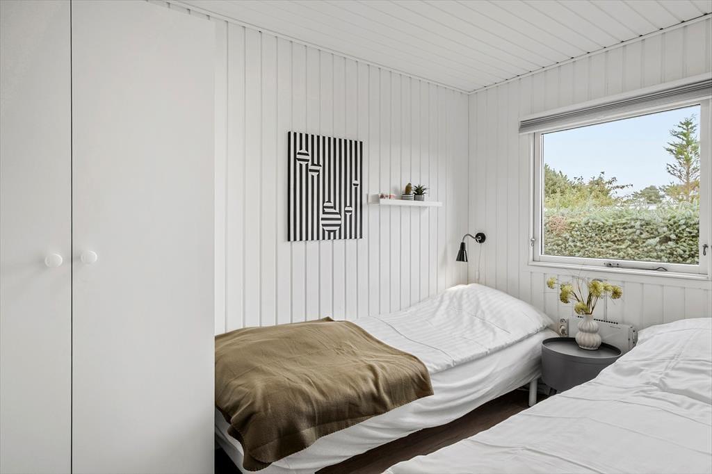 Dette sommerhus tilbyder aldeles gode rammer for familiens næste ferie i Nordjylland. Hovedhuset består af et stort og åbent køkken-alrum, 2 gode værelser med hhv. dobbeltseng og to enkeltsenge og et badeværelse med brusekabine. I det tilhørende anneks er et vaskerum og endnu et soveværelse; her er godt til familiens større børn, og bruger man ikke denne afdeling, kan man spare lidt på opvarmningen. Indretningen er holdt i en sort/hvid stil, brudt af små klare farvepletter i stuen og i spisehjørnet. Sommerhuset har desuden brændeovn og trådløst internet, så viser vejret sig en dag fra den grå og kedelige side, kan man hygge sig i varmen med et spil eller en film på sin medbragte pc eller tablet.