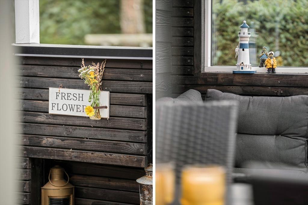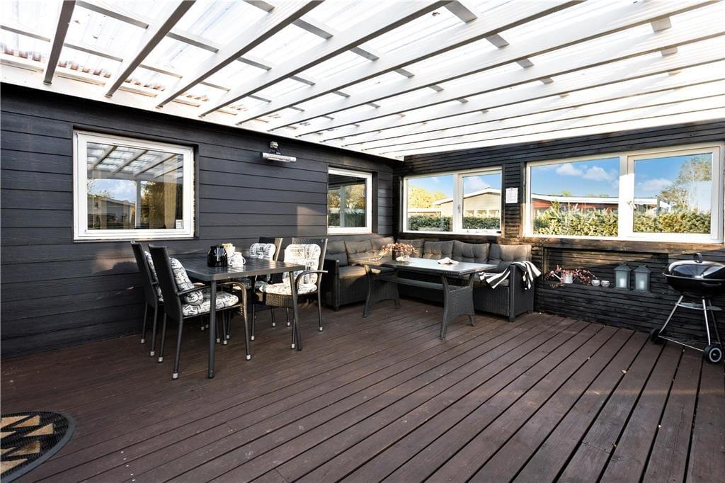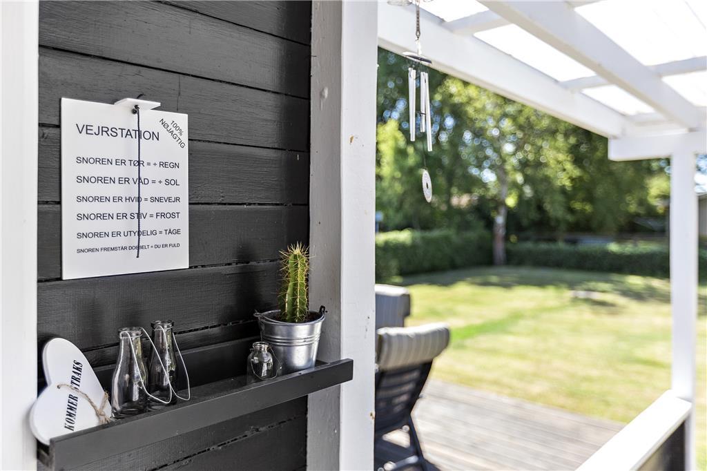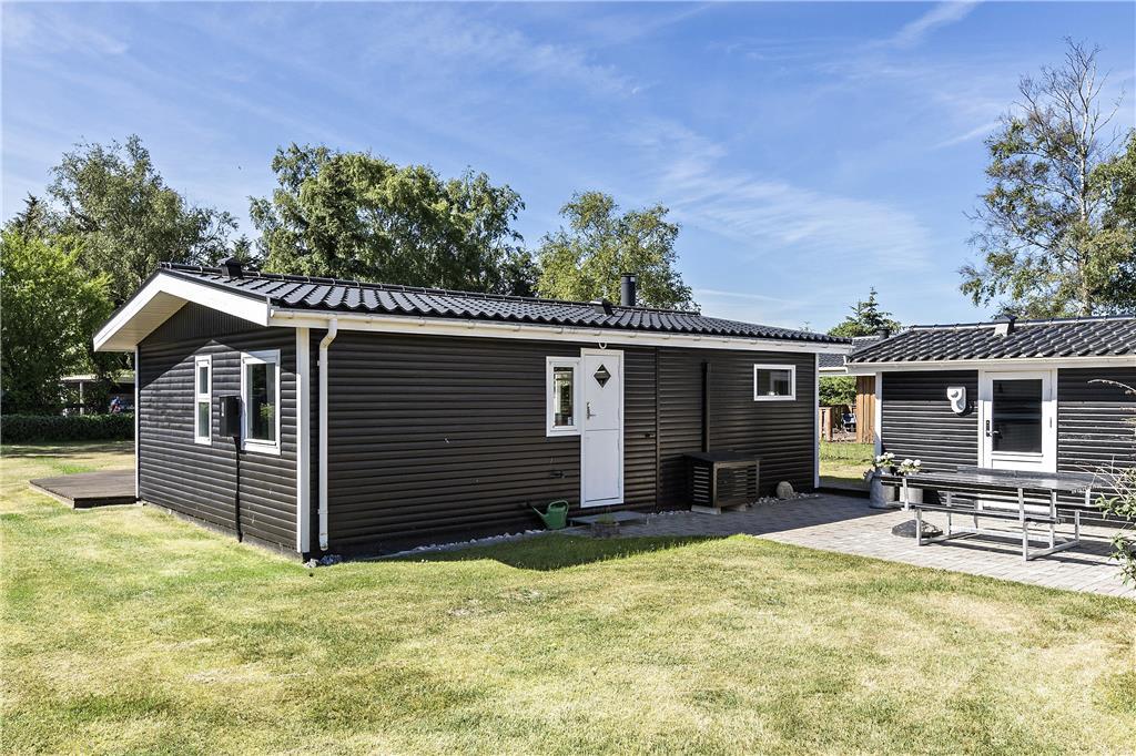 Sommerhuset ligger på en flot havegrund omkranset af en hæk, som sikrer privatlivets fred. Mellem hovedhuset og annekset finder man en åben fliseterrasse. Så alle muligheder for at nyde den danske sommer med solbadning, leg i haven og lækre grillmåltider er fuldt ud til stede her.