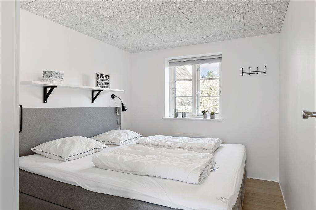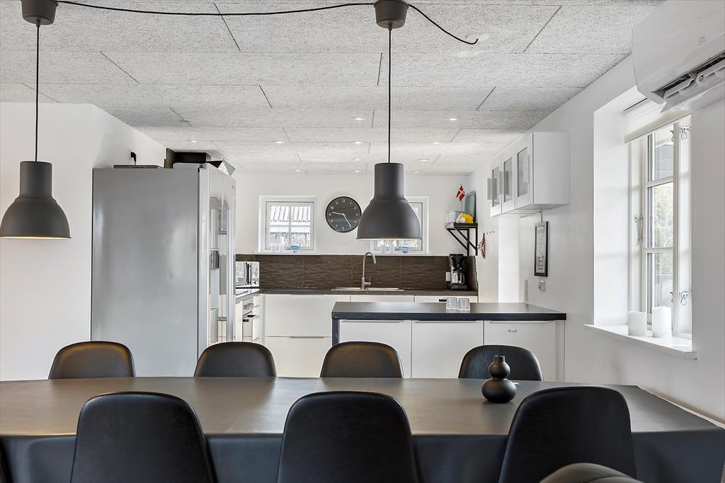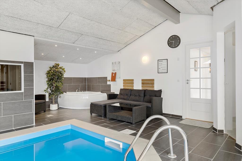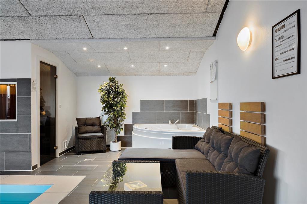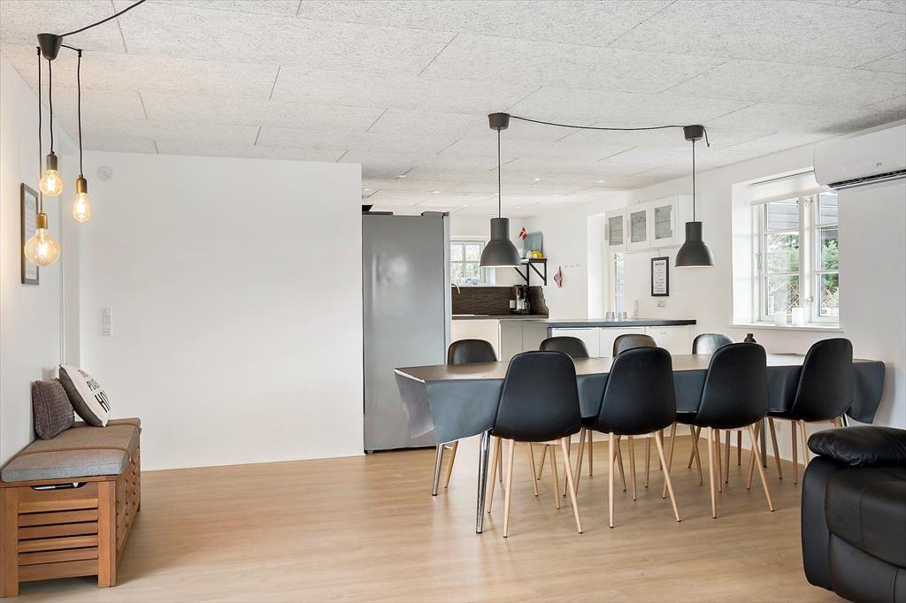 Sommerhuset er renoveret i 2021, så det fremstår særdeles flot og indbydende. Interiøret er holdt i diskrete farvetoner, så rammen om indendørslivet er skandinavisk og stilren, mens detaljer som stuens brændeovn skruer op for hyggefaktoren. Køkken og stue ligger i åben forbindelse på velfungerende vis, og derudover består planløsningen af to badeværelser og tre soveværelser med i alt otte sengepladser. En entré med vaskefaciliteter rummer sommerhuset også, og endelig er der poolafdelingen, som er lækkert indrettet med pool, spabad og sauna.
