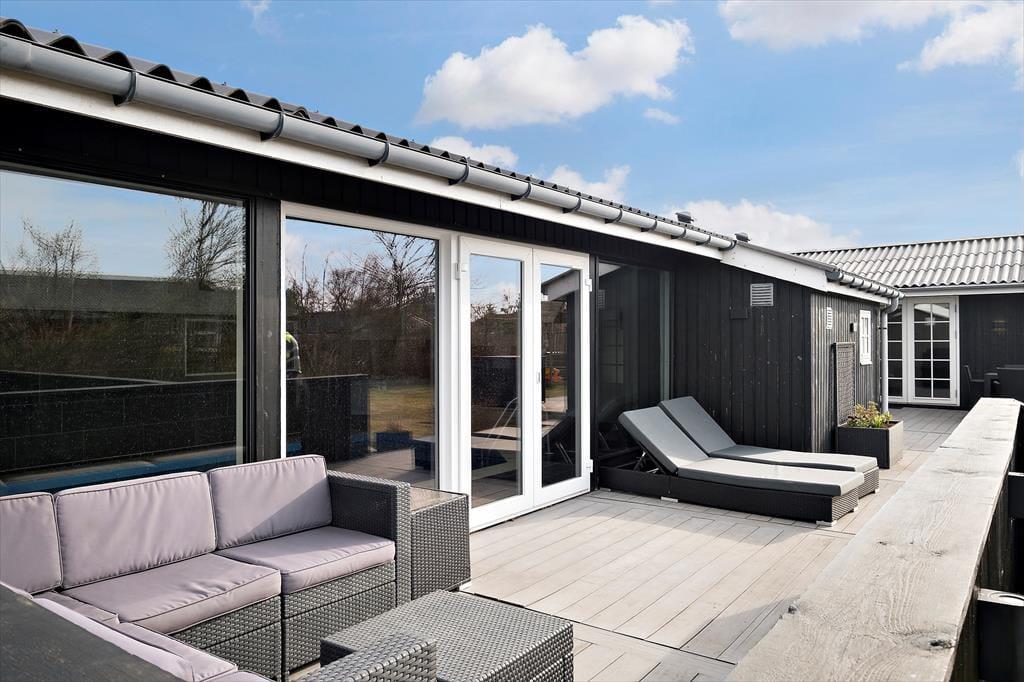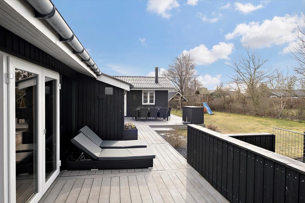 Fra både stuen og poolafdelingen har I direkte adgang til en stor, sydvendt terrasse, så I nemt kan smutte ud for at slikke sol og spise frokost i det fri. På østsiden af sommerhuset ligger også en delvist overdækket træterrasse, der egner sig glimrende til morgenkaffe og brunch i roligt tempo. Skal der lidt mere fart over feltet, er der god plads til at lege, spille havespil og boltre sig på græsplænen på den lukkede grund.