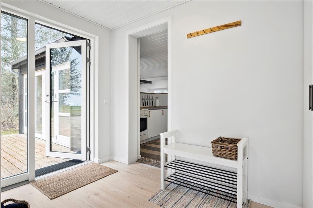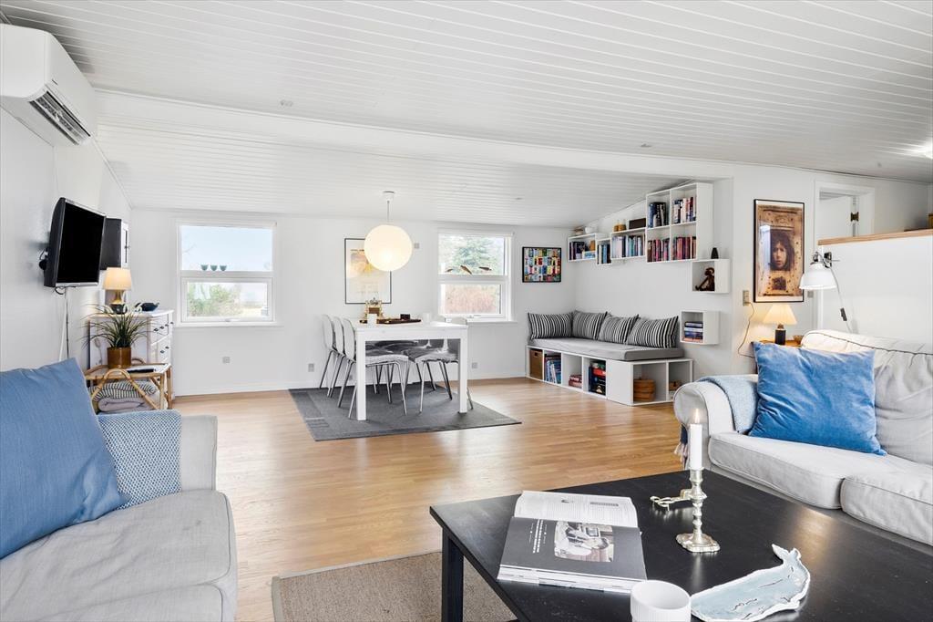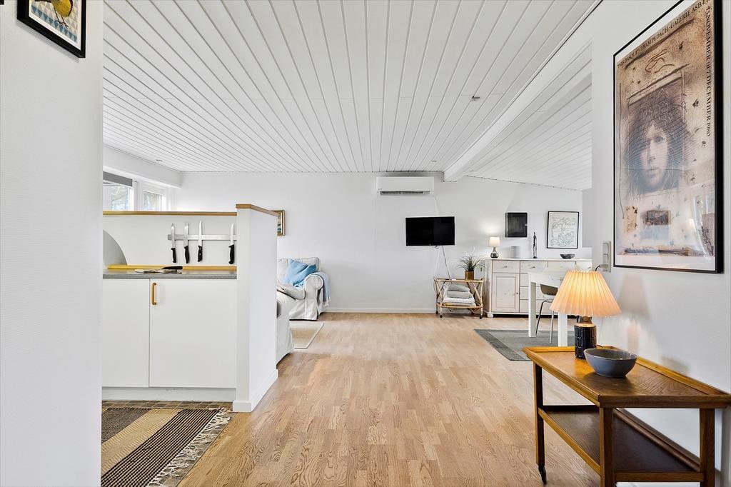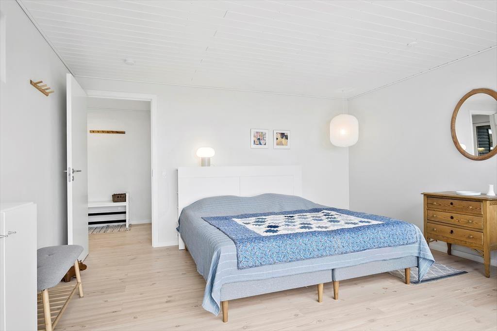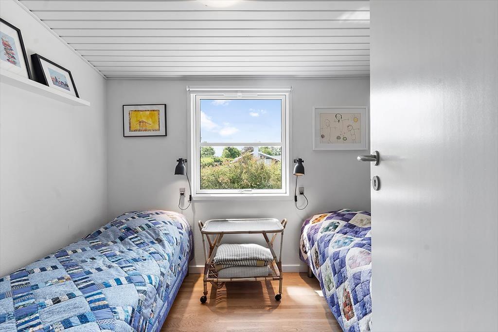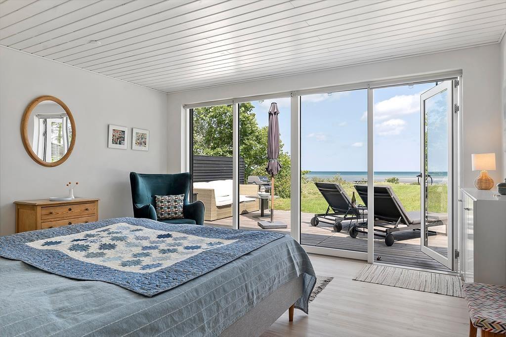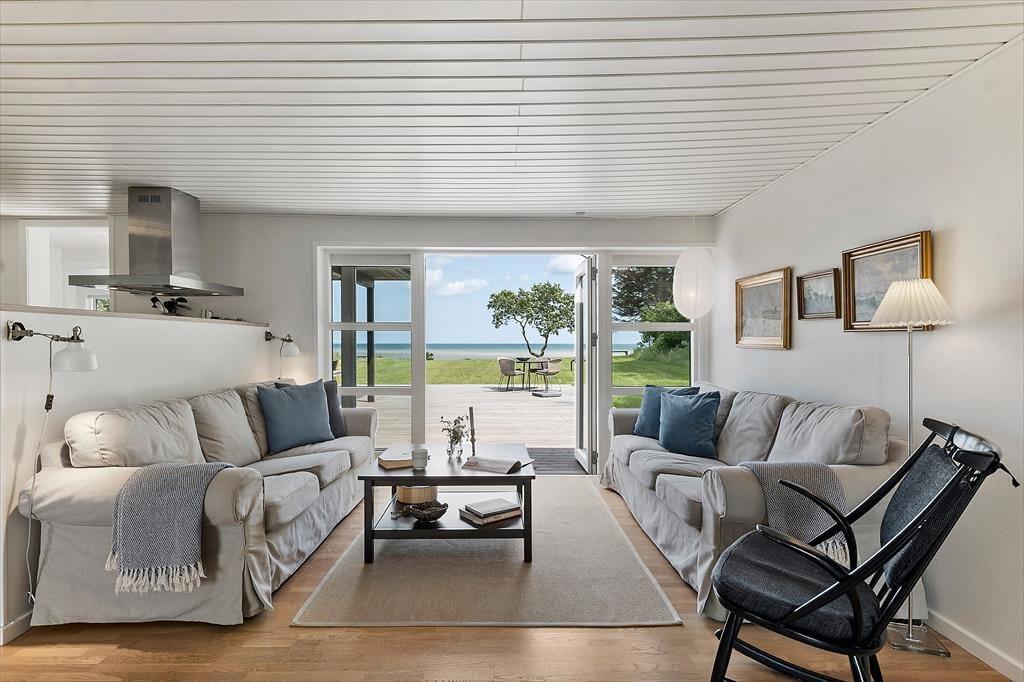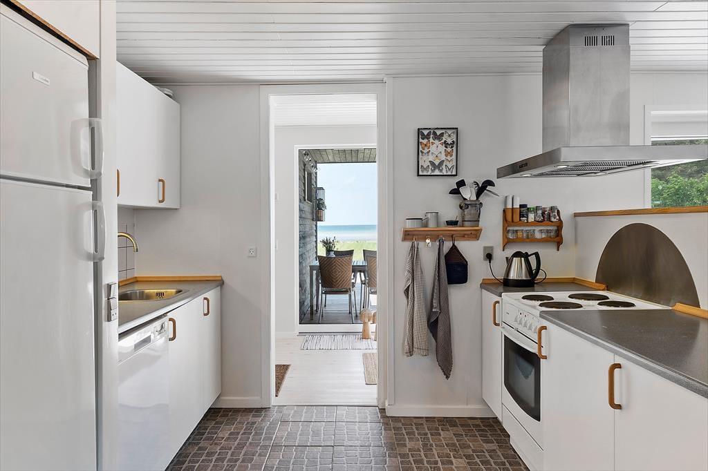 Huset byder på to soveværelser, som vender væk fra havet og et der har udsigt til vandet.! Så der kan godt blive kamp om værelserne. Når man så skal begive sig ind i stuen eller køkkenet, kan man jo lige så godt sætte kaffemaskinen i gang med at brygge morgenkaffen.