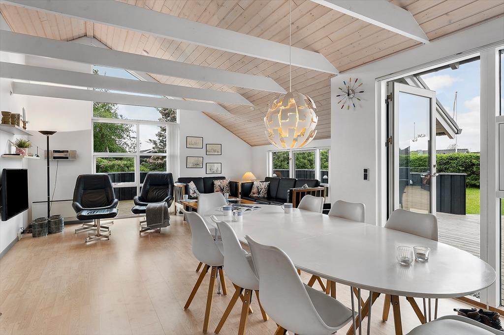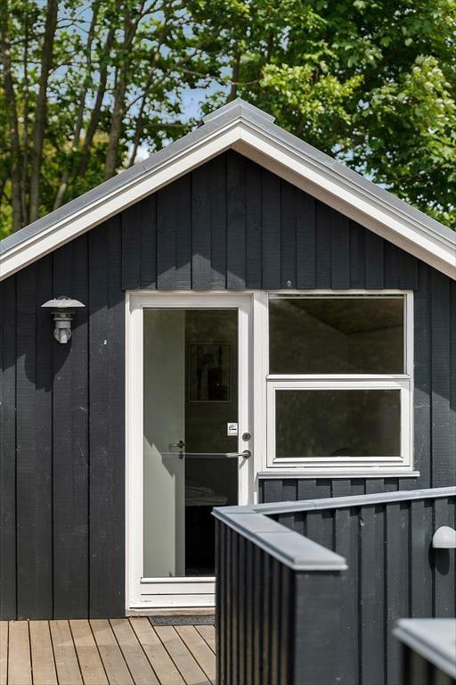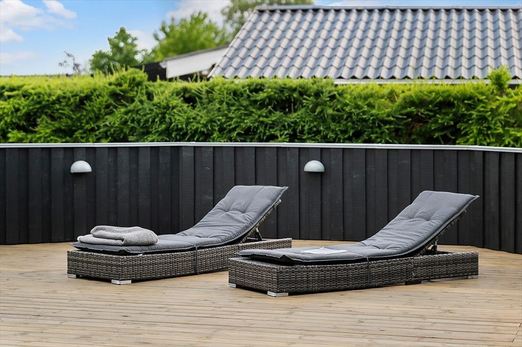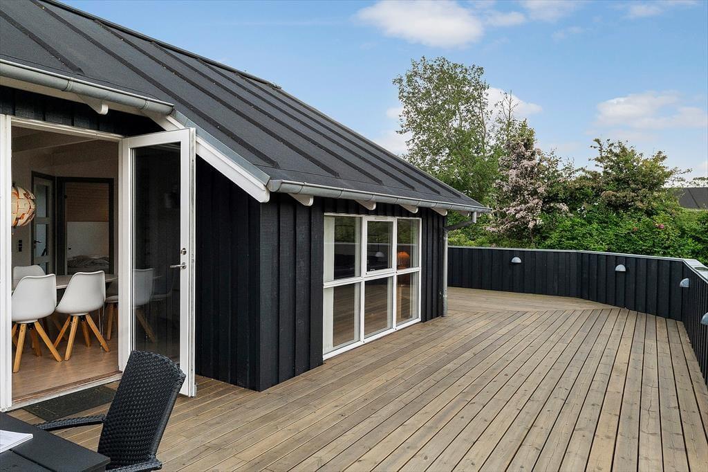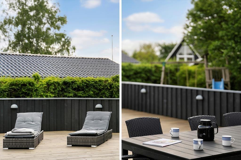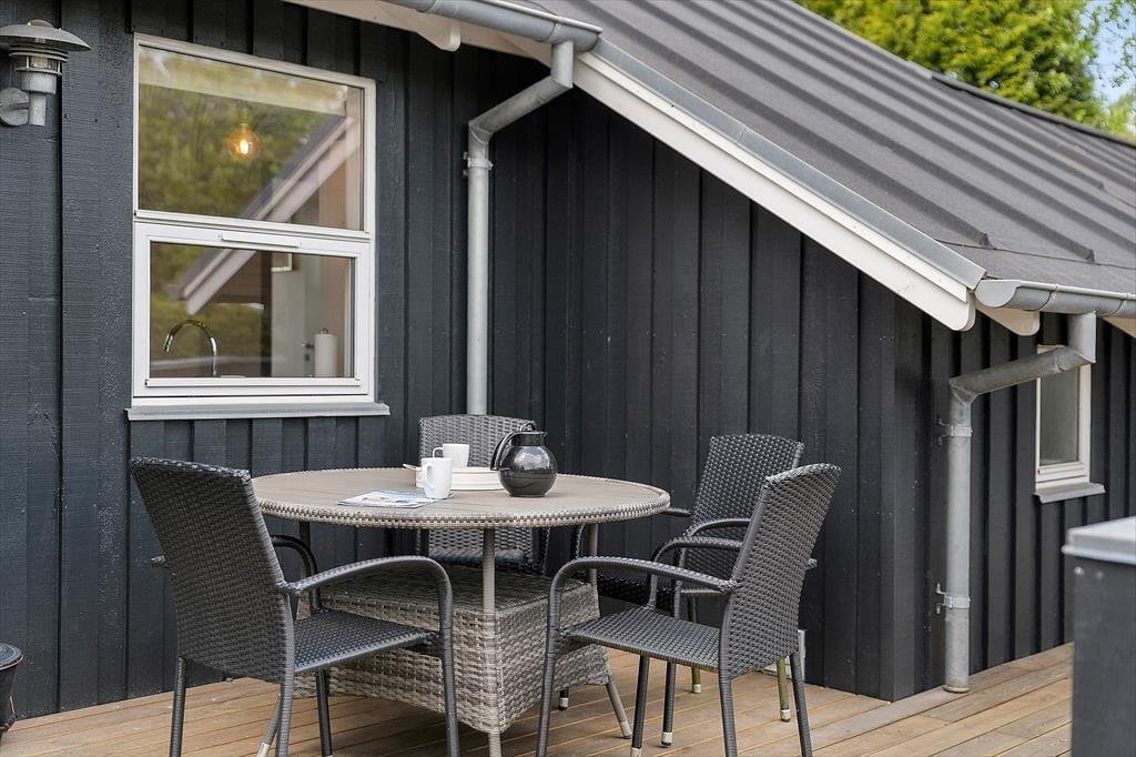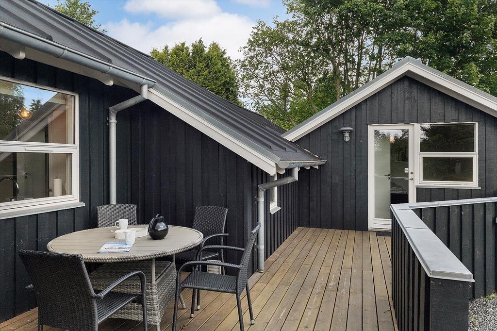 Sommerhuset ligger på en flot grund, men det er så absolut terrassen, som omkranser det meste af huset, der er værd at bemærke. Her er altid mulighed for at finde en plads i solen eller på de mere blæsende dage, en plads i læ. Der er udgang til det store terrasse fra spiseafdelingen så en god middag og åbn en god flaske vin eller frugtsaft så kan I glæde jer til en hyggelig aften i det fri.