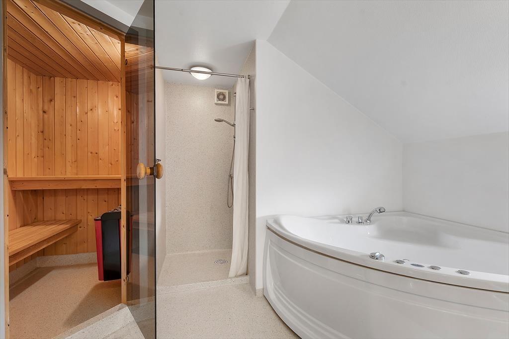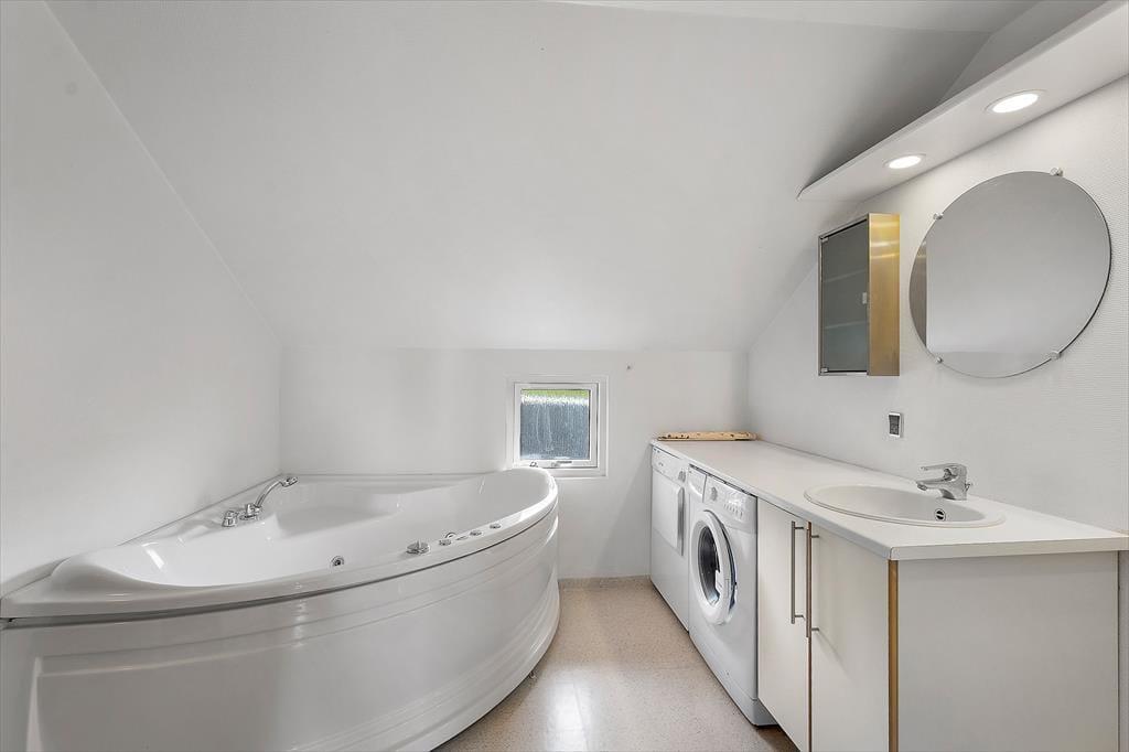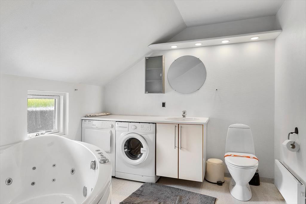 Køkkenet er godt udstyret med alt, hvad man kan tænke sig, og her er naturligvis opvaskemaskine, komfur med keramiske kogeplader og et køle-fryseskab. I huset er badeværelset udstyret med spa og sauna og så naturligvis også en bruseniche. På badeværelset er der også vaskemaskine og tørretumbler, så du kan sagtens holde en lang ferie her i huset.