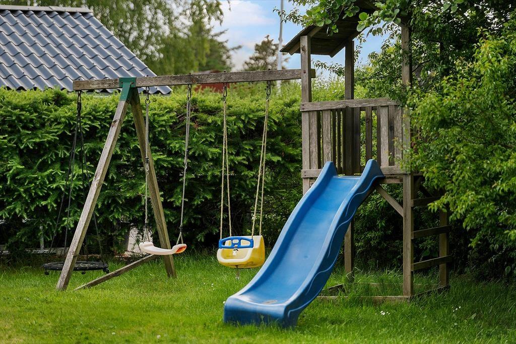 For de mindste gæster i familien, er der et godt klatretårn på græsplænen med sansegynge, babygynge, rutsjebane og udsigtstårn og så kan mor og far ligge og slappe af på liggestole og holde øje med børnene imens.
