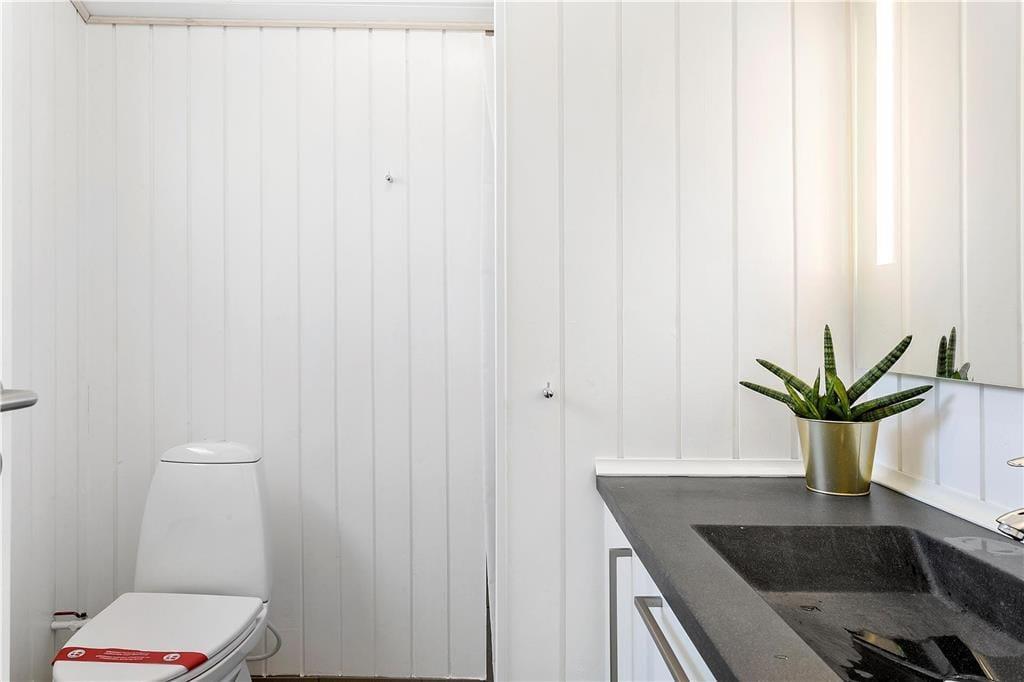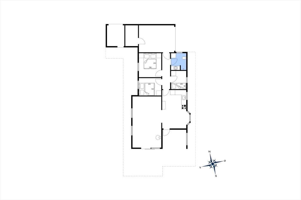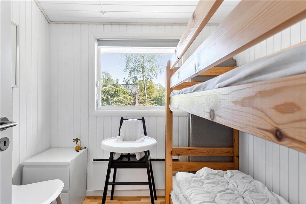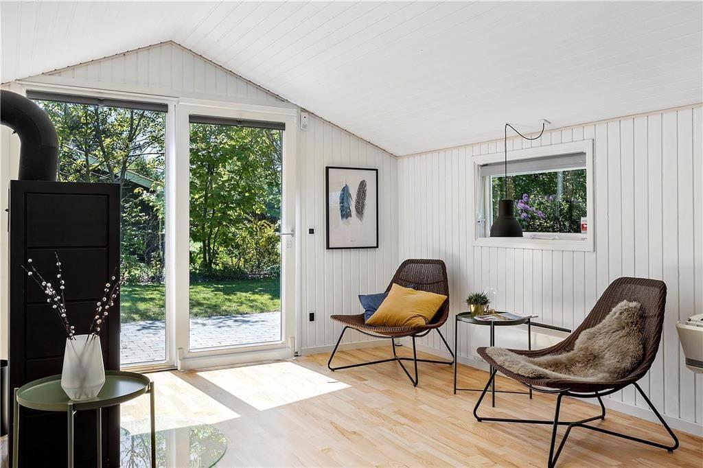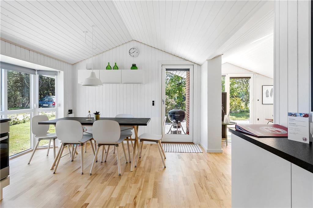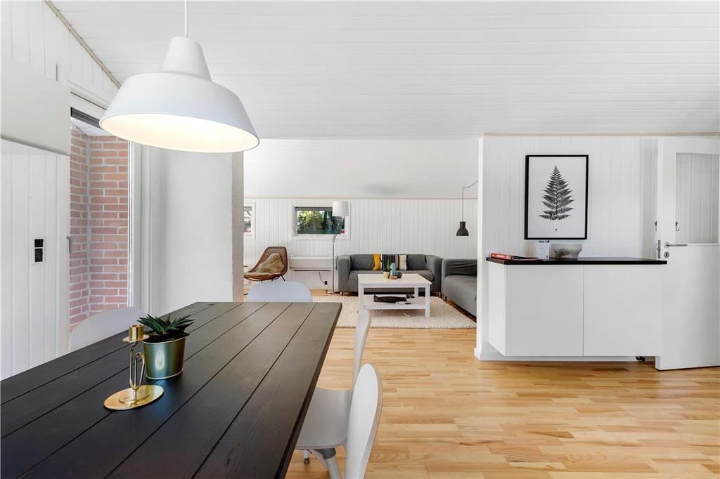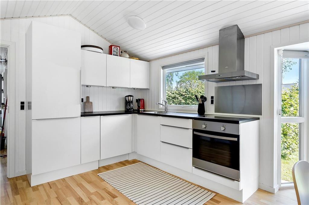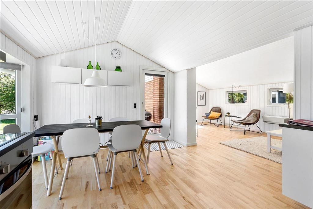 Det åbne køkken , der ligger i direkte forbindelse med stuen og spisekrogen, er perfekt og moderne indrettet. Her findes alt, der skal bruges, for at tilberede maden til hele famileien. Stuen der fremstår meget lyst, har store vinduer og inbyder til hyggeaftenenr foran brændeovn. Her kan familien samles til spil eller afslapning foran TV. I huset er der tre soverum , to med dobbelseng og et med køjesenge. Badeværelset er moderne indrettet og gulvvarmen spreder en dejlig varme. Fra stuen kommer man ud på en delvis overdækked terasse .