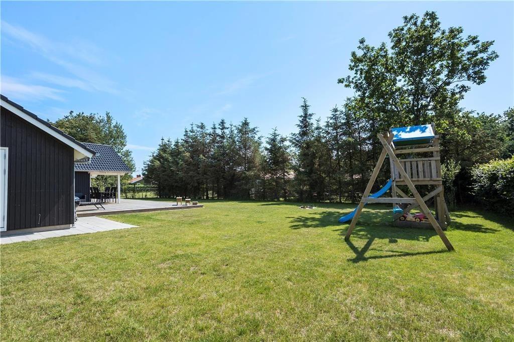 Sommerhuset ligger på en 933 m2 stor grund, der er flot anlagt med græsplæne, legefaciliteter, et grusareal til parkering og terrasser vendt mod flere verdenshjørner. Den sydvendte, delvist overdækkede træterrasse er et skønt sted at nyde solskinsvejr, grillmiddage og godt selskab, med mindre I hellere vil hygge jer ved bålstedet med snobrød og pølser.