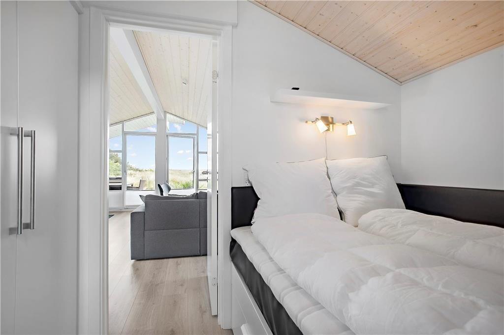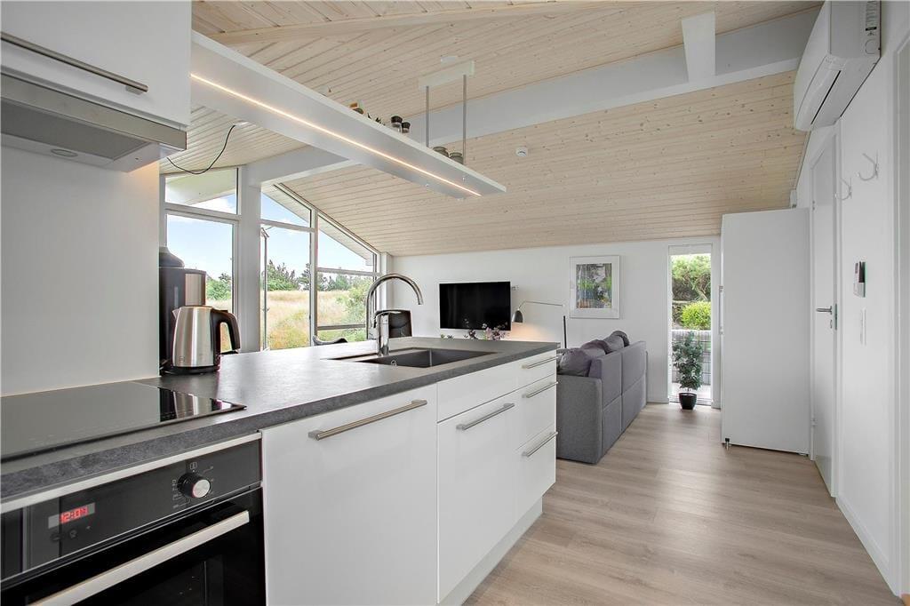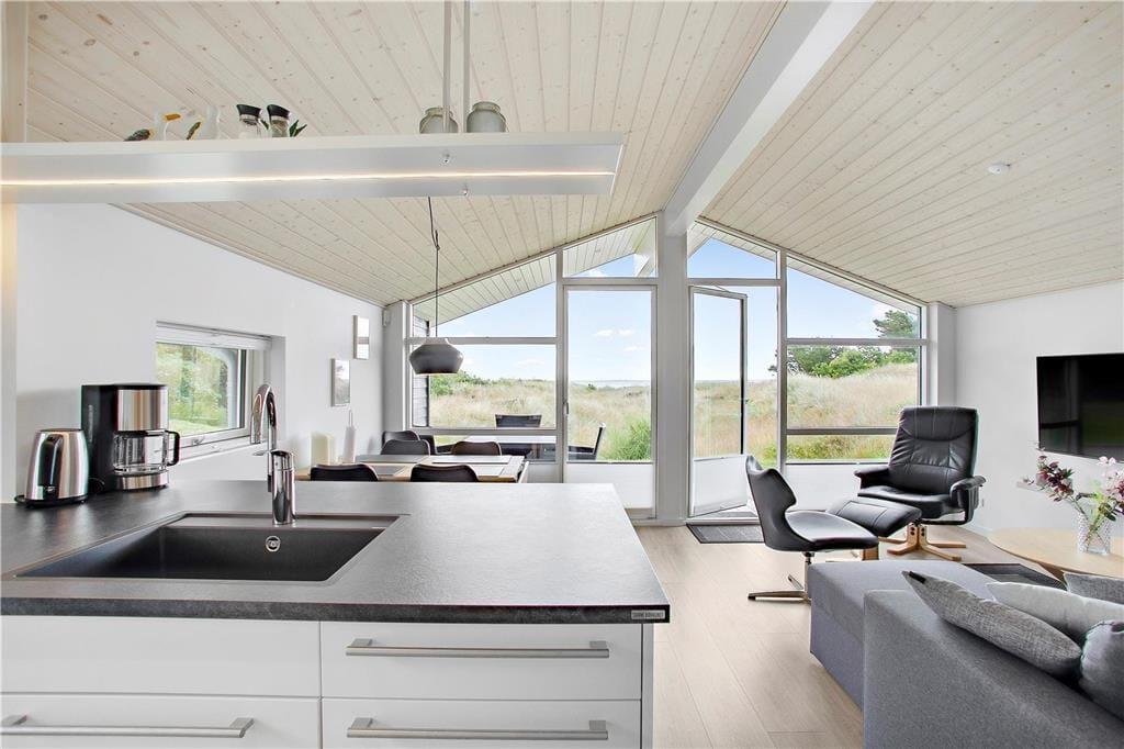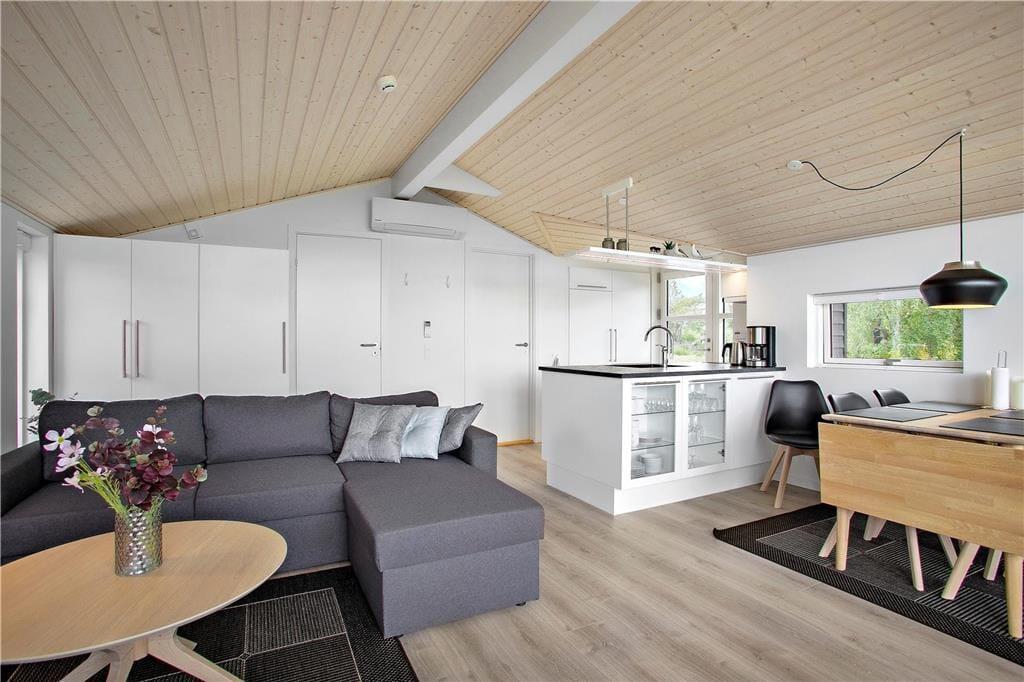Der er en lys og indbydende stemning i huset, der er indrettet med fokus på det hyggelige sommerhusliv. Stilen er lys og nordisk, og pladsen er rigtigt godt udnyttet. De mange vinduespartier trækker masser af naturligt lys ind i opholdsrummet, hvor stue og køkken ligger i åben forbindelse. Fra stuen er der også et fantastisk kig til vandet og det omgivende naturlandskab – og med direkte udgang til terrassen kan I på de lune sommerdage slå dørene op, så ude og inde på det nærmeste smelter sammen. Huset har et soveværelse med dobbeltseng, og herudover er der i stuen en sovesofa, så der er plads til fire overnattende gæster. Som ekstra komfort kan I glæde jer over, at huset er udstyret med både opvaskemaskine, vaskemaskine og tørretumbler.