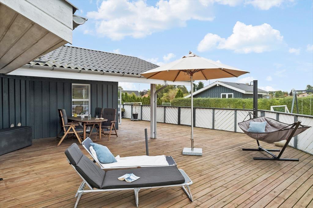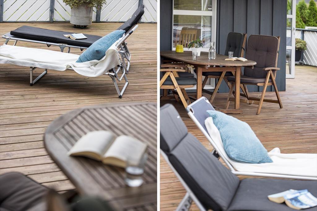 Når solen lokker jer ud i det fri, kan I nyde udelivet på den store grund. Bortset fra indkørslen og carporten er grunden indhegnet, så hvis I er hundeejere, kan I med ro i sindet slippe firbenede familiemedlemmer løs på græsplænen. Terrasser er der flere af, så I kan sætte jer lige der, hvor solforholdene er bedst – men mon ikke den kæmpestore sydvestvendte træterrasse hurtigt bliver favoritpladsen, når I vil solbade, grille og slappe af i rolige omgivelser.