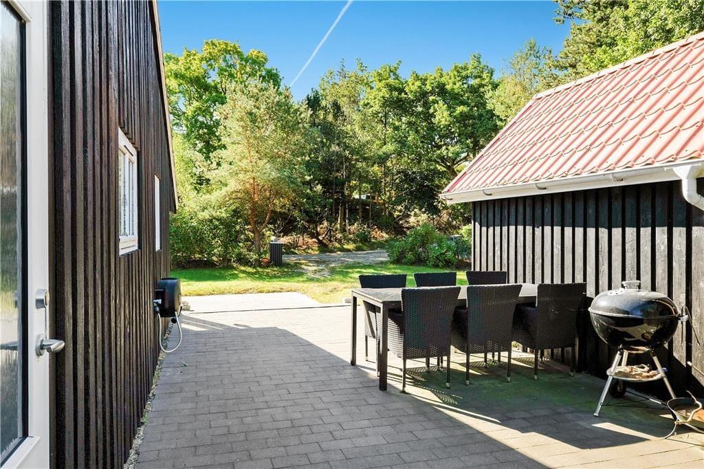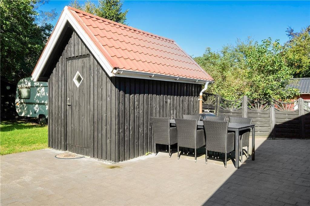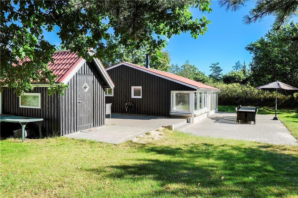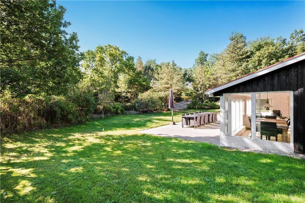 Når man ankommer til den fredfyldte grund, mærker man med det samme freden og roen sænke sig. Grunden er omkranset af høje træer og tæt beplantning, så man virkelig får oplevelsen af at være i sin egen private oase i sommerlandet. Rul et tæppe på græsplænen og lad dig varme igennem af sommersolen, eller slå dig ned i en liggestol på terrassen med en god krimi. På det store sammenhængende terrasseareal kan I servere frokost i det grønne og tænde op i grillen, når dagen går på hæld. Det er sommerhusliv, når det er bedst.