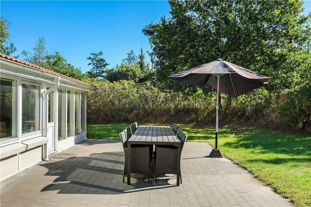 Ferieidyllen får fine betingelser i dette charmerende sommerhus med plads til 8 personer. Huset ligger på en stor afskærmet grund med skønne terrasser, og det tager blot tre minutter at gå ned til den dejlige sandstrand.
