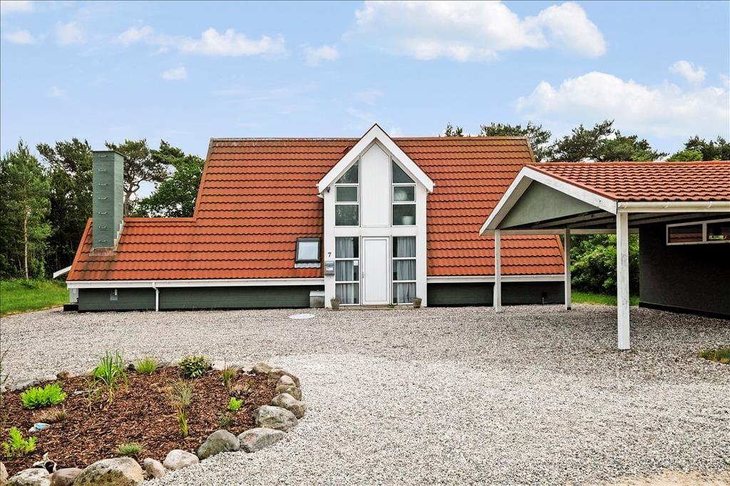 Fra et af førstesalens soveværelser har I direkte adgang til en overdækket altan. Det føles skønt at trække frisk luft og kigge ud i det grønne her, men hvis I vil have mere plads, kan I rykke ned på havens to terrasser, der begge skærmes af læhegn og er dejligt solrige. Haven er enkelt anlagt med græsplæne og randbeplantning, og foran huset er der carport og et bredt grusareal til parkering.