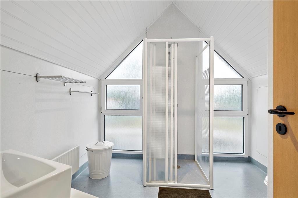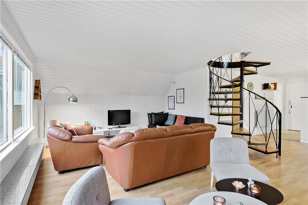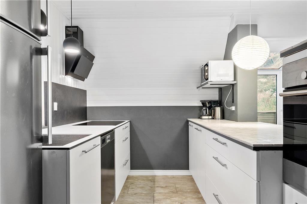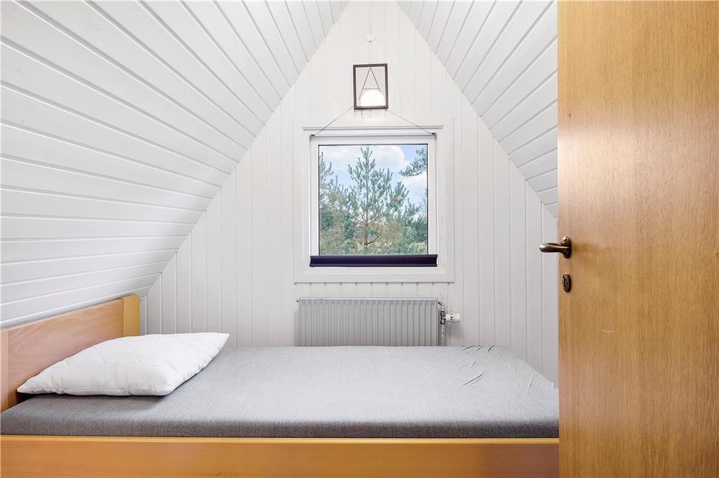 Modsat størstedelen af sommerhuse i det danske kystlandskab er dette fine eksemplar opført i to plan. Det giver jer i alt 129 m2 at brede jer på inden døre, hvilket også betyder, at I med ro i sindet kan invitere bedsteforældrene eller gode venner med på ferie. Tre af husets fire soveværelser er placeret på førstesalen, og der er badeværelse både oppe og nede, så I ikke skal stå i kø for at få et brusebad om morgenen. Alle rum fremstår pæne og velholdte – også det store opholdsrum, hvor køkken og stue ligger samlet. Atmosfæren er let og luftig, for farvetonerne er lyse, og store vinduespartier inviterer solen ind fra både syd og vest. Som en praktisk detalje er der vaskemaskine på badeværelset, hvis I skal have vasket sommertøj og håndklæder efter badeturen.