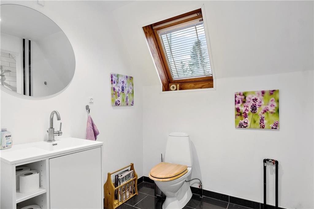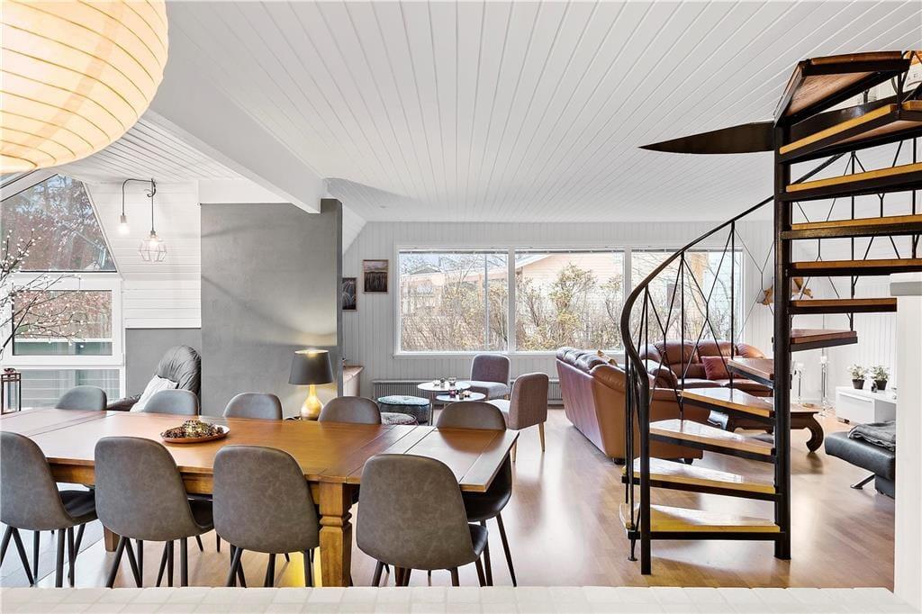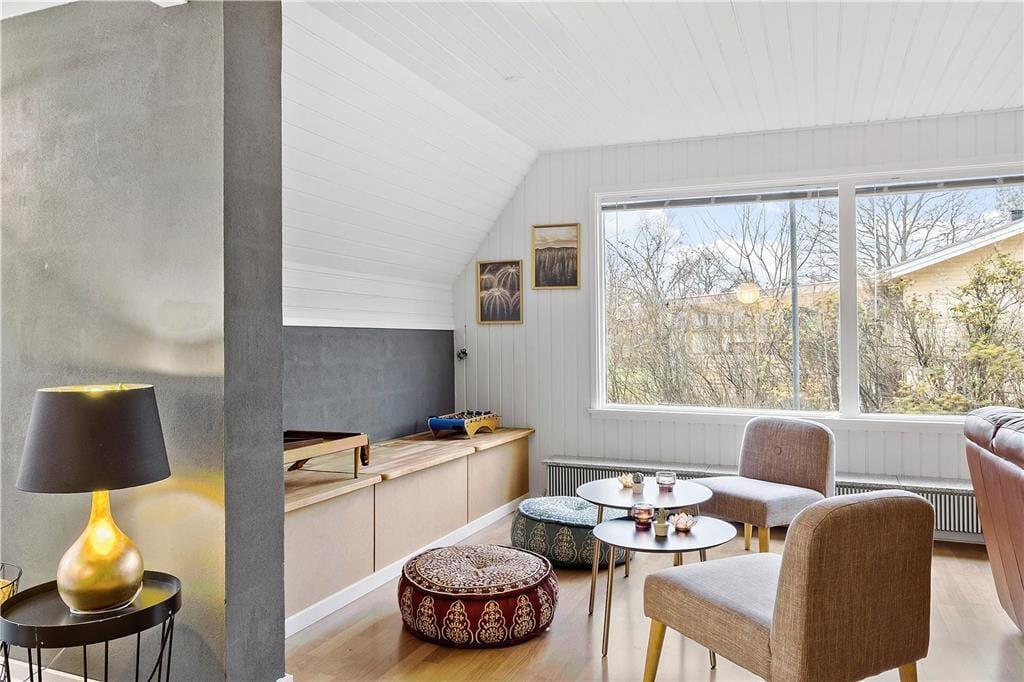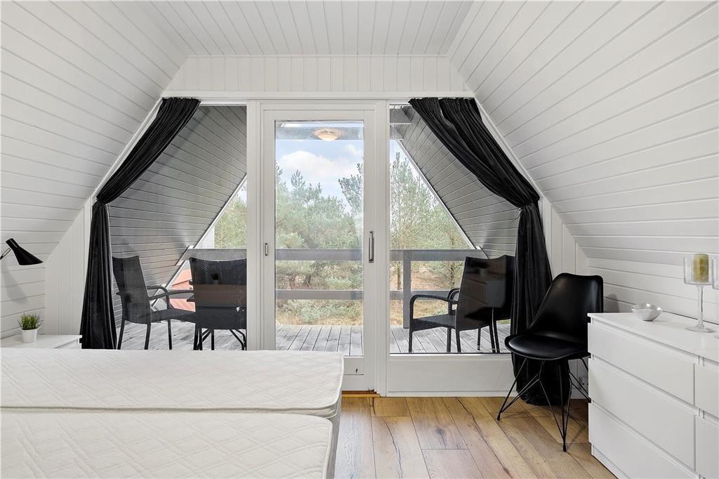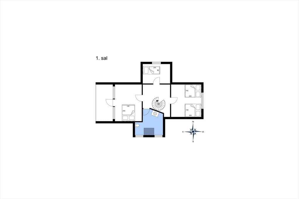 Modsat størstedelen af sommerhuse i det danske kystlandskab er dette fine eksemplar opført i to plan. Det giver jer i alt 129 m2 at brede jer på inden døre, hvilket også betyder, at I med ro i sindet kan invitere bedsteforældrene eller gode venner med på ferie. Tre af husets fire soveværelser er placeret på førstesalen, og der er badeværelse både oppe og nede, så I ikke skal stå i kø for at få et brusebad om morgenen. Alle rum fremstår pæne og velholdte – også det store opholdsrum, hvor køkken og stue ligger samlet. Atmosfæren er let og luftig, for farvetonerne er lyse, og store vinduespartier inviterer solen ind fra både syd og vest. Som en praktisk detalje er der vaskemaskine på badeværelset, hvis I skal have vasket sommertøj og håndklæder efter badeturen.